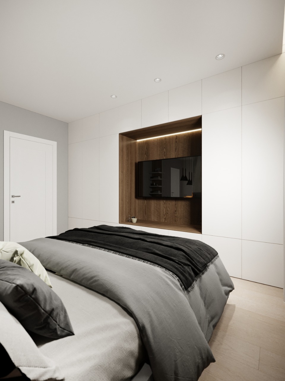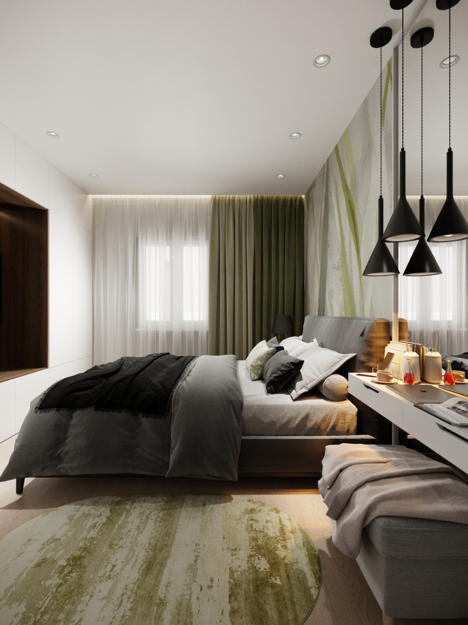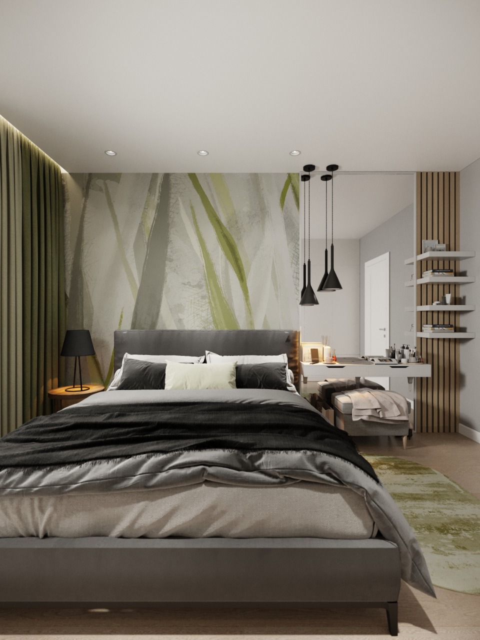 Это спальня из проекта частного дома. Украшением стали бесшовные обои из коллекции «Alive». Широкие мазки, спокойные тона и растительные мотивы — что может быть лучше для искателей умиротворения? Эта удивительная коллекция дарит дому покой и гармонию.
