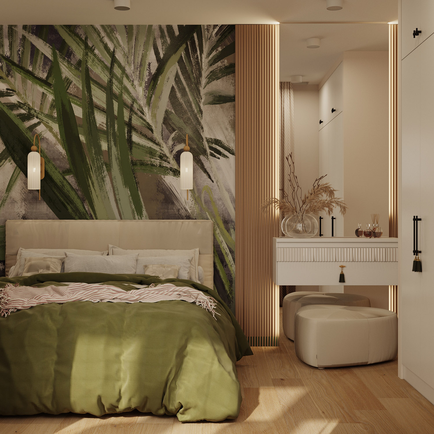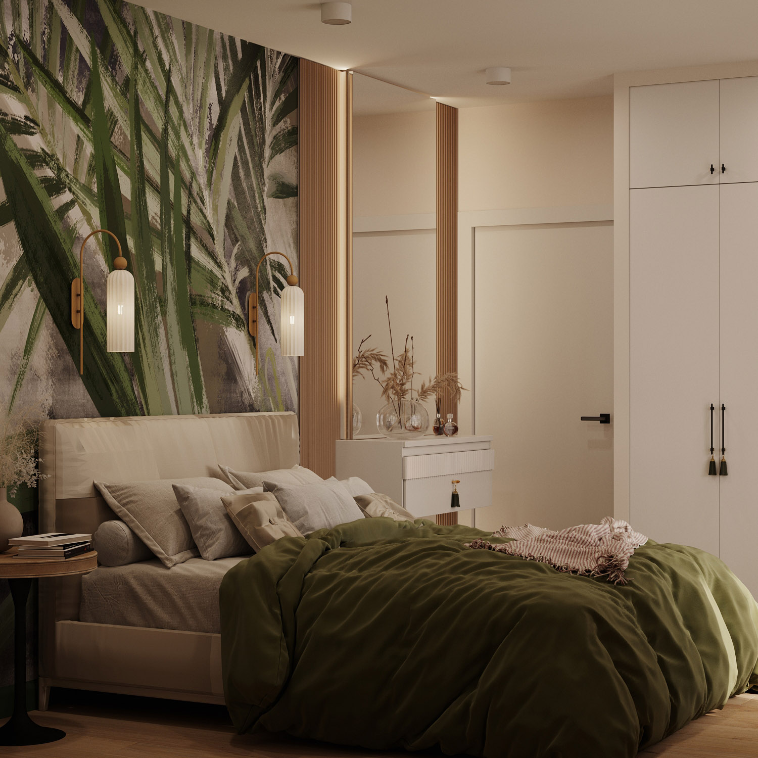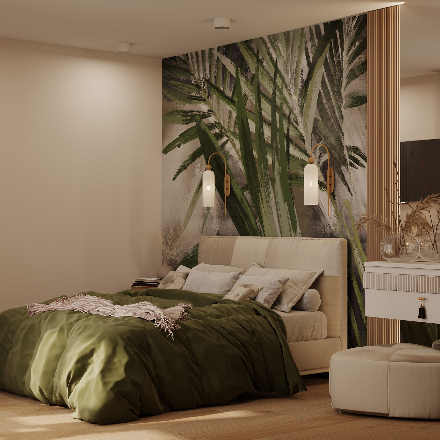 Проект спальни в г. Тула. Обои из коллекции «Alive» стали ярким акцентом, добавив зеленые нотки в это уютное пространство.