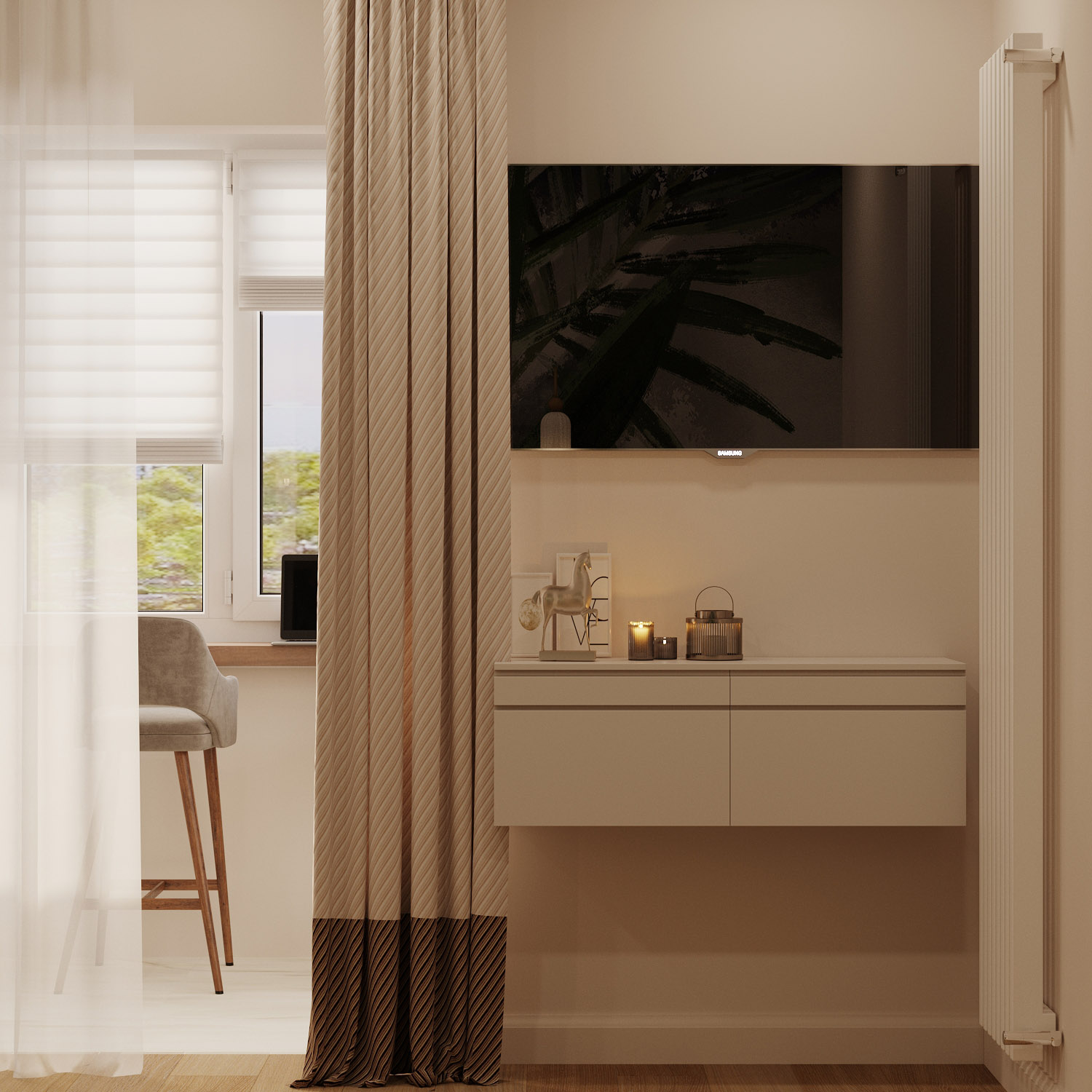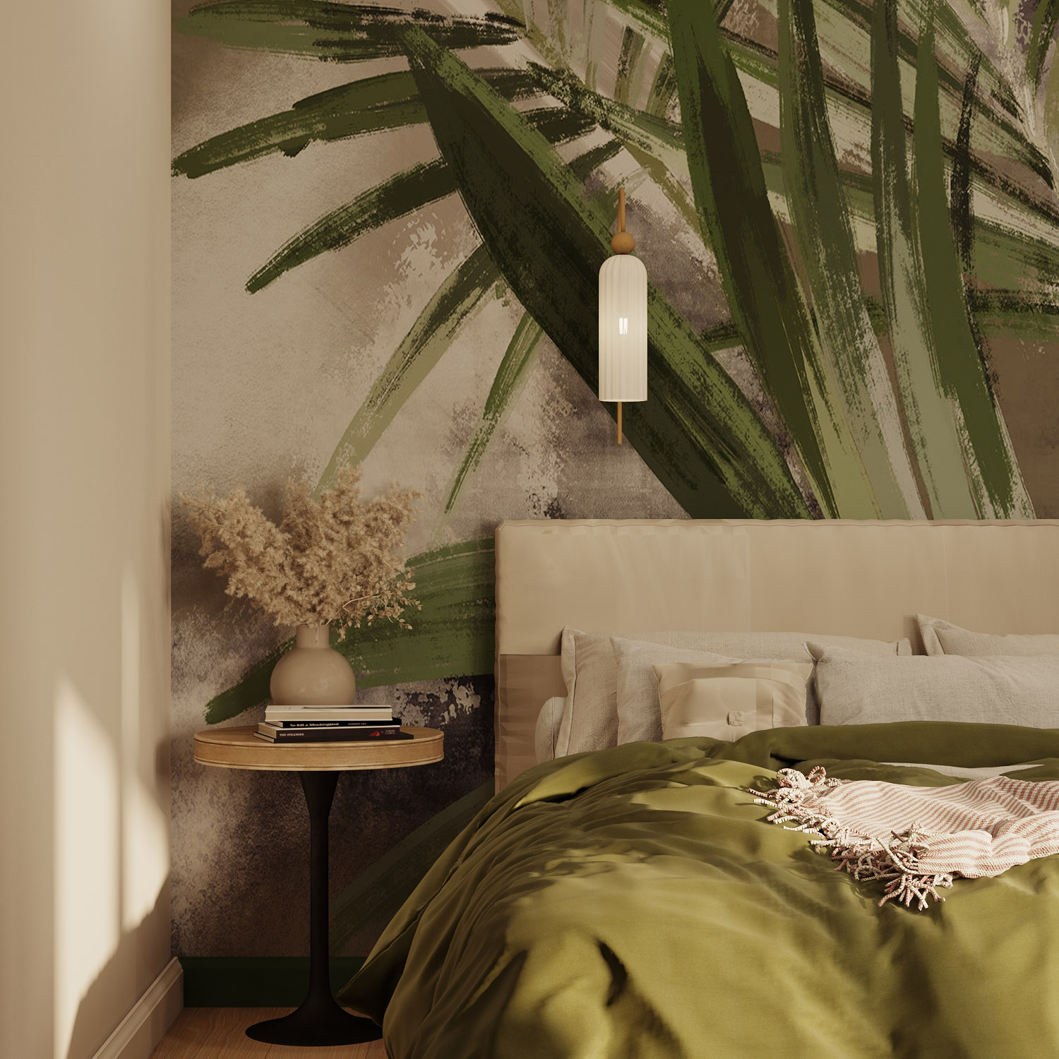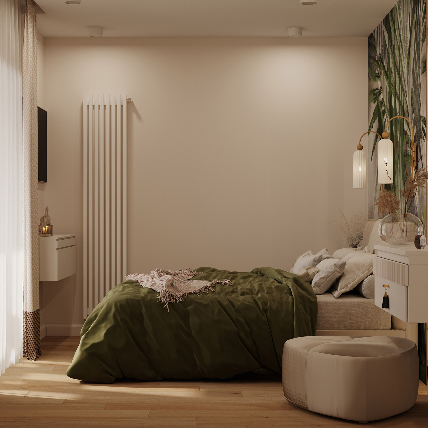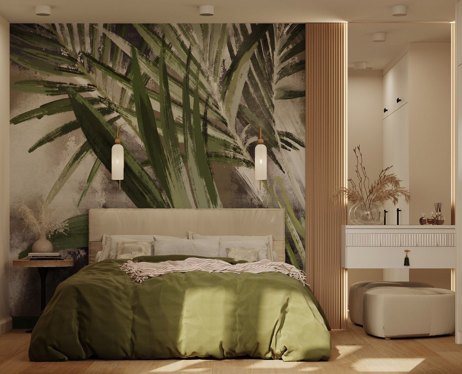 Проект спальни в г. Тула. Обои из коллекции «Alive» стали ярким акцентом, добавив зеленые нотки в это уютное пространство.