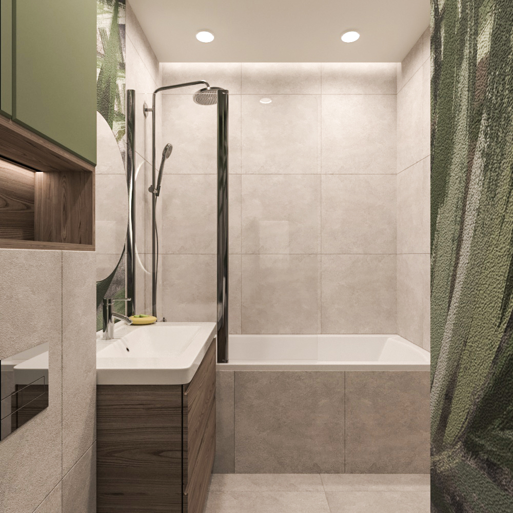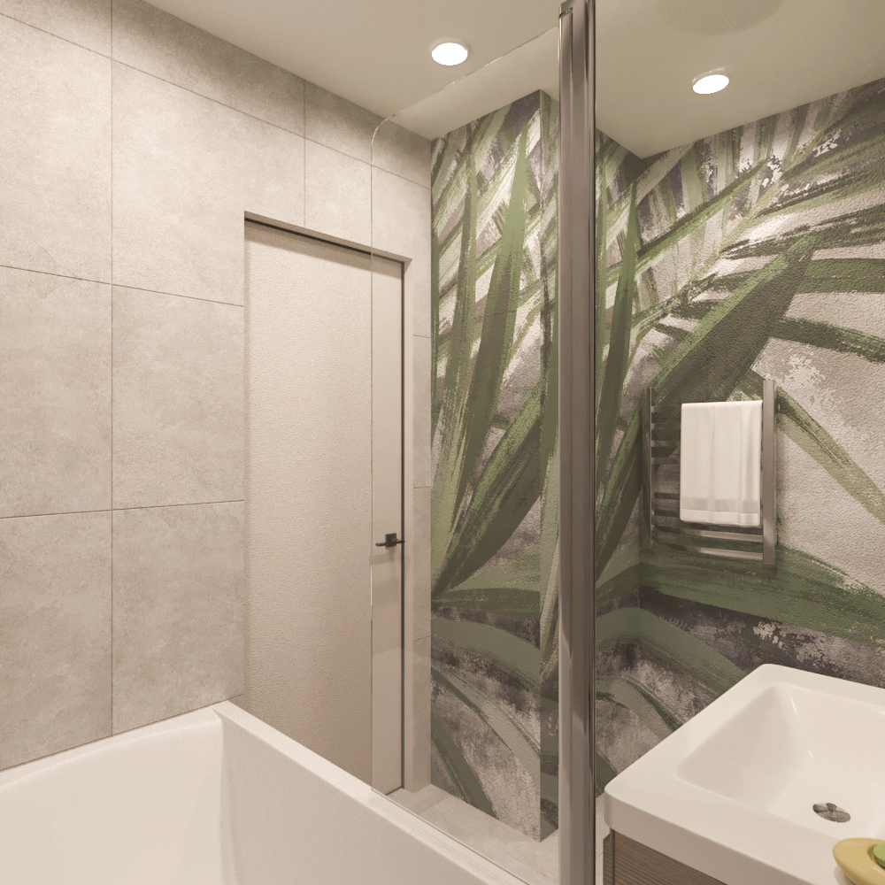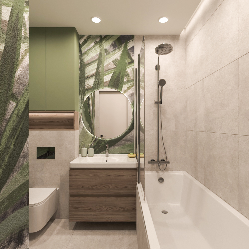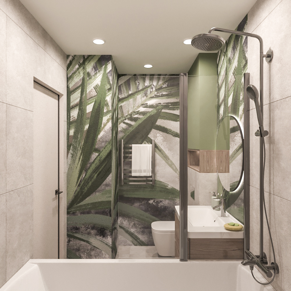 Санузел для молодой девушки в г. Санкт-Петербург. Заказчица предпочитает природные мотивы и стиль бохо в интерьере. Санузел выполнен в светлых тонах с дополнением обоев с растительными мотивами и зеленого цвета, который девушка очень любит.