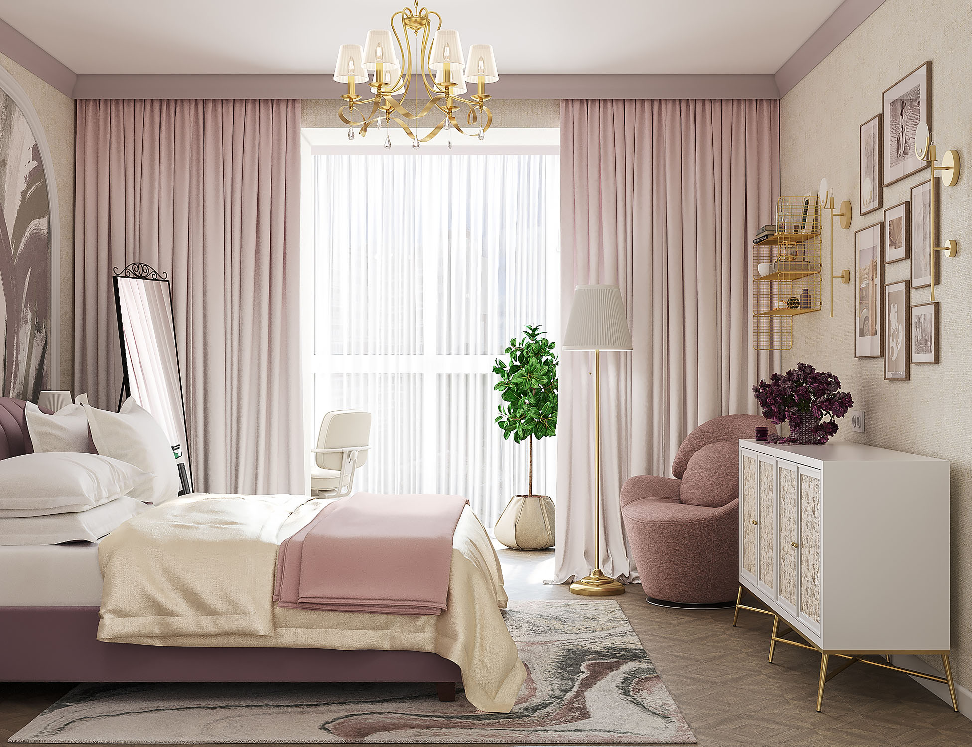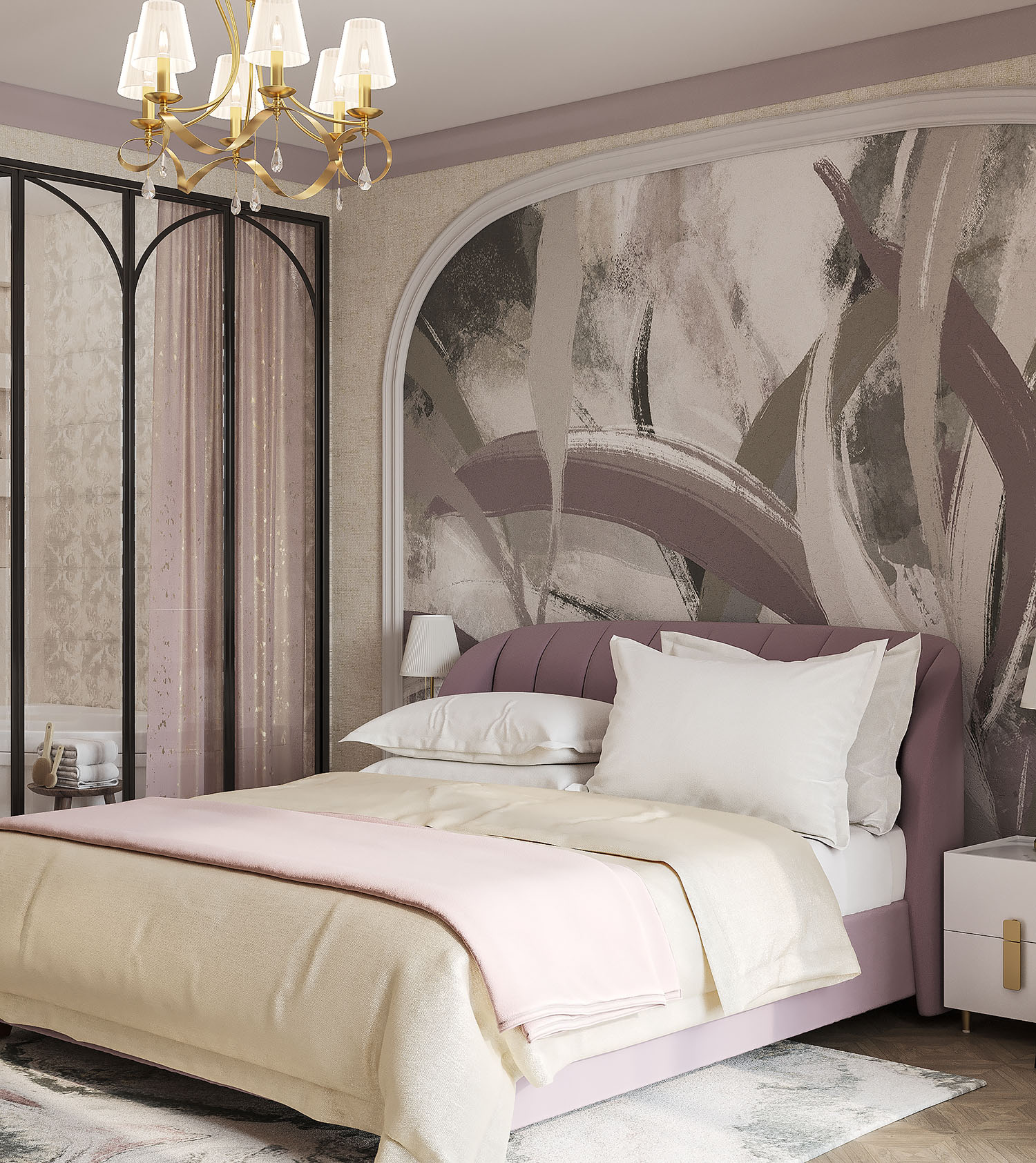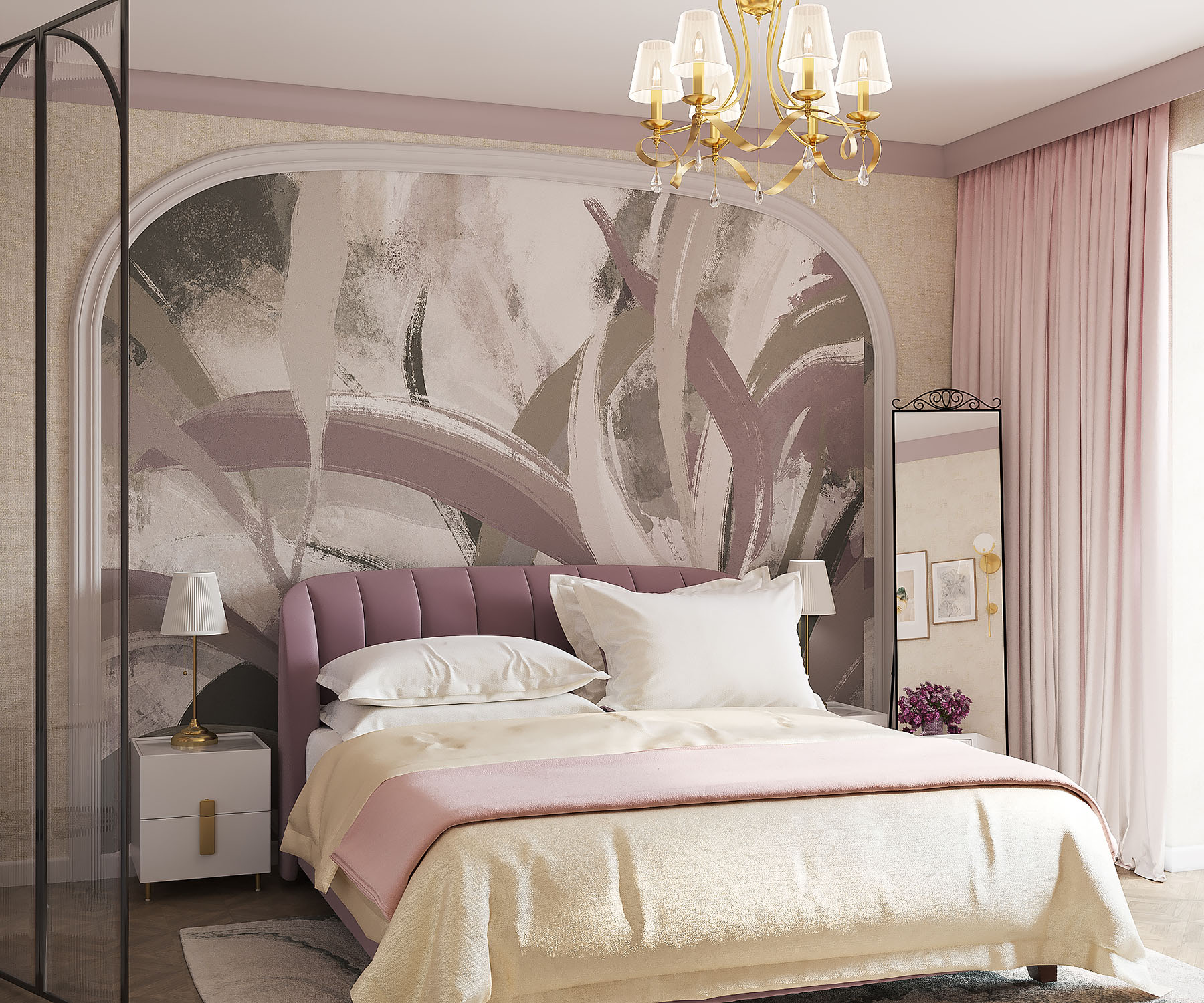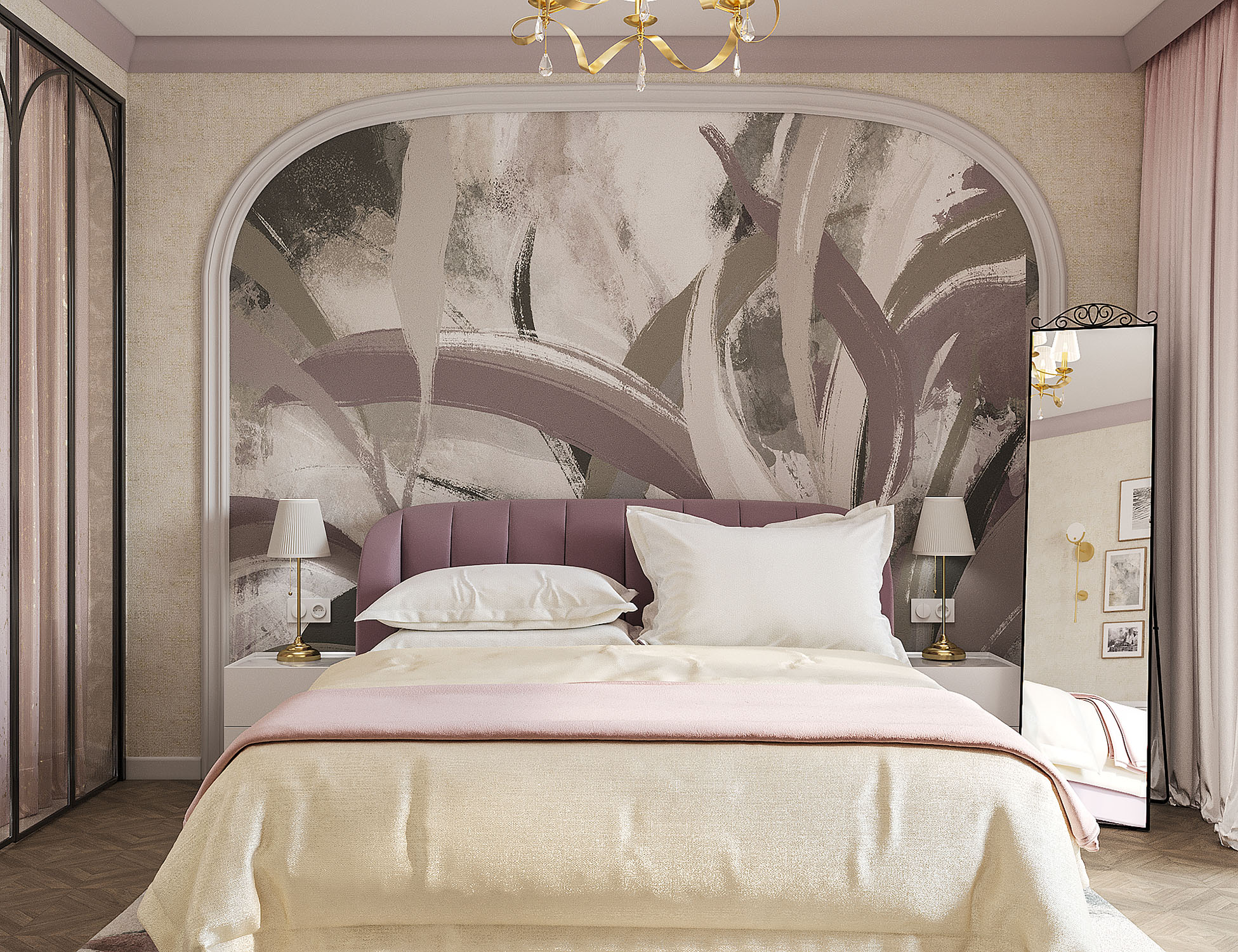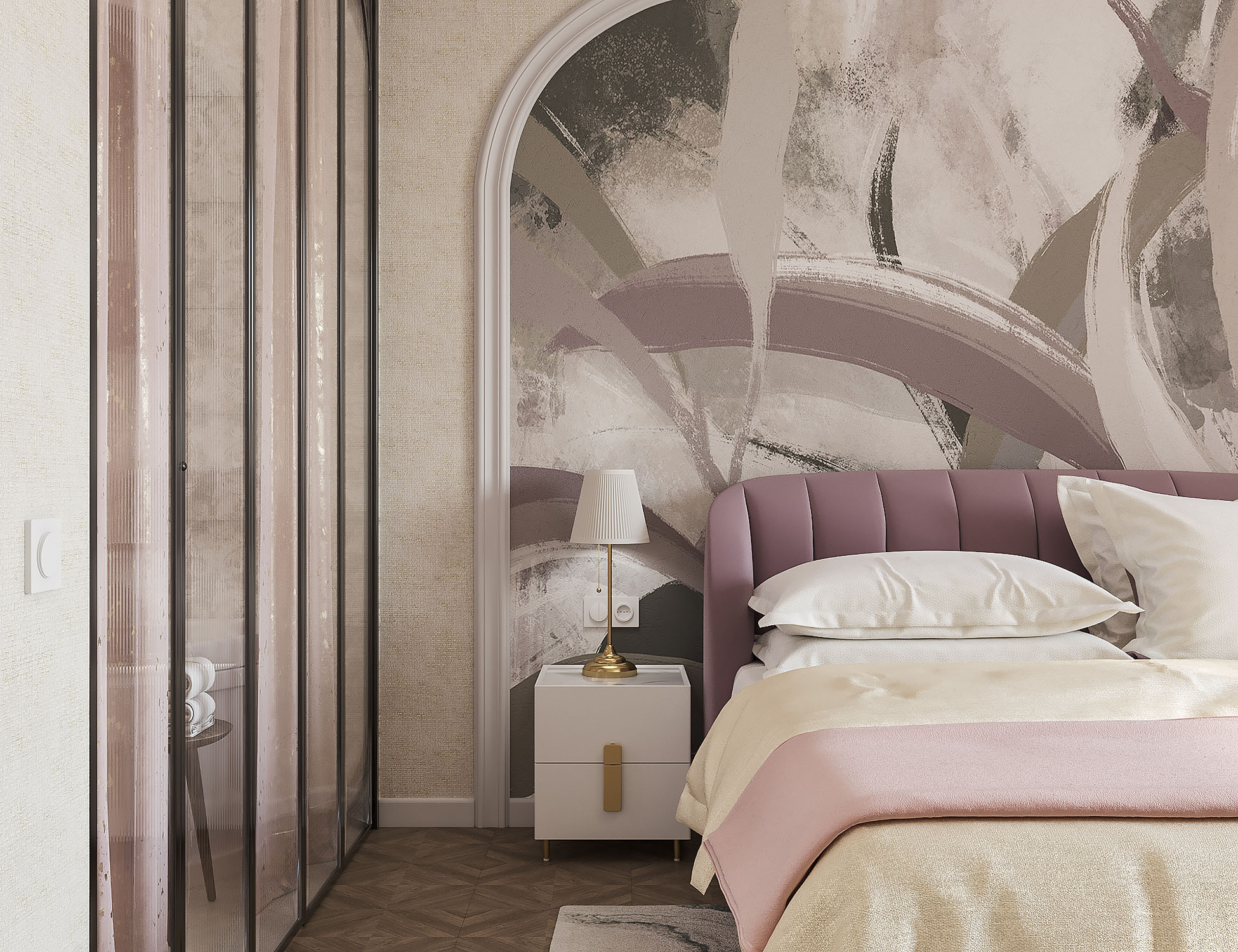 Дизайн спальни для молодой пары. Изголовье кровати украсила фреска из коллекции Alive. Широкие мазки, спокойные тона и растительные мотивы — что может быть лучше для искателей умиротворения? Подарите себе покой и гармонию, воплощённую в этой удивительной коллекции!