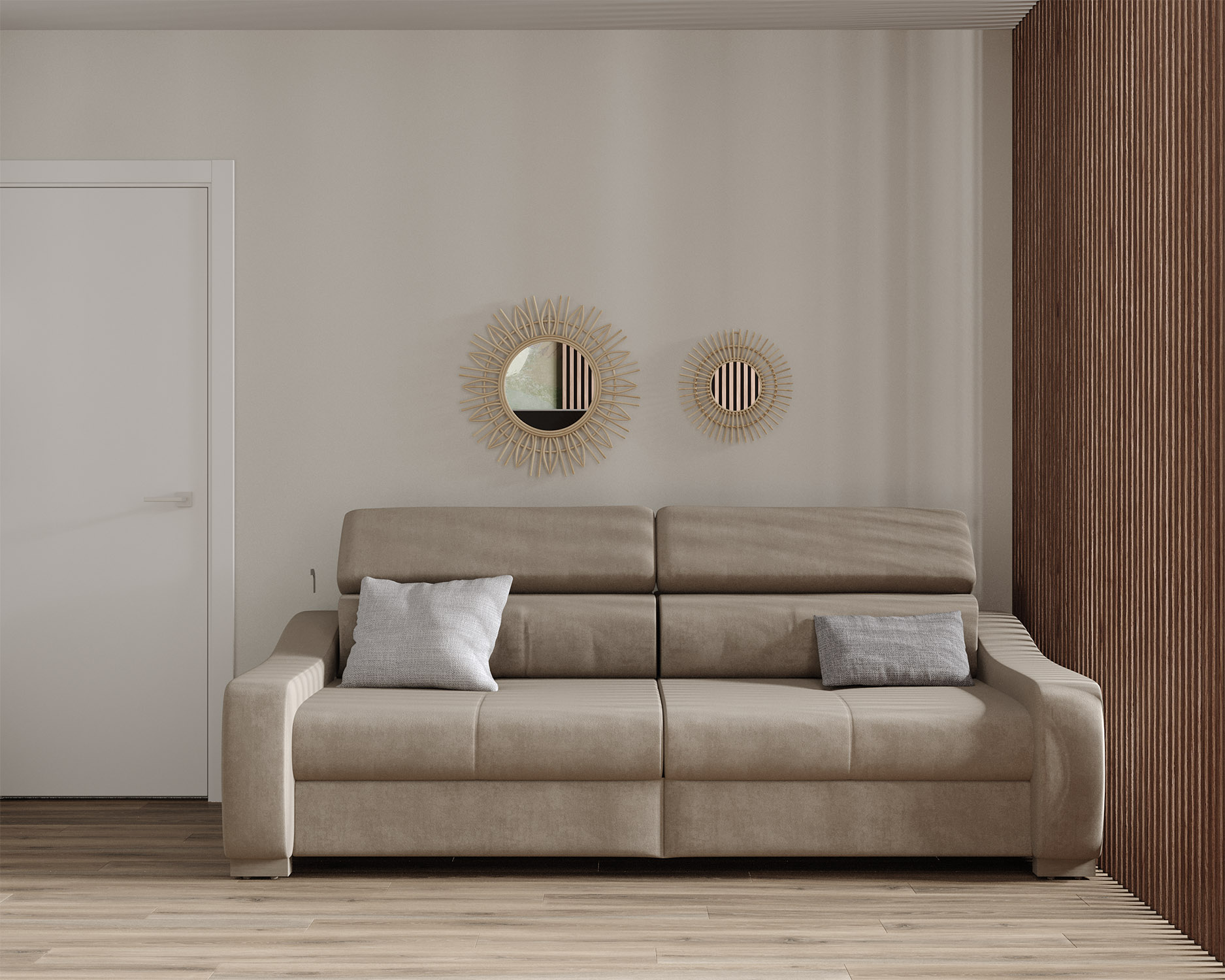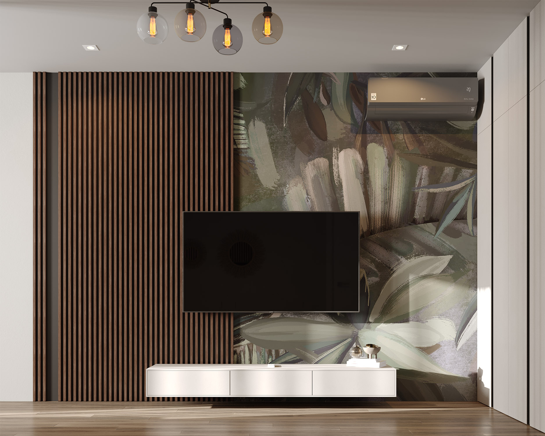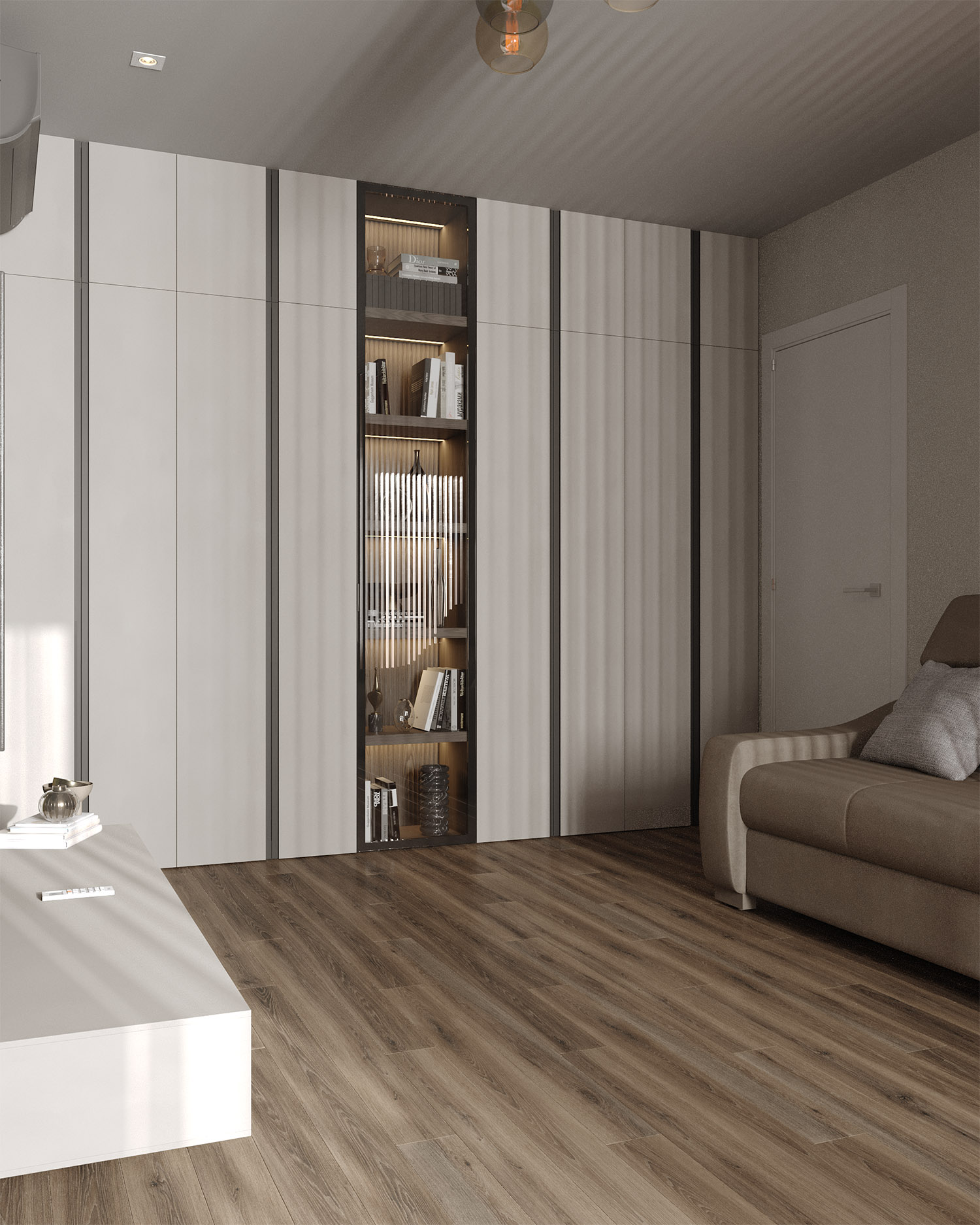 Проект двухкомнатной квартиры для семьи с ребенком. Одну комнату отдали под детскую, а во вторую зонировали с помощью реек и обоев на спальню и гостиную. Обои выбрали из коллекции «Alive».