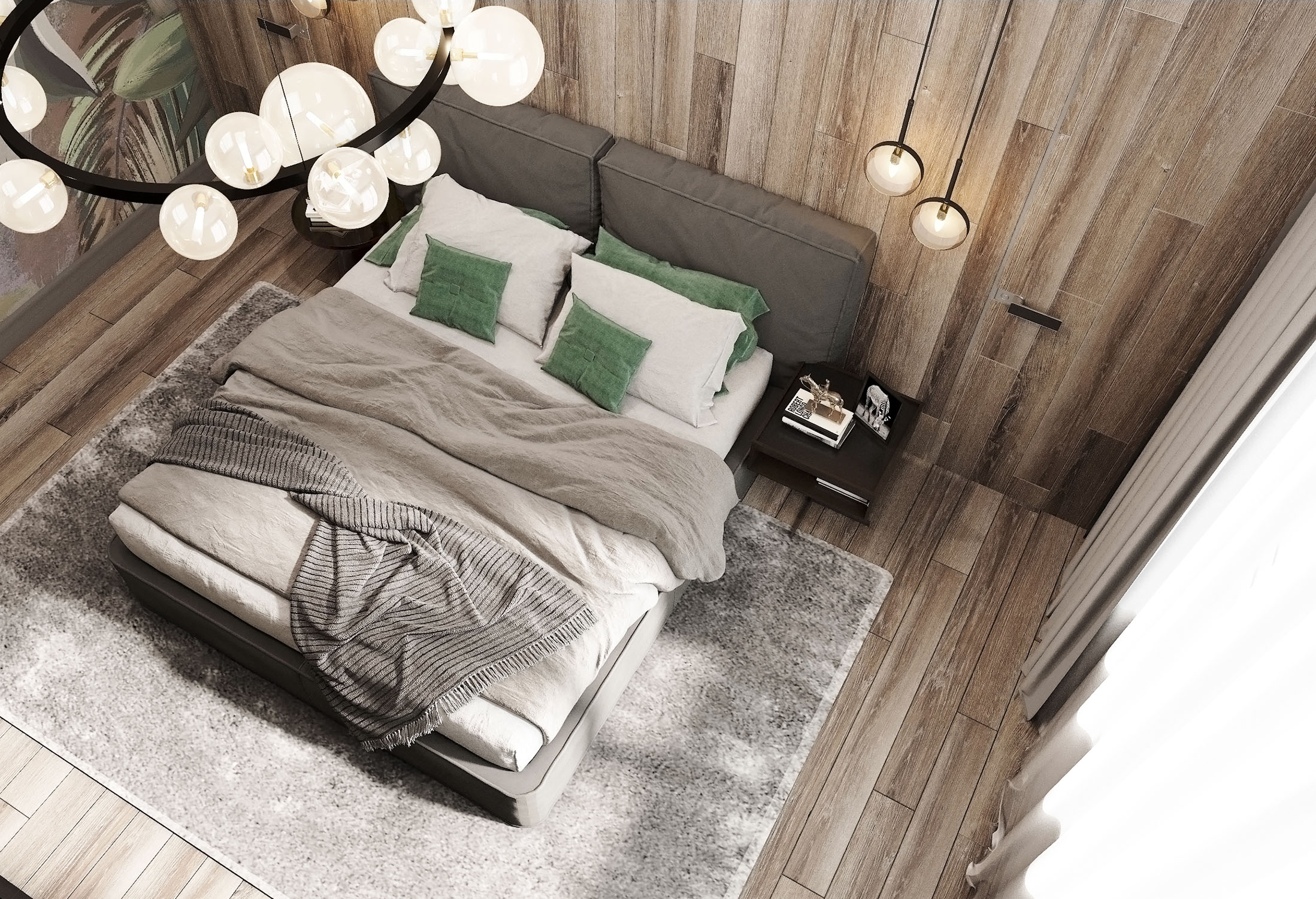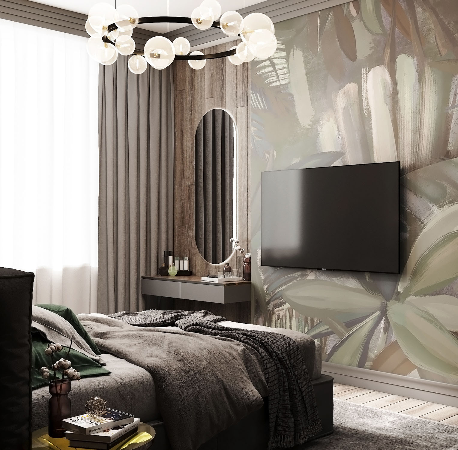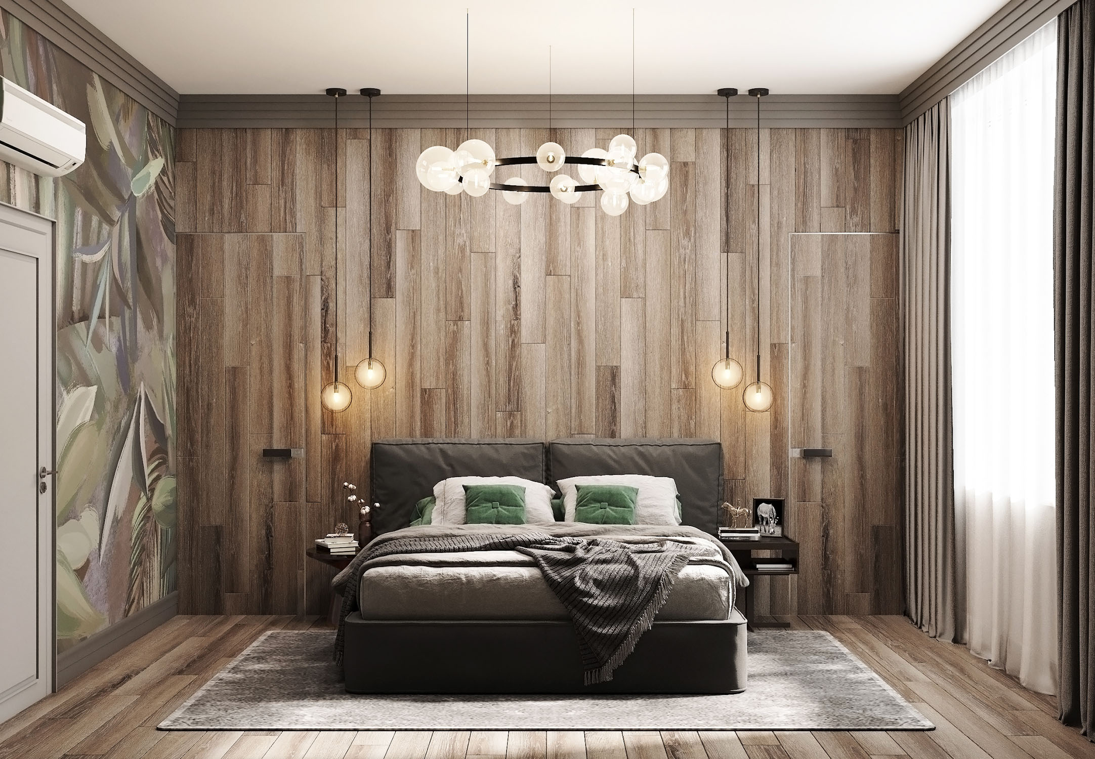 Дизайн спальни для молодой семьи в г. Ставрополь. Основным пожеланием заказчиков было добиться ощущения уюта и тепла. Сочетание фактуры дерева и фрески с изображением тропической растительности позволили нам воссоздать атмосферу экоотеля где-нибудь в тропиках. Предложение зашло на ура!