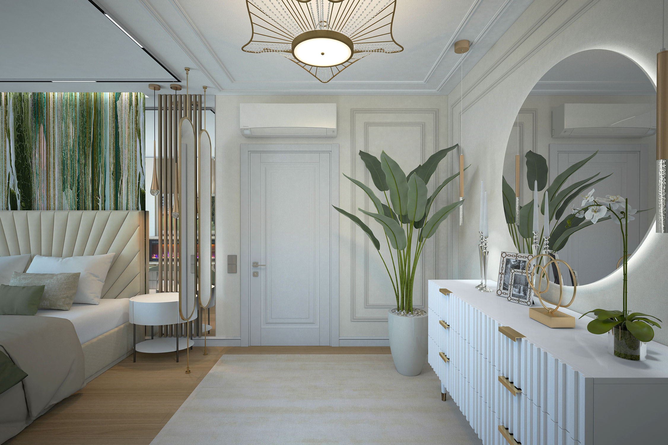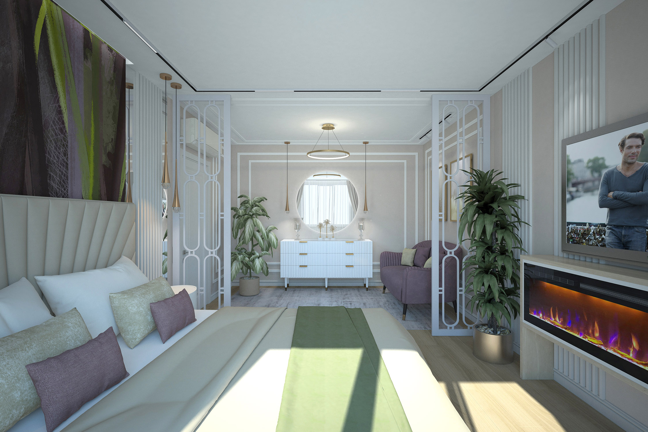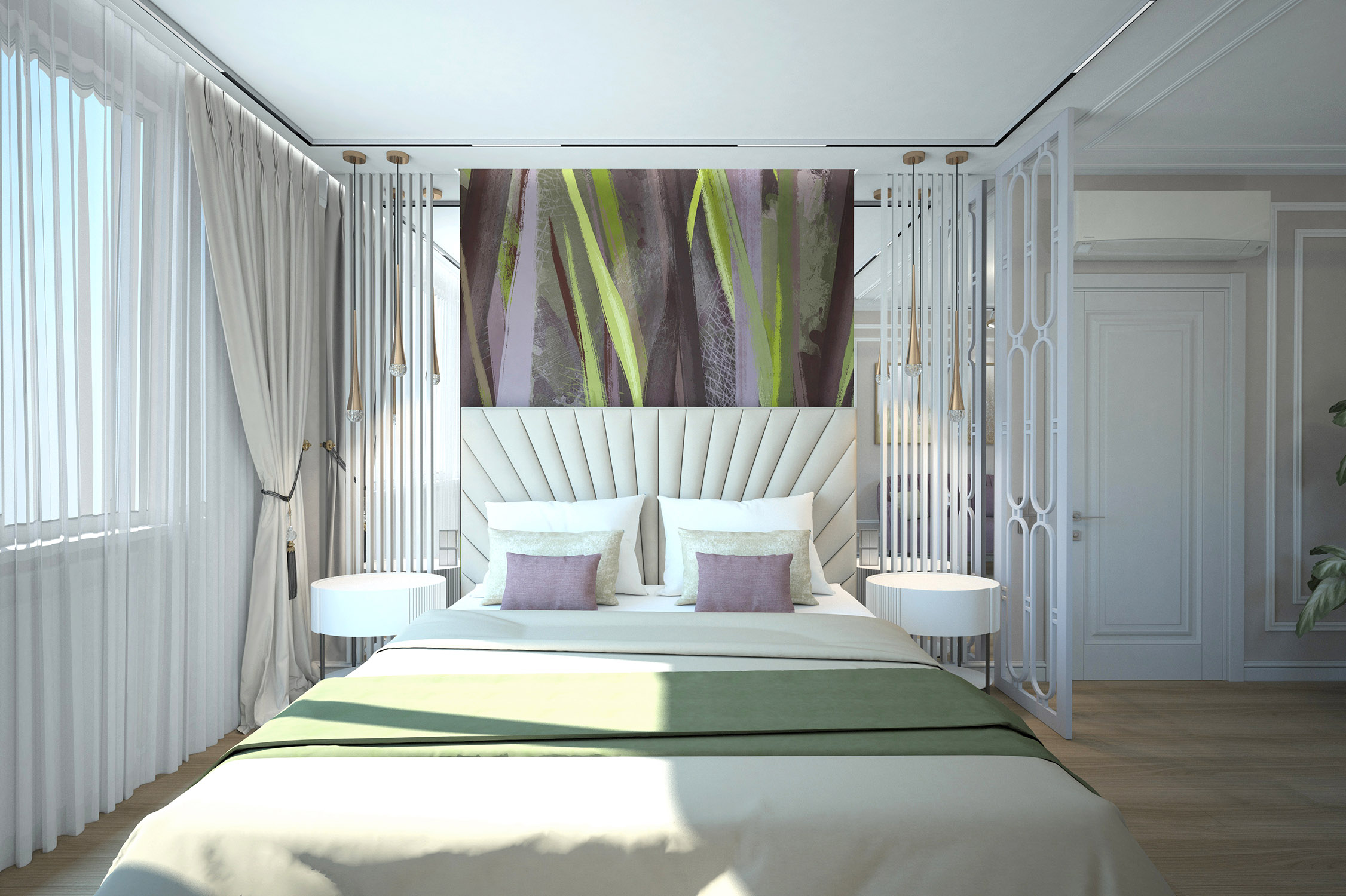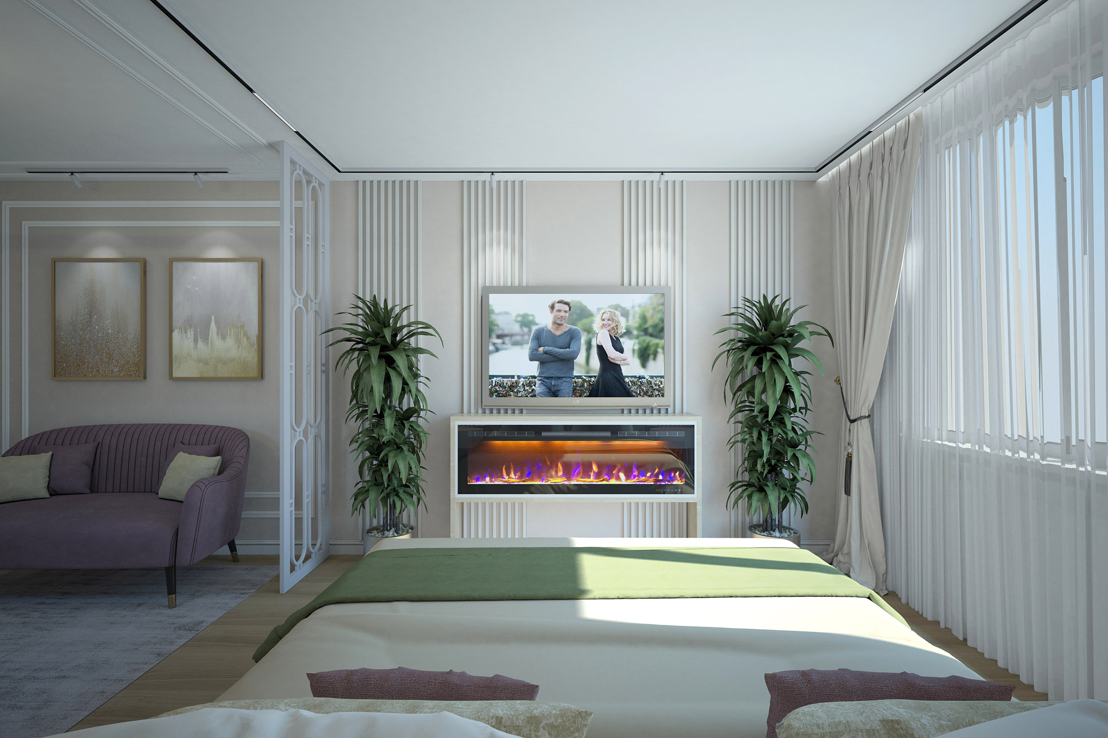 Это спальня родителей, как теперь принято называть Мастер-спальня. Дизайнеру приглянулись 2 варианта фресок — «Alive» и «FLArt». Так и появилось 2 варианта спальни. Второй более холодный вариант (учитывая тональность фрески), поэтому здесь был выбран белый цвет в декоративных деталях (буазери на стенах, фигурная МДФ перегородка, планки на стене и зеркалах). Однако присутствуют и теплые оттенки - это камин. Также была добавлена зелень, она привносит немного свежести и уравновешивает помещение по тональности.