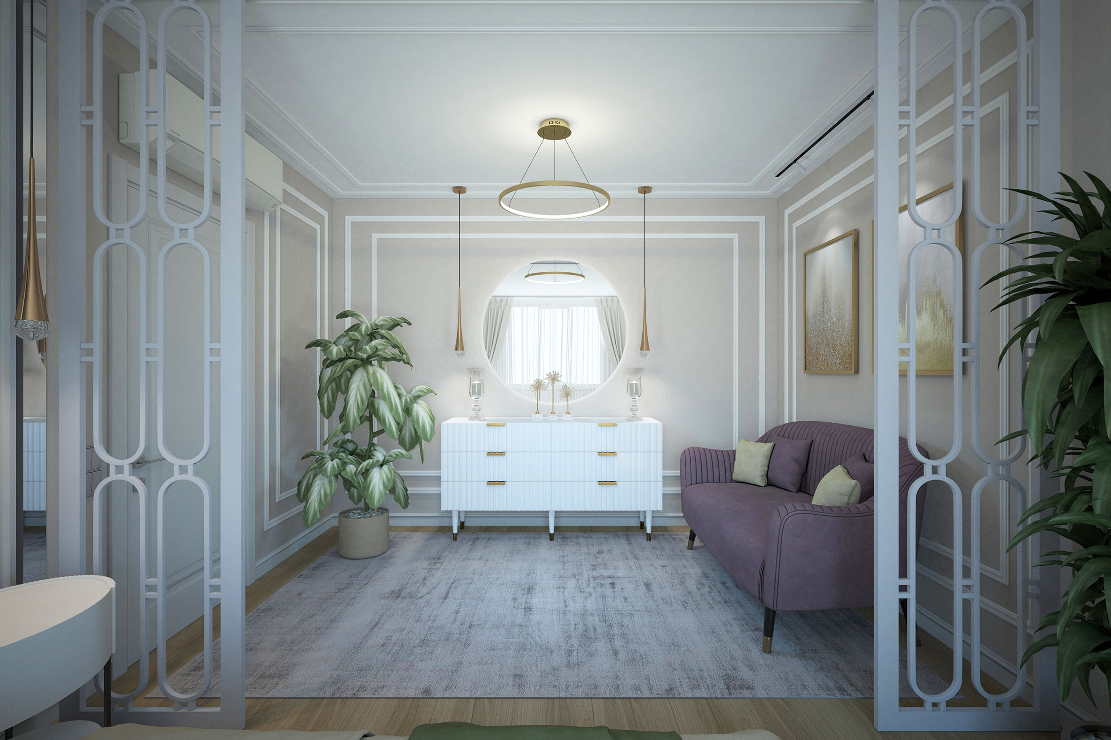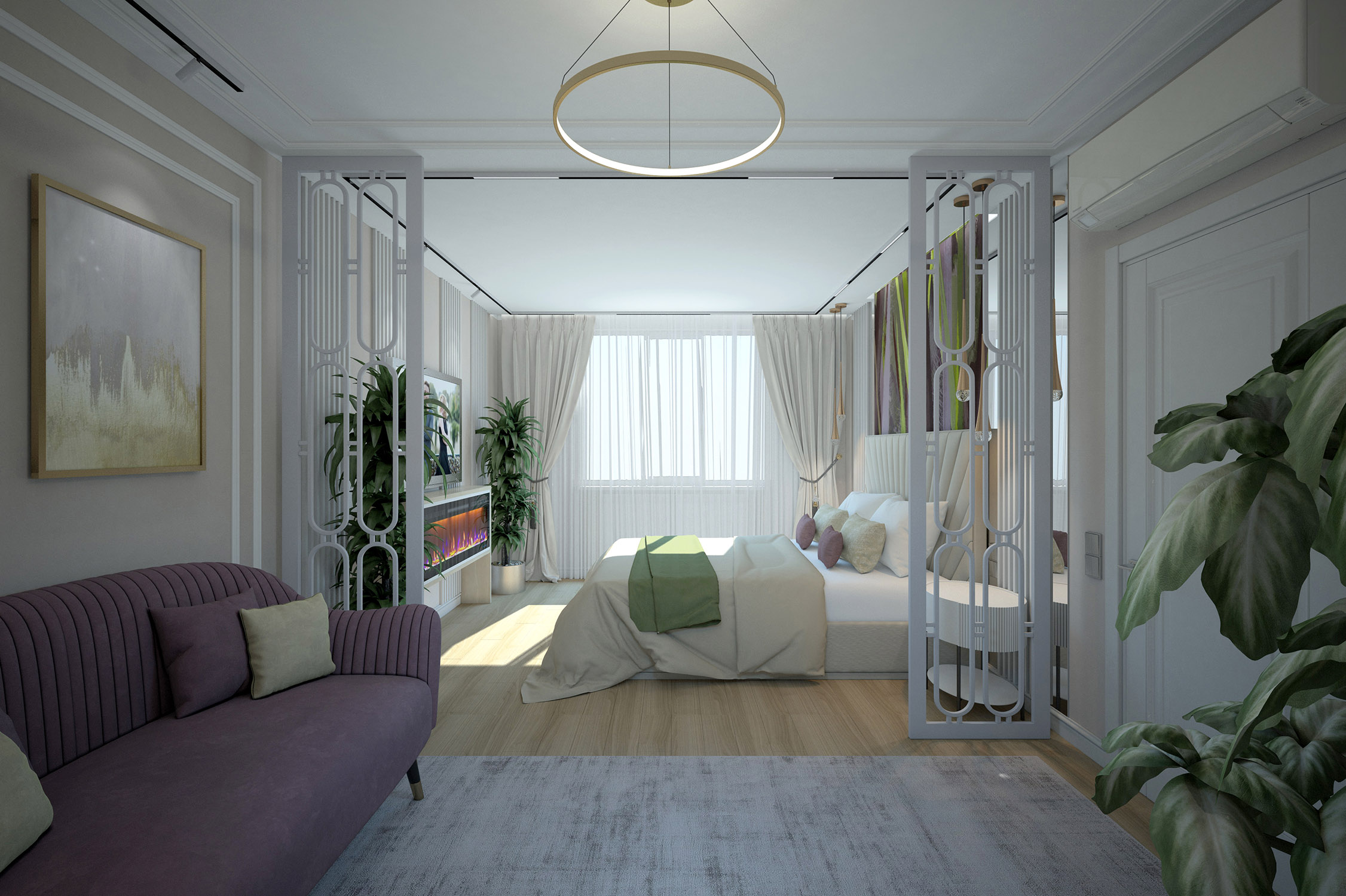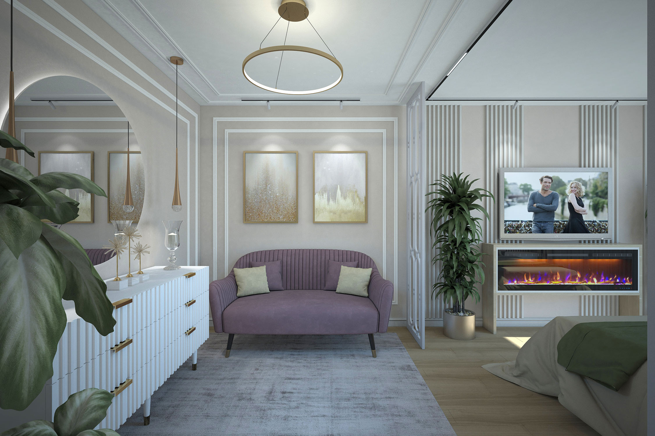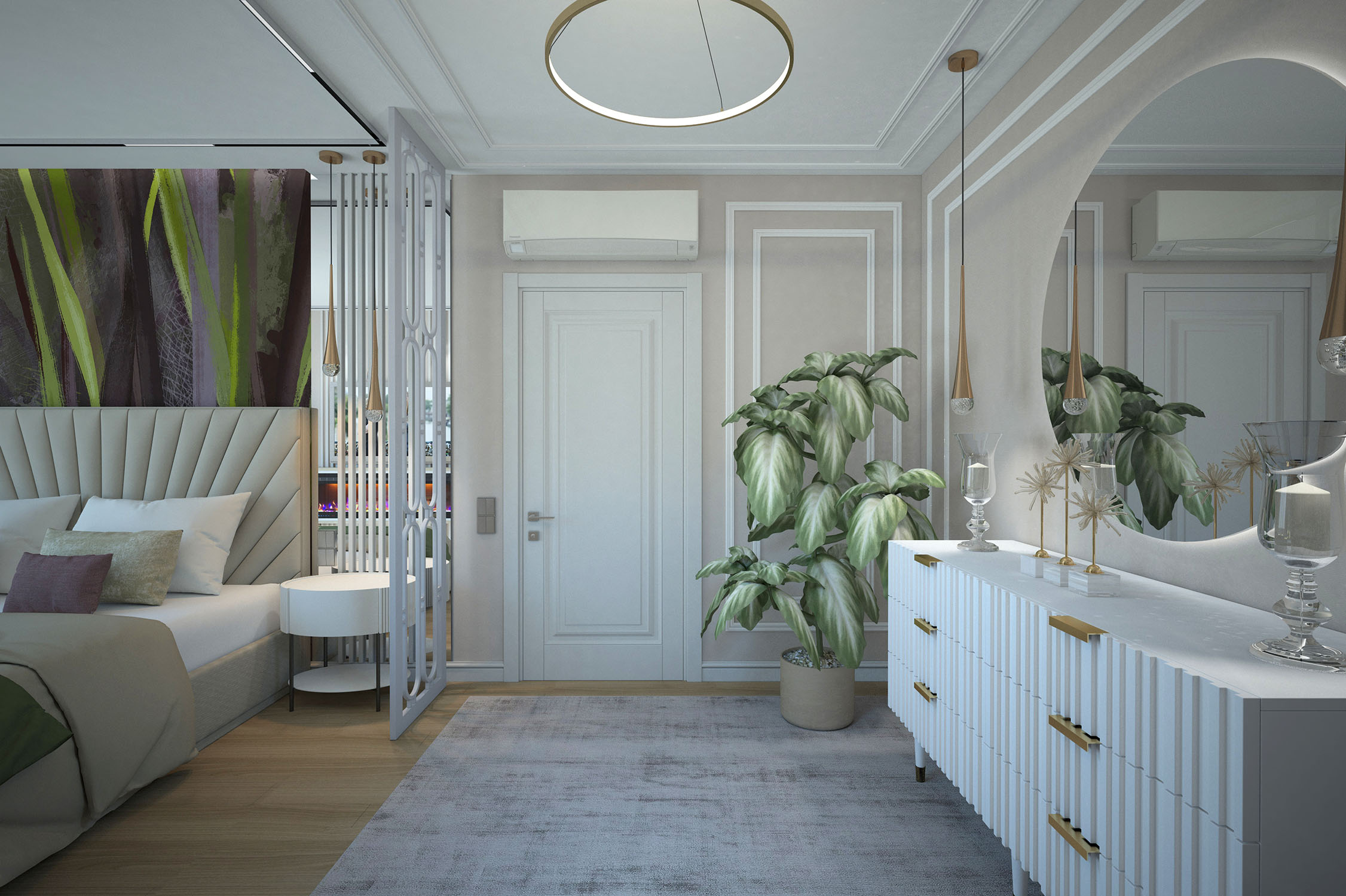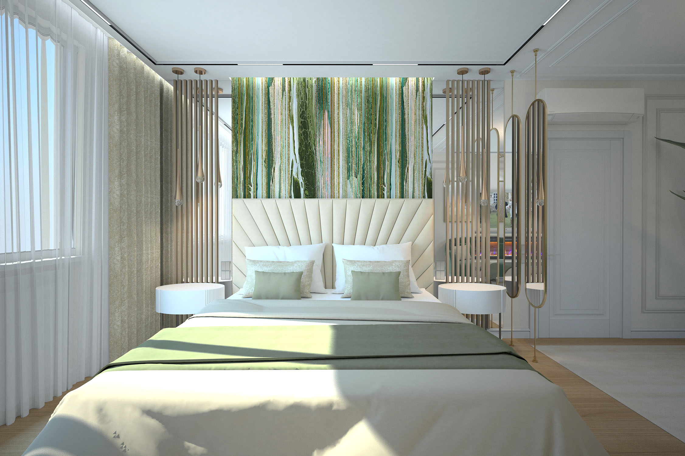 Это спальня родителей, как теперь принято называть Мастер-спальня. Дизайнеру приглянулись 2 варианта фресок — «Alive» и «FLArt». Так и появилось 2 варианта спальни. Второй более холодный вариант (учитывая тональность фрески), поэтому здесь был выбран белый цвет в декоративных деталях (буазери на стенах, фигурная МДФ перегородка, планки на стене и зеркалах). Однако присутствуют и теплые оттенки - это камин. Также была добавлена зелень, она привносит немного свежести и уравновешивает помещение по тональности.