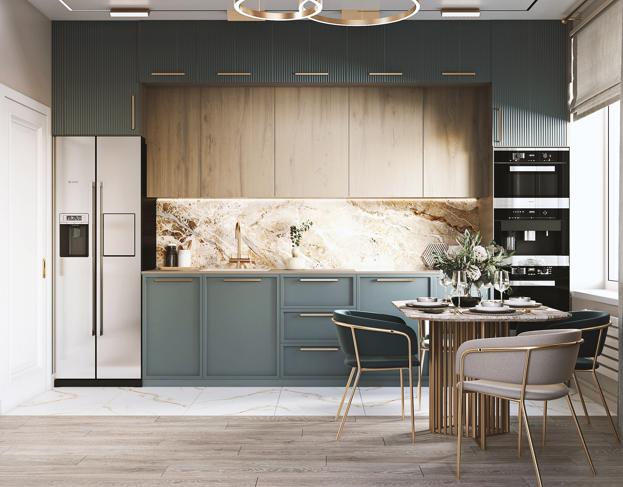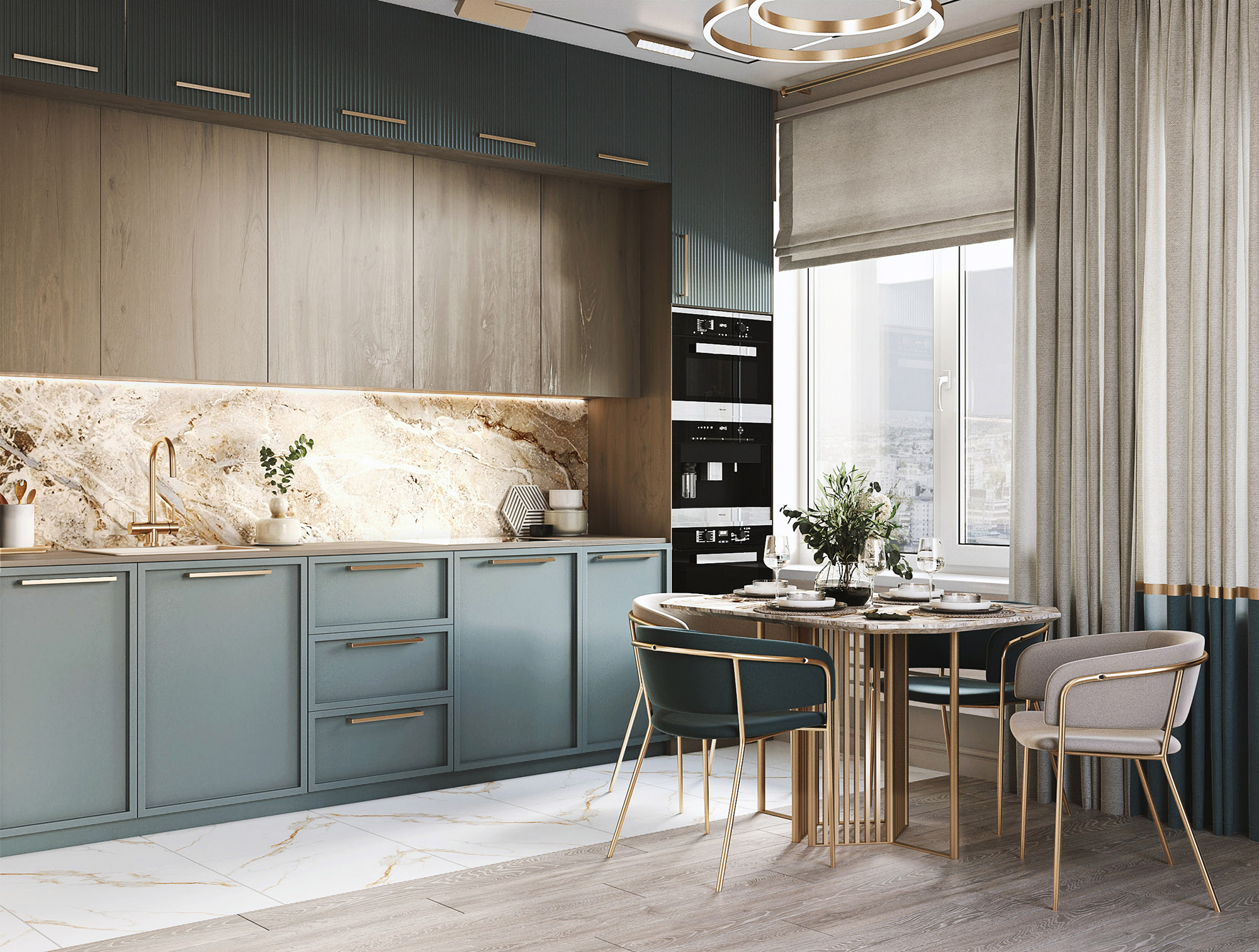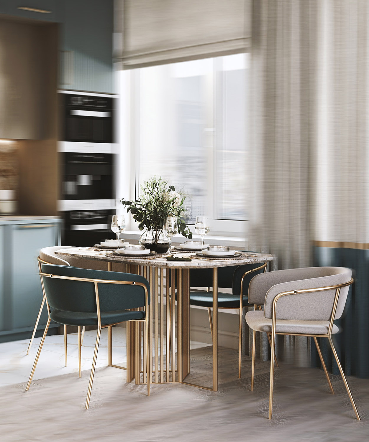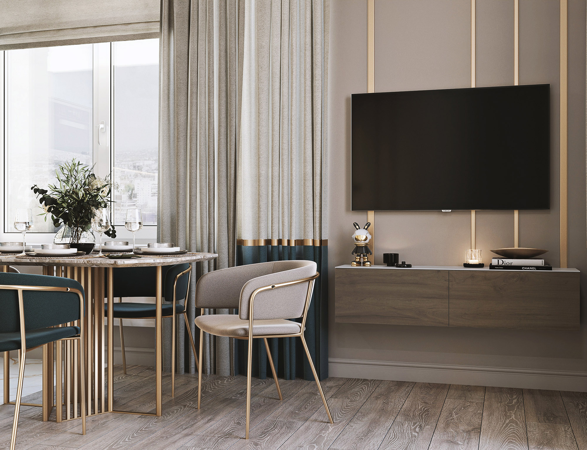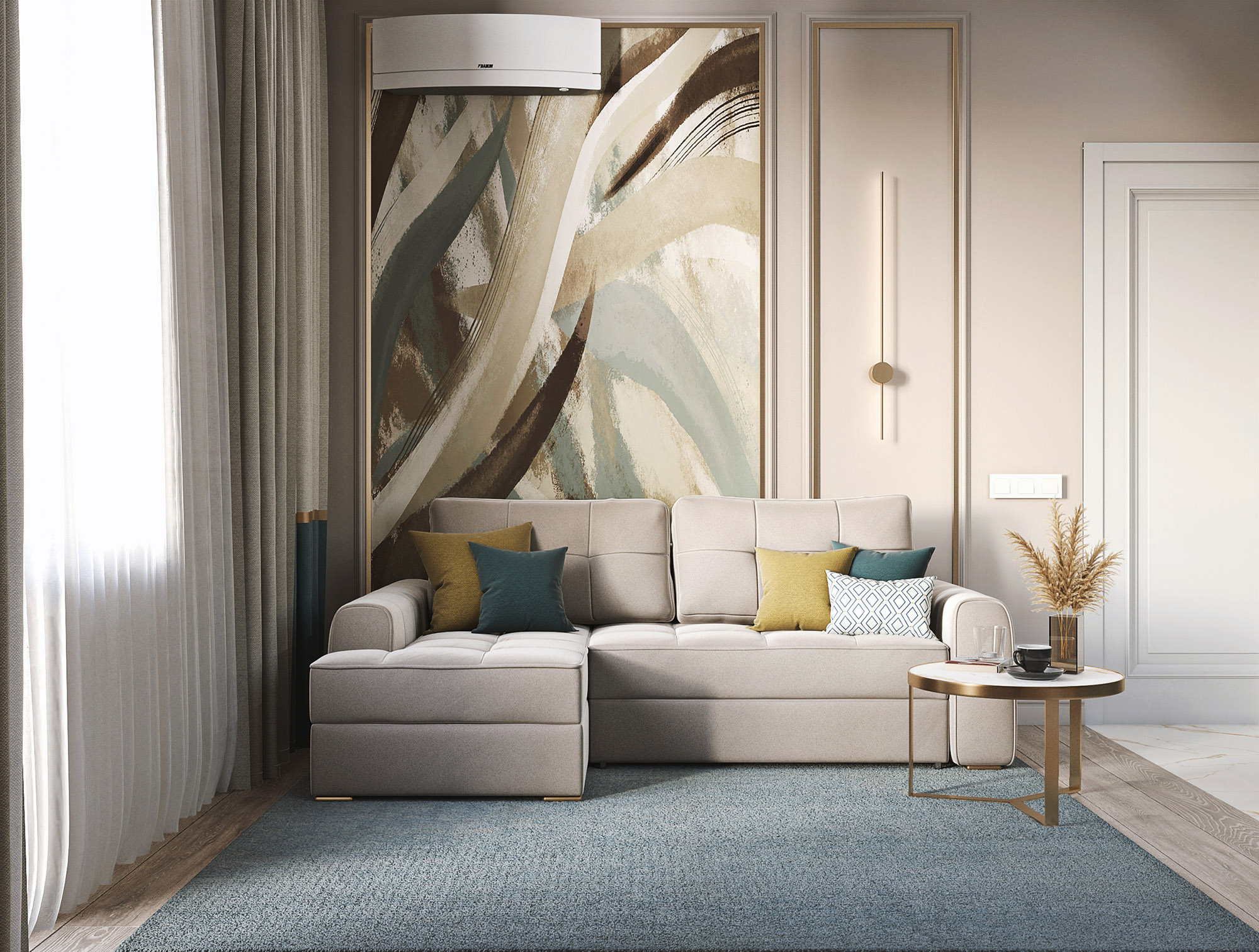 В этом проекте вдохновением для гостиной стали обои из коллекции «Alive». Акцент из обоев в данном случае захотелось обыграть по периметру декоративным латунным молдингом. Обои тут стали именно той самой отправной точкой — они задали невероятно красивое сочетание цветов для интерьера всей этой комнаты.