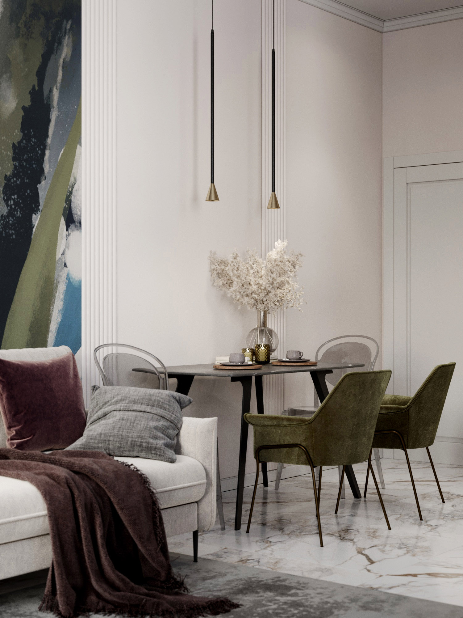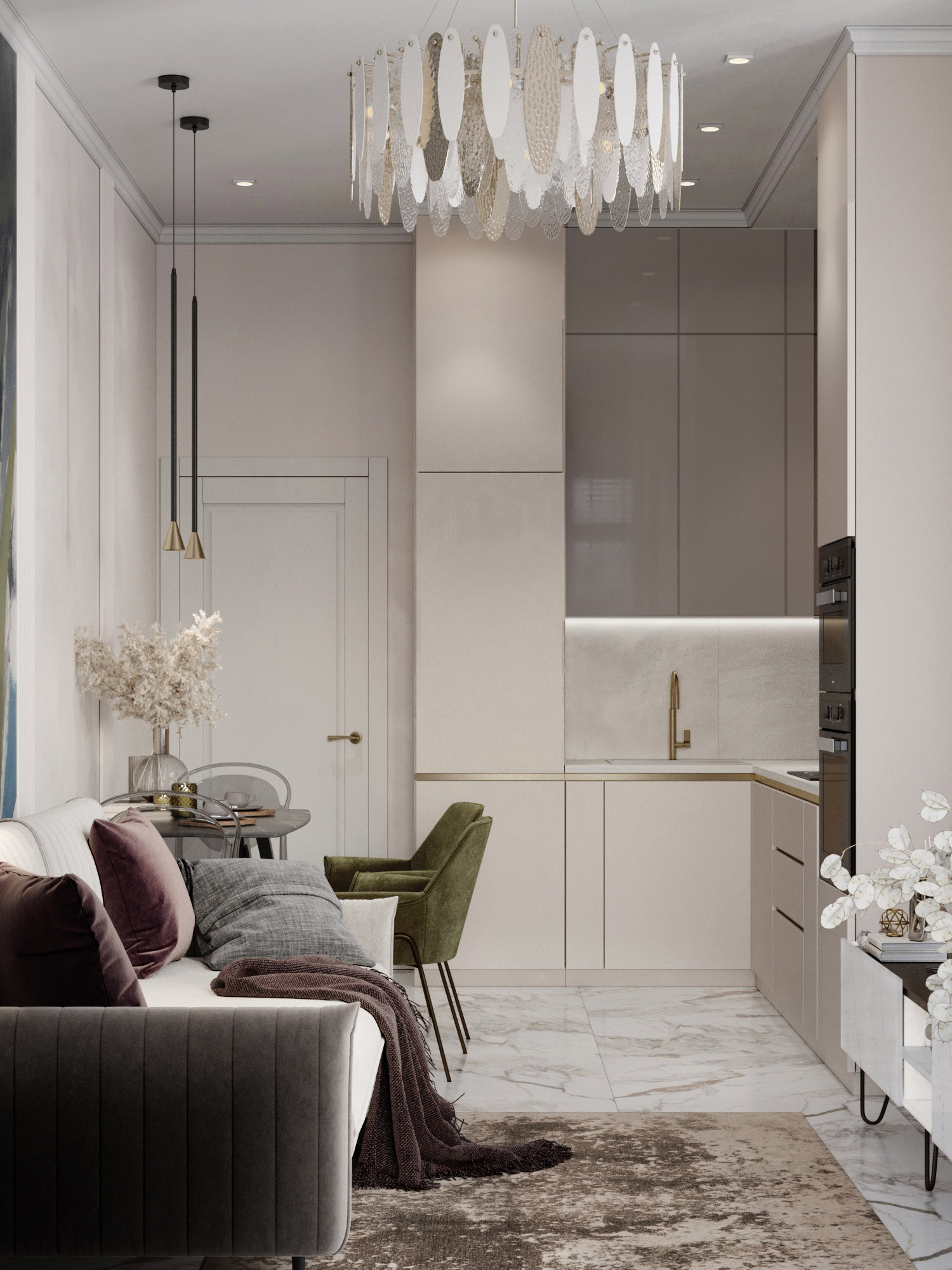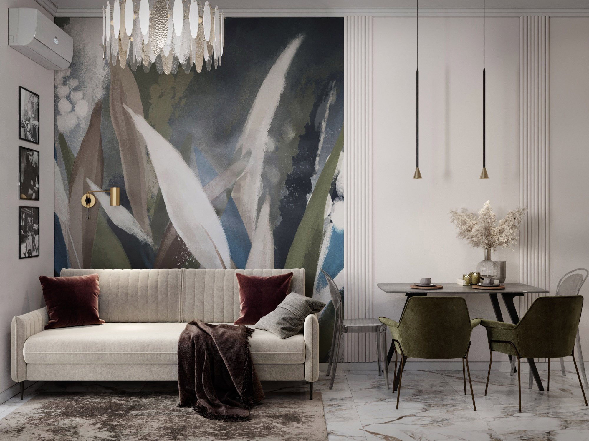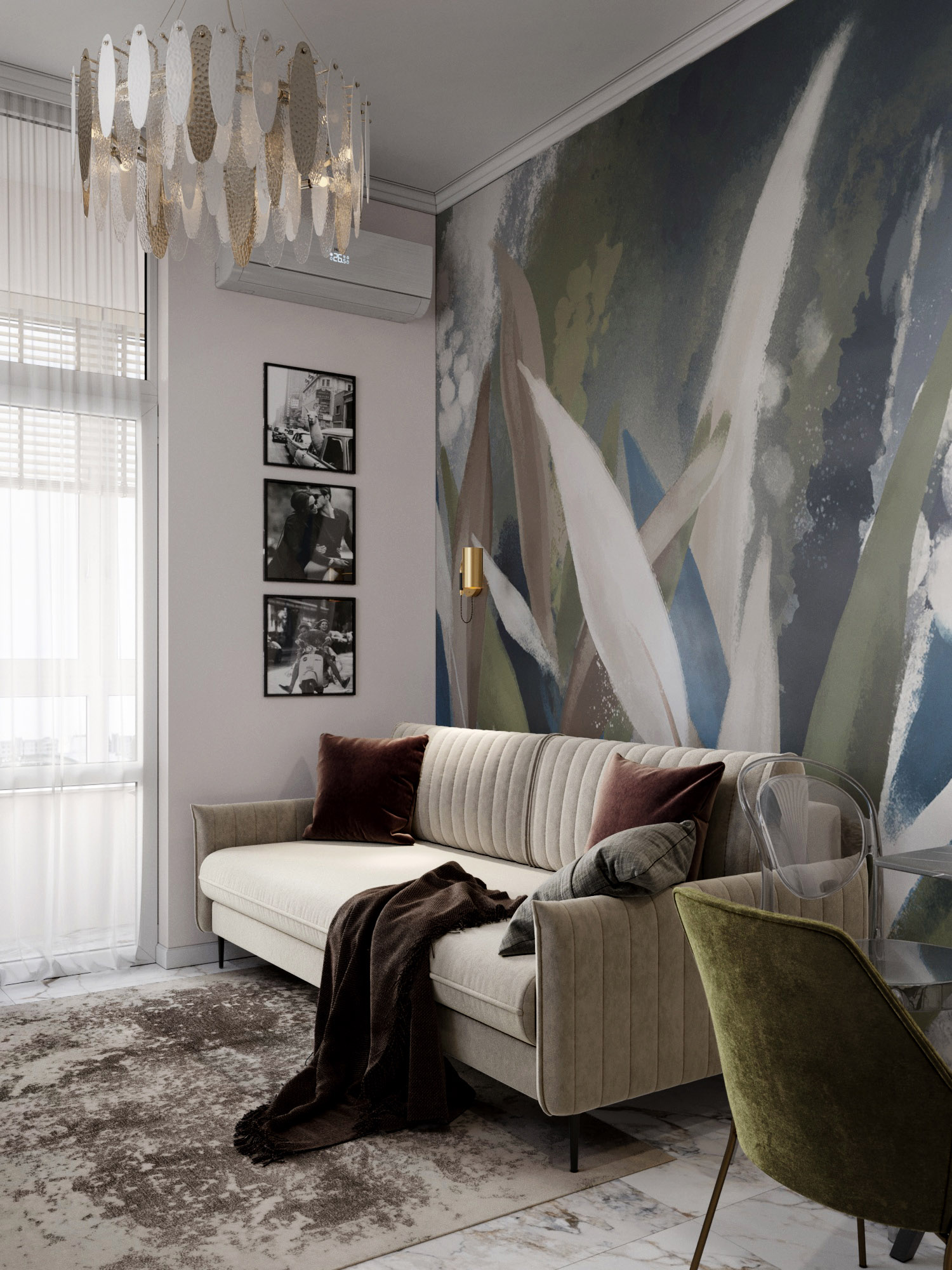 Кухня-гостиная площадью 17 м². Концепция квартиры создавалась от расписного зеркала, а также заказчикам нравятся росписи по стенам и тропическая тематика. В целом получилось смешение классики и тропических мотивов. Выбрали не задумываясь обои, имитирующие настоящую живопись по стенам.