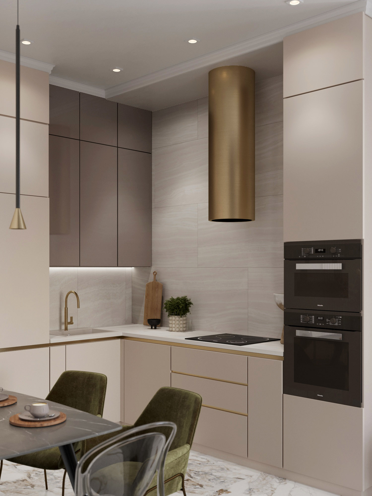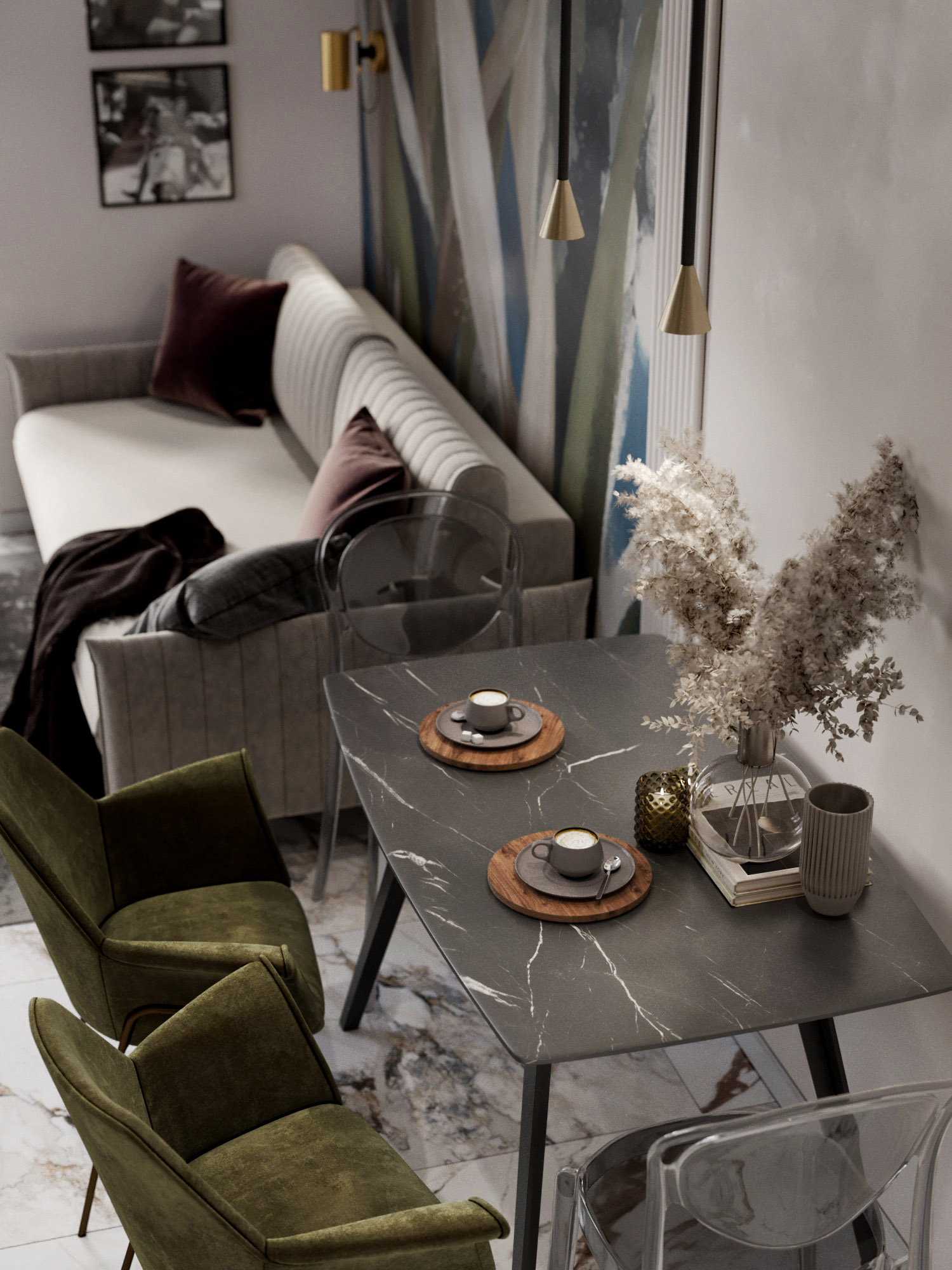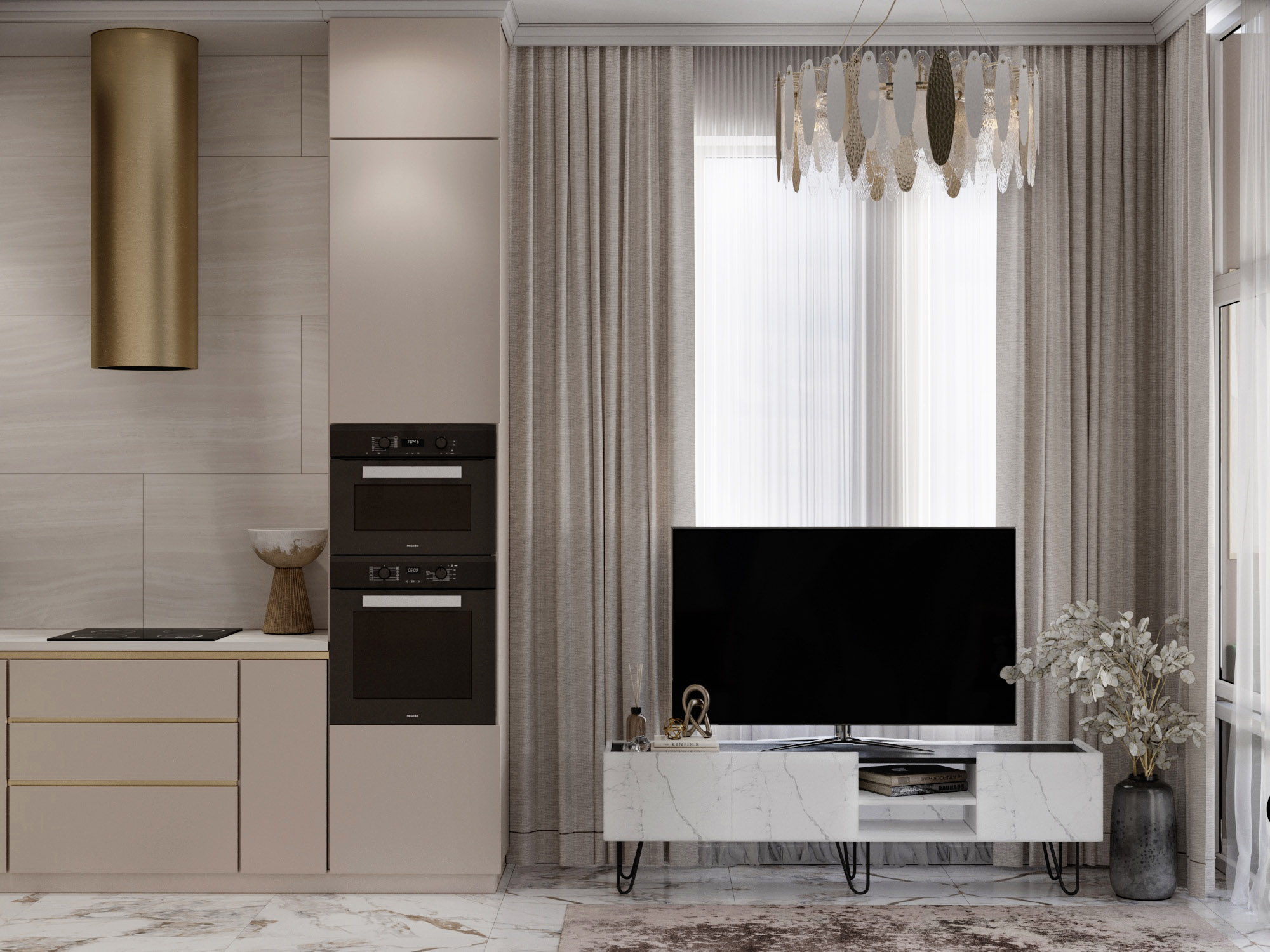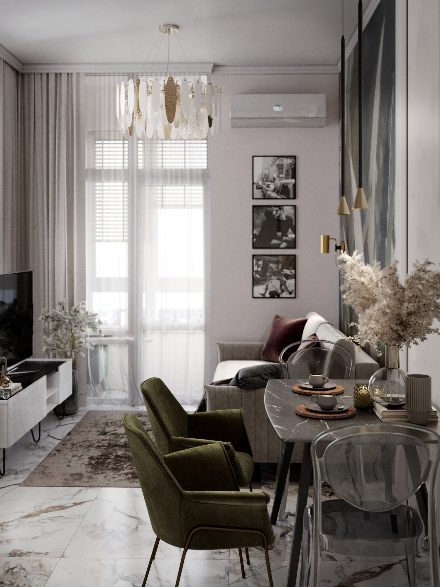 Кухня-гостиная площадью 17 м². Концепция квартиры создавалась от расписного зеркала, а также заказчикам нравятся росписи по стенам и тропическая тематика. В целом получилось смешение классики и тропических мотивов. Выбрали не задумываясь обои, имитирующие настоящую живопись по стенам.