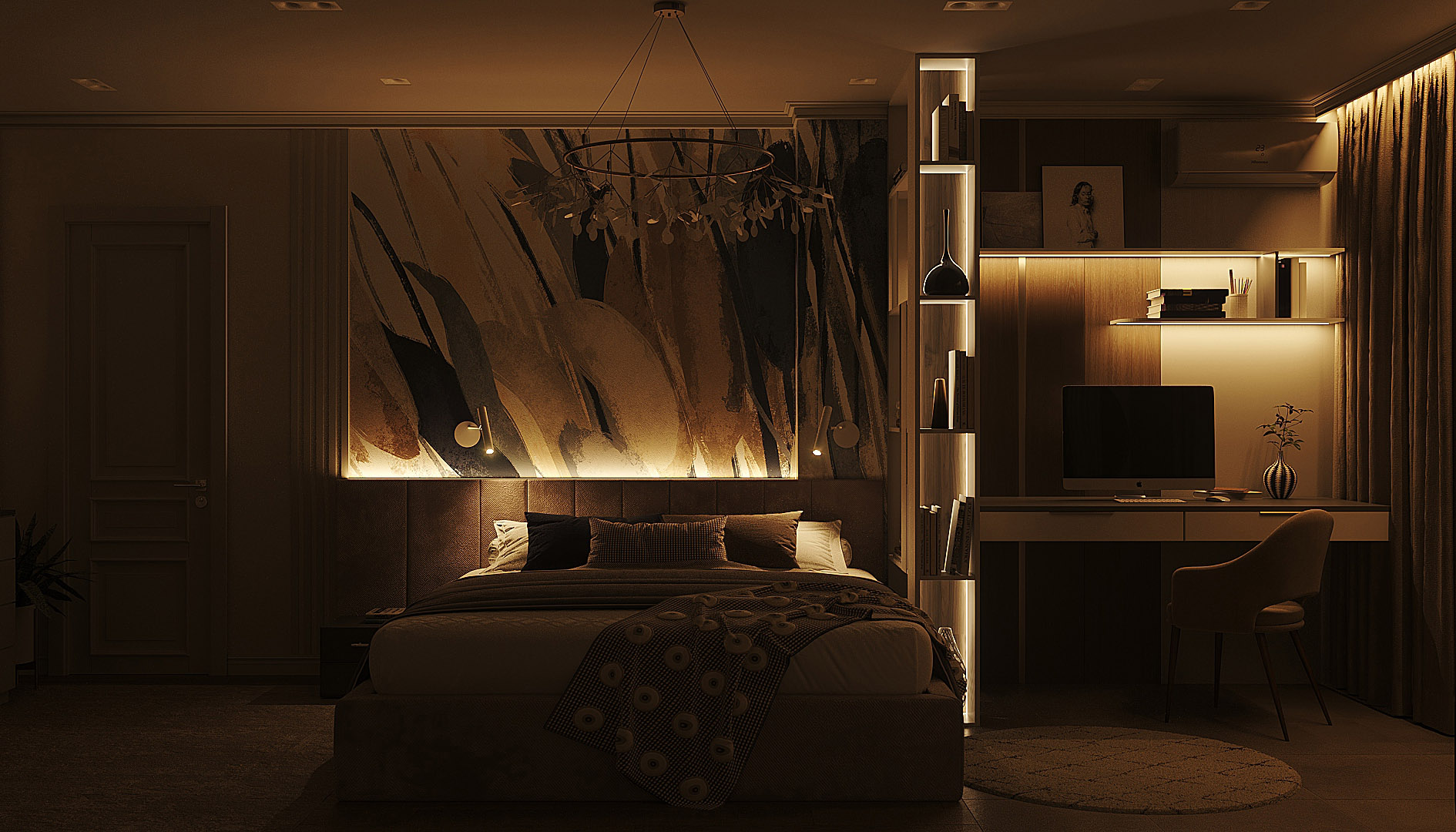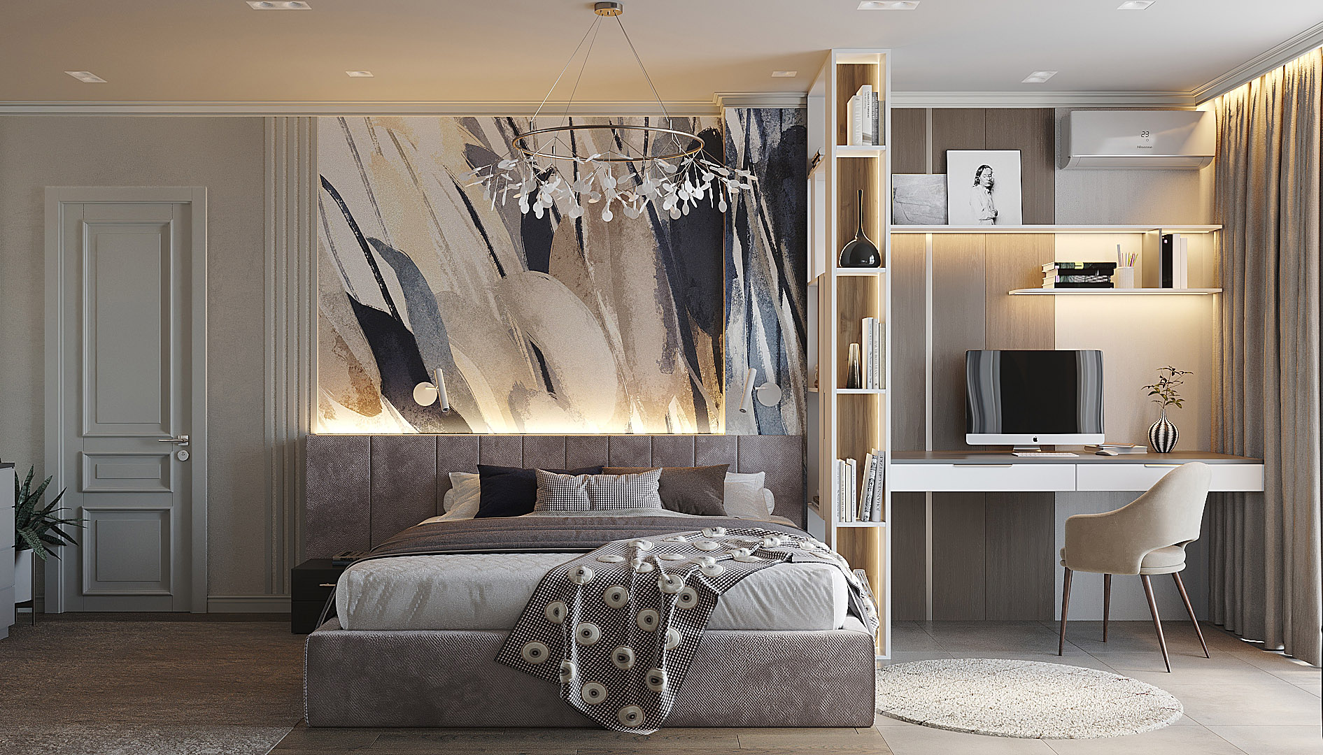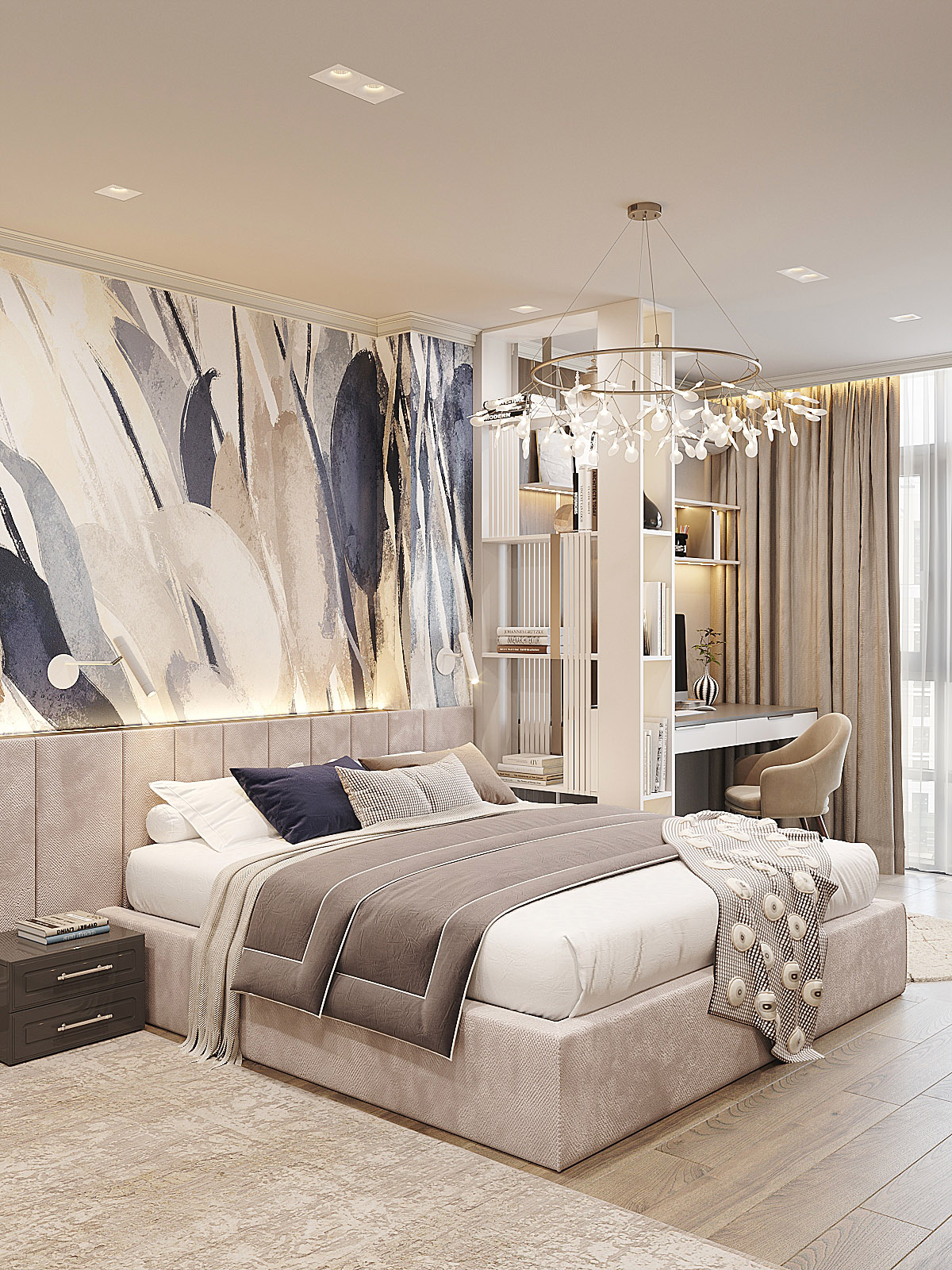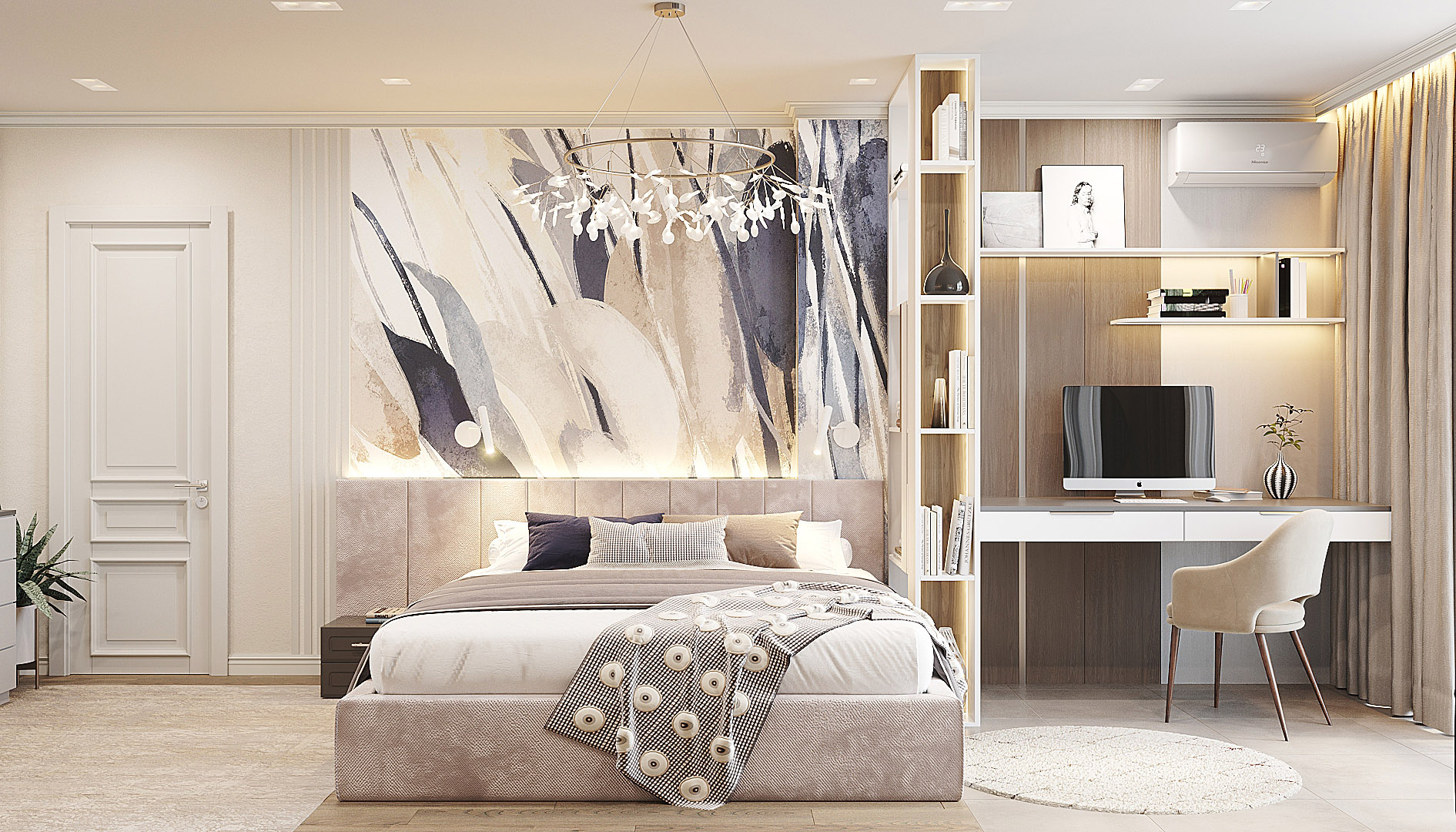 Обои коллекции «Alive» идеально вписались в концепцию и добавили цвета в интерьер. Также дополнительным акцентом выступает подсветка над изголовьем, она приковывает внимание к рисунку и делает его объемным!