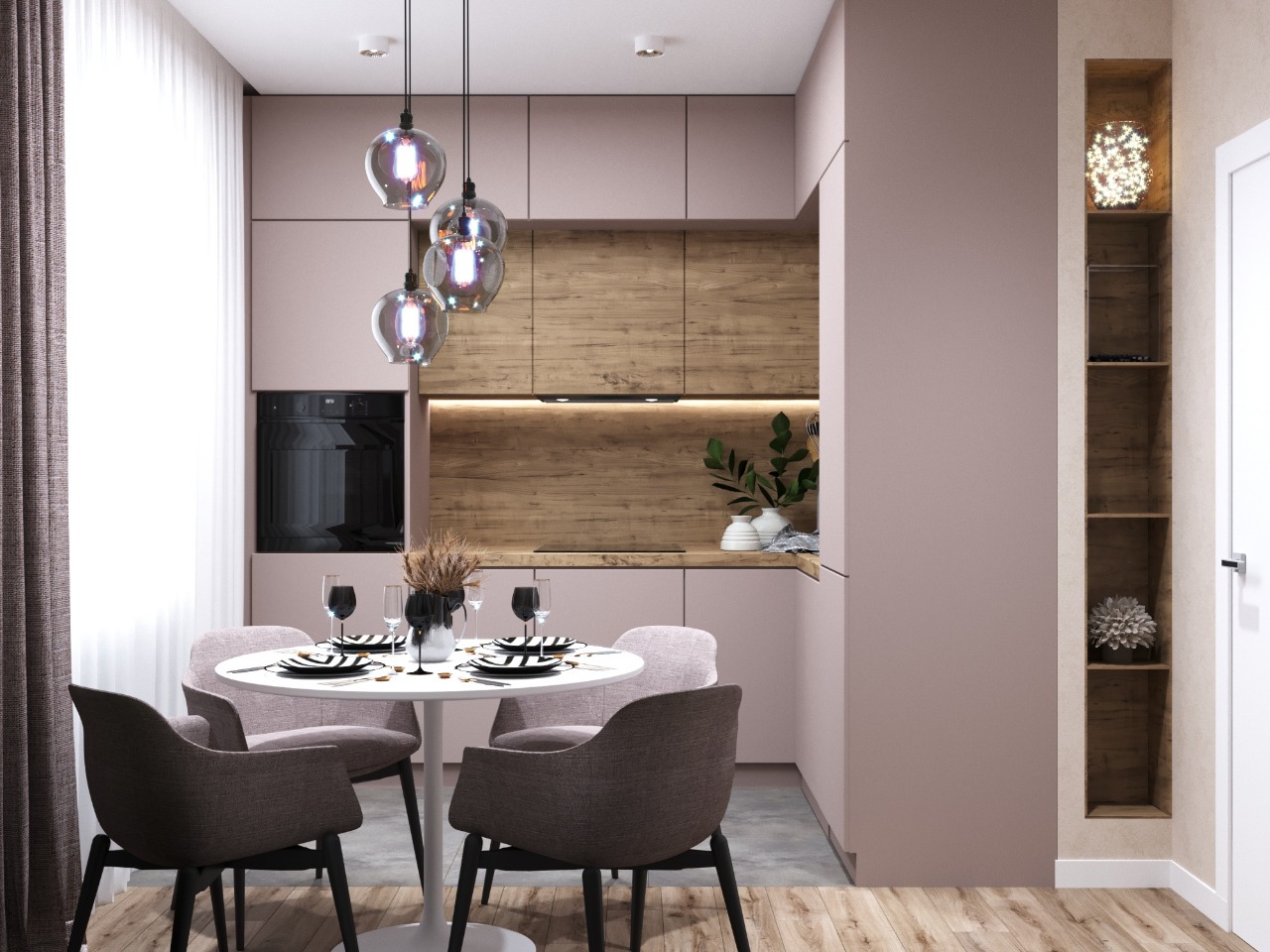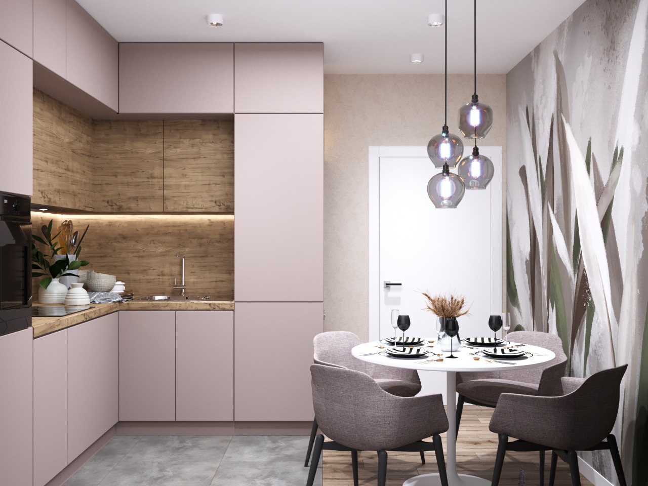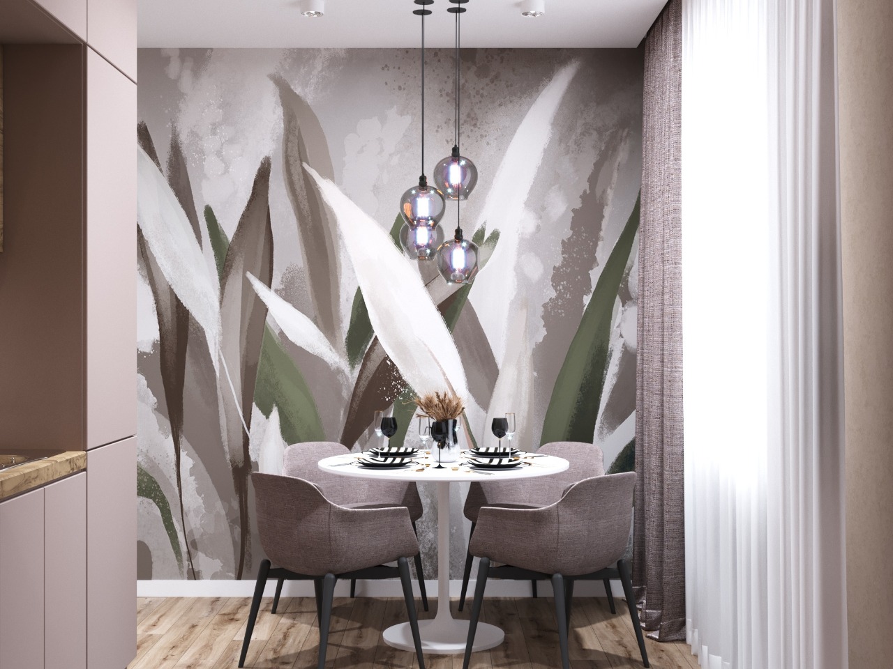 Кухня площадью 11 м². Основным пожеланием клиентов были уют и функциональность, разбавленные акцентной стеной. И в качестве оформления стены дизайнер решил применить эти нежные, бесконечно красивые и приятные обои «Alive». Клиентам тоже очень понравилось данное решение.