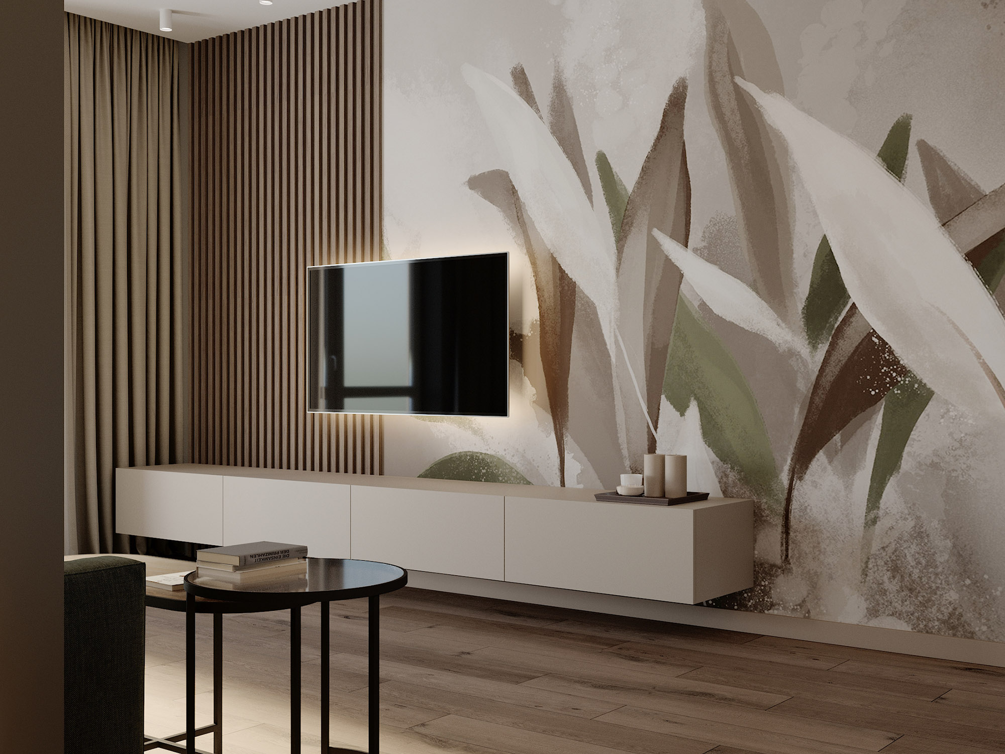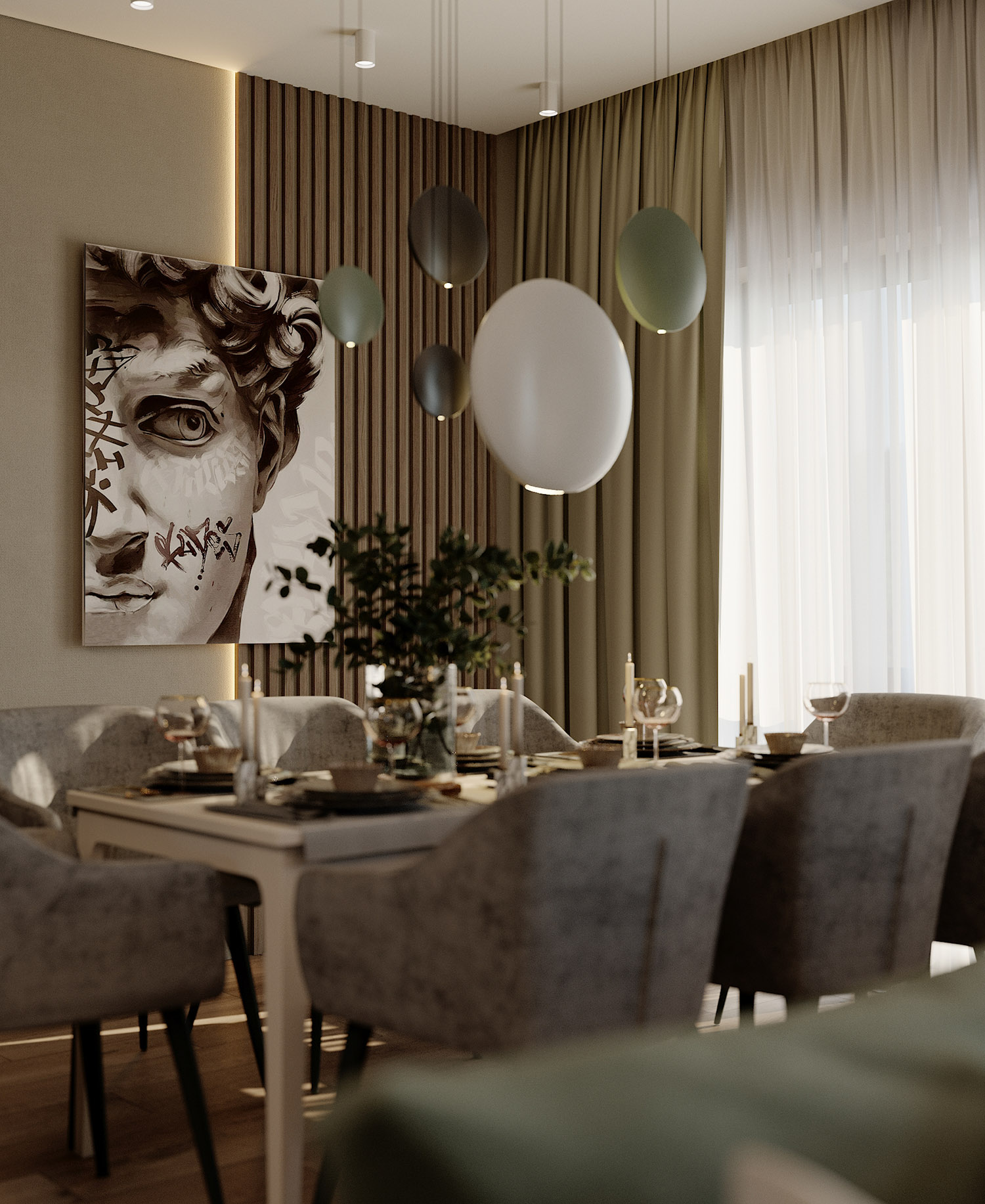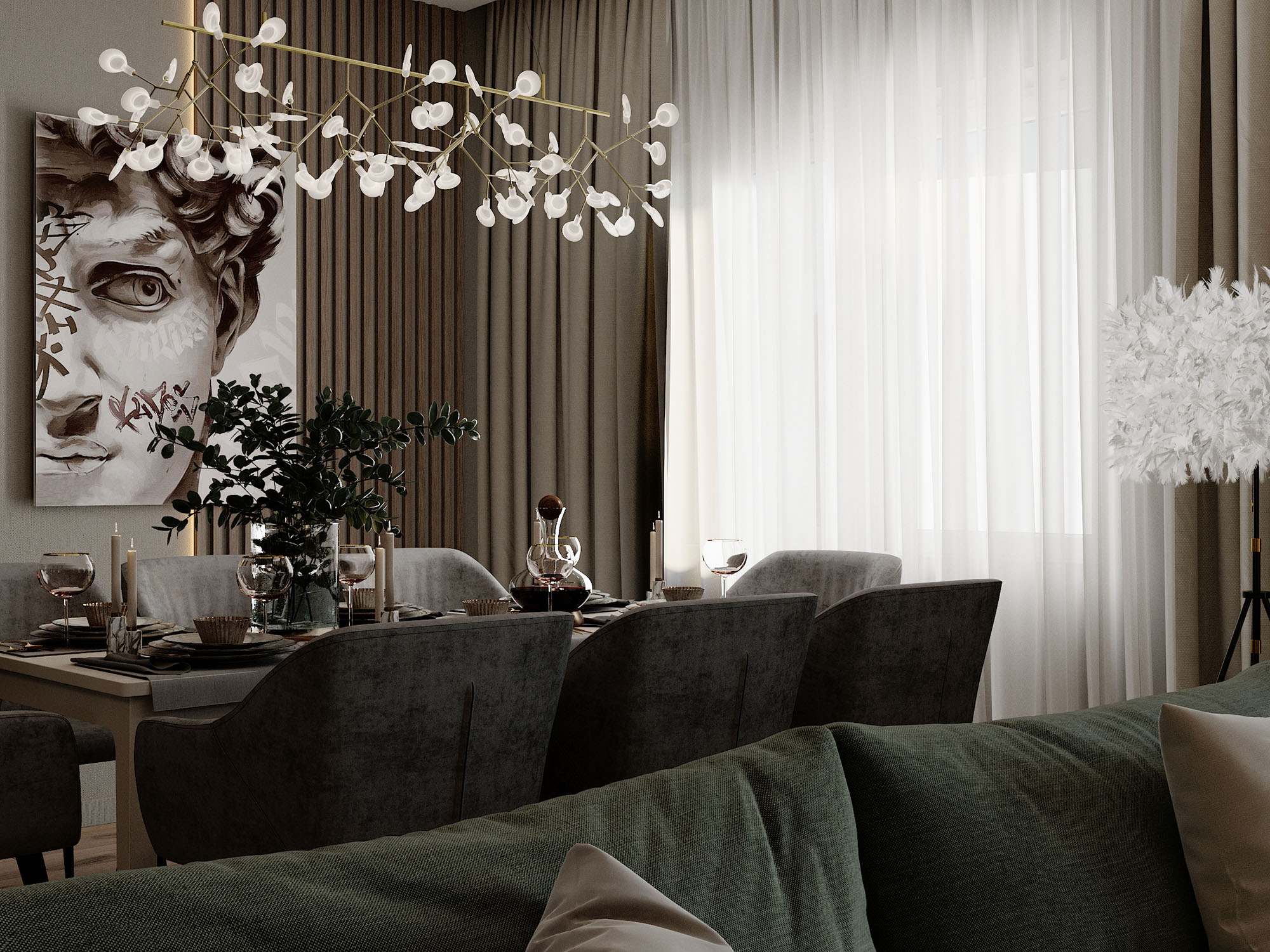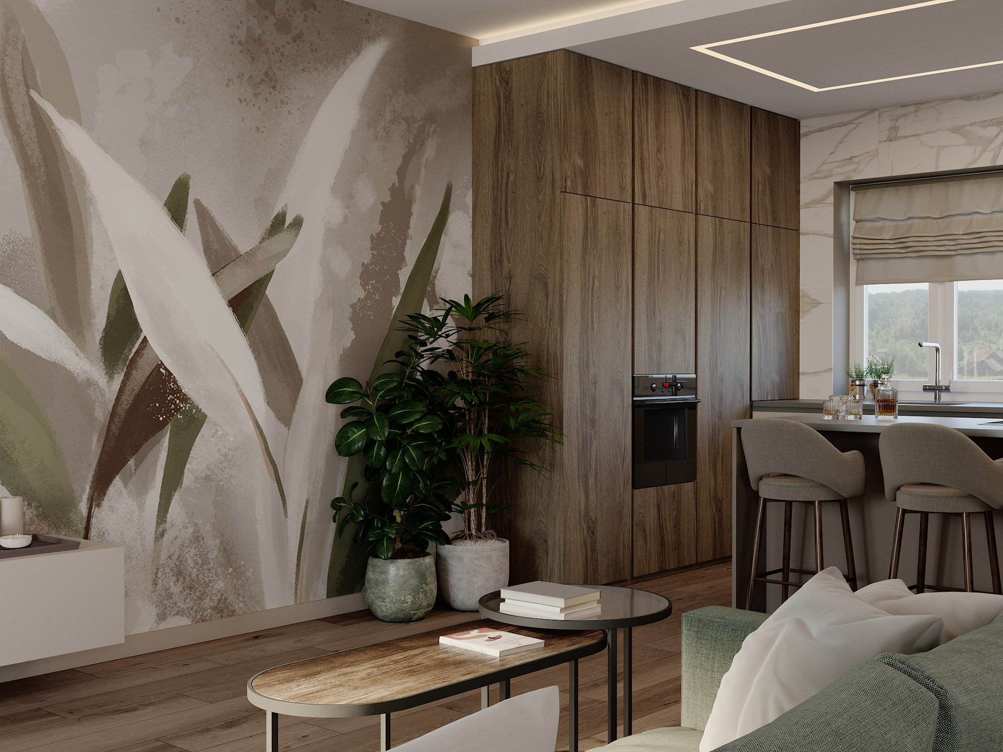Дизайн обеденной зоны на первом этаже таунхауса. Обои из коллекции «Alive». Широкие мазки, спокойные тона и растительные мотивы — что может быть лучше для искателей умиротворения? Подарите себе покой и гармонию, воплощённую в этой удивительной коллекции!