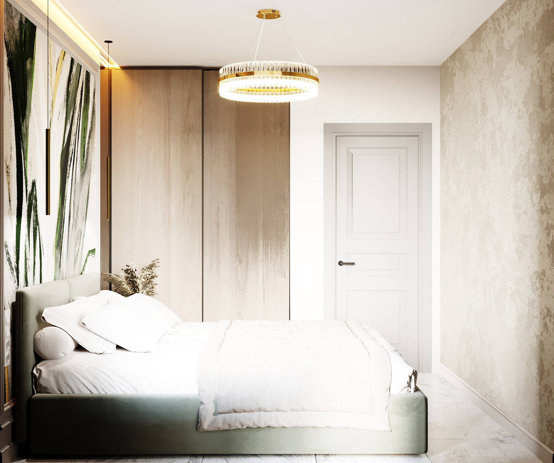 Квартира находится в г. Санкт-Петербург. Проект разрабатывался для молодой девушки-студентки из Москвы. Главными пожеланиями были: по цветовой гамме — светлые стены с декоративными элементами в виде молдингов и нежно-зеленая мягкая мебель (диван, кровать). А для спальни заказчица сразу обозначила, что хочет бесшовные обои как акцент, и дизайнером был предложен вариант коллекции «Alive»,который отлично вписался в общую концепцию интерьера.
