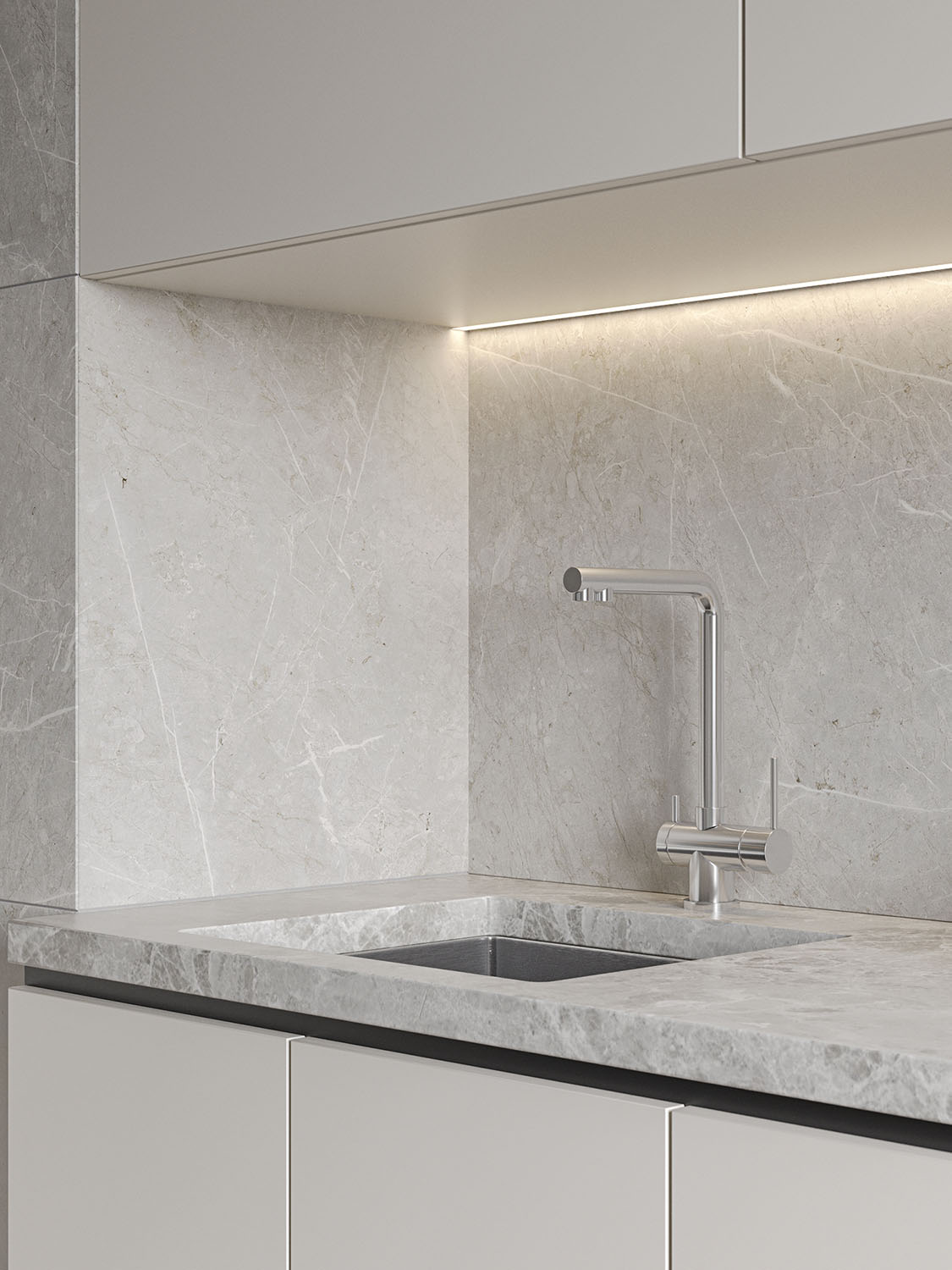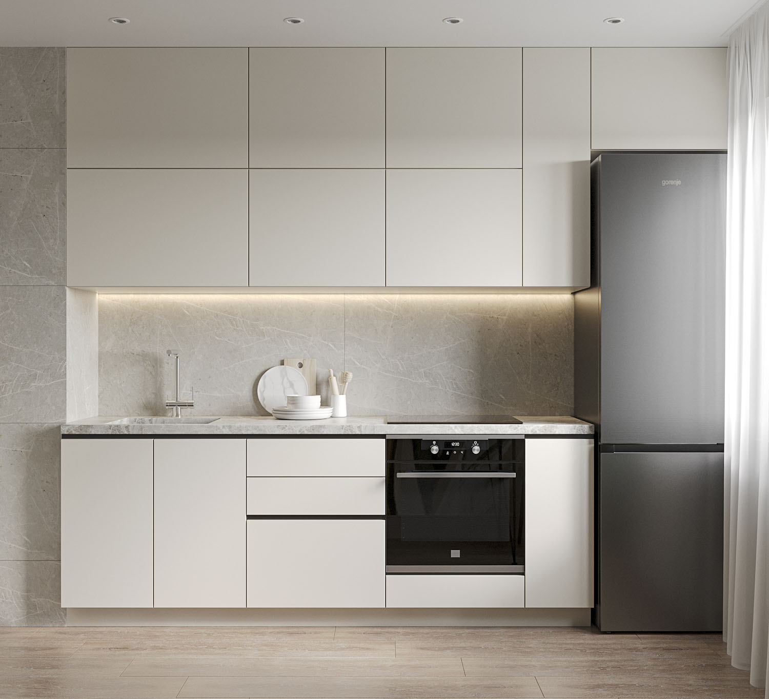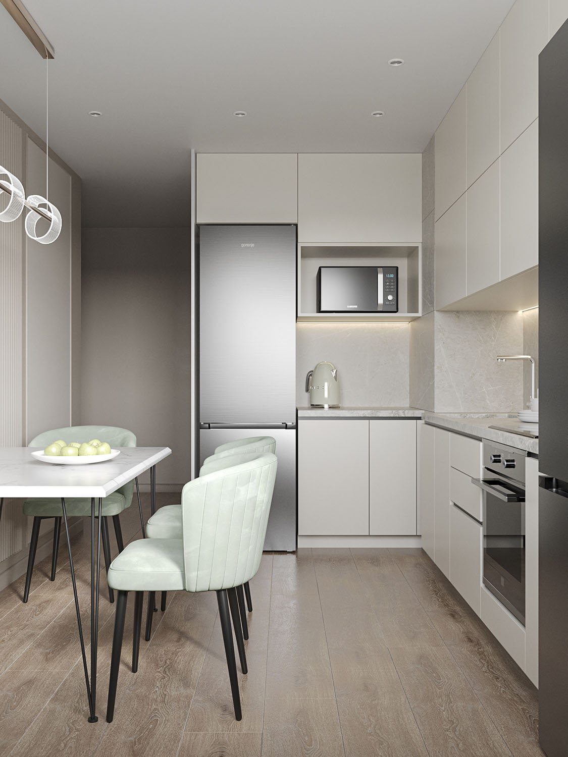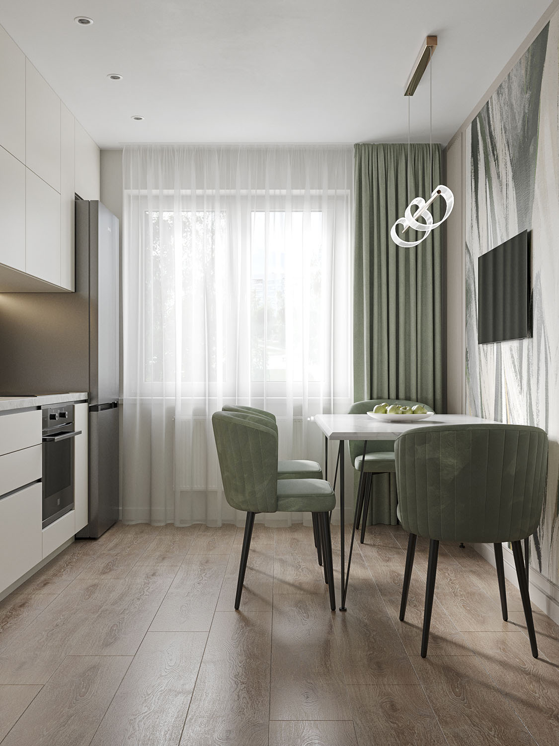 Кухня площадью 10,6 м² из проекта квартиры в г.Ульяновск для семьи с двумя детьми. Пожеланиями были ощущение свежести и чистоты, и в то же время яркие акценты природных цветов.