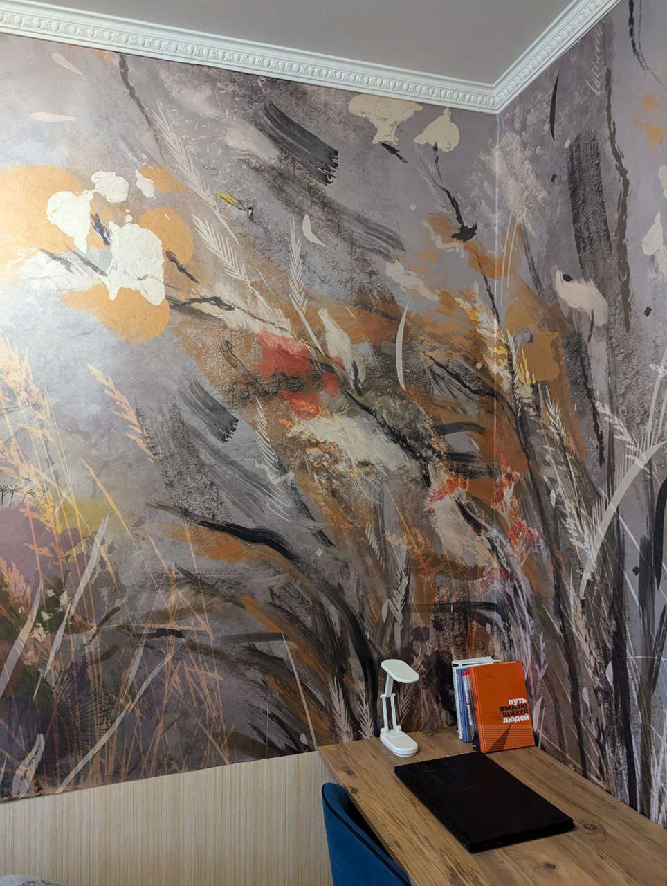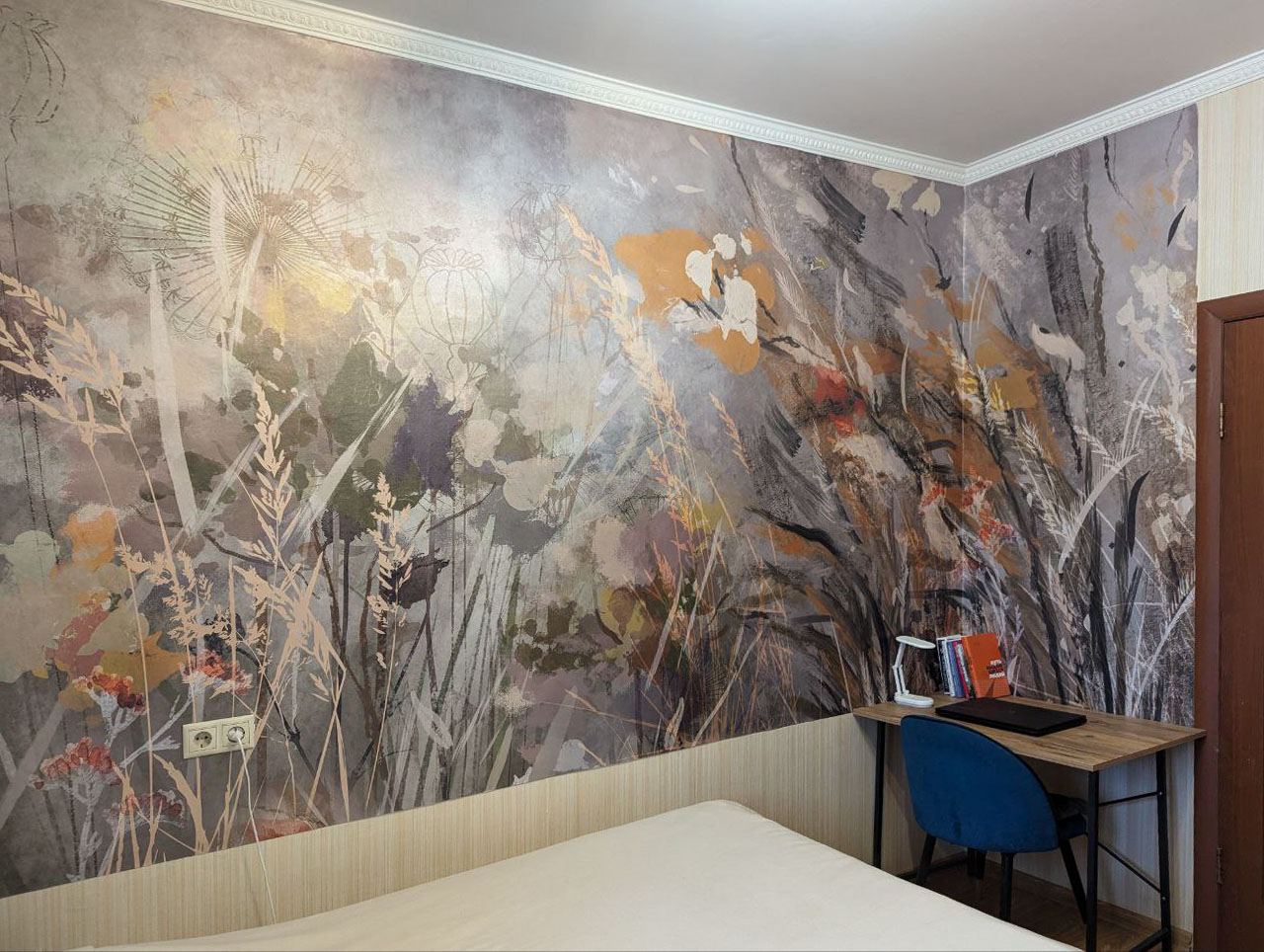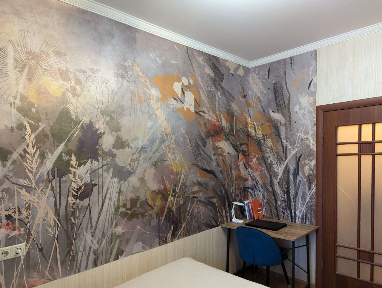Игорь — менеджер по продвижению студии Wall Street — и его супруга Юлия начали с того, что смонтировали на кухне яркое акцентное панно и уже не могли остановиться. Однотонную бежевую спальню они решили оживить акцентными обоями.