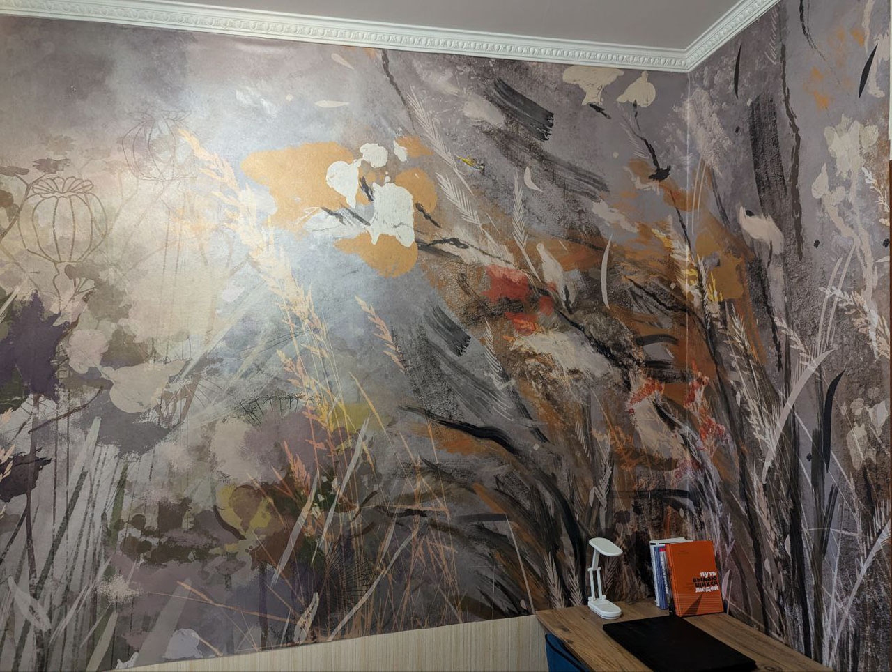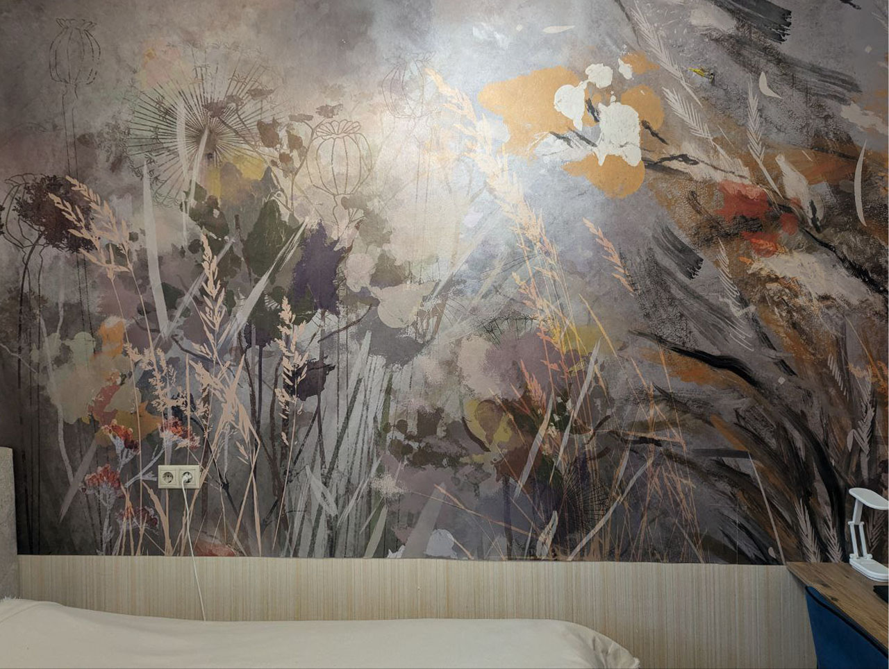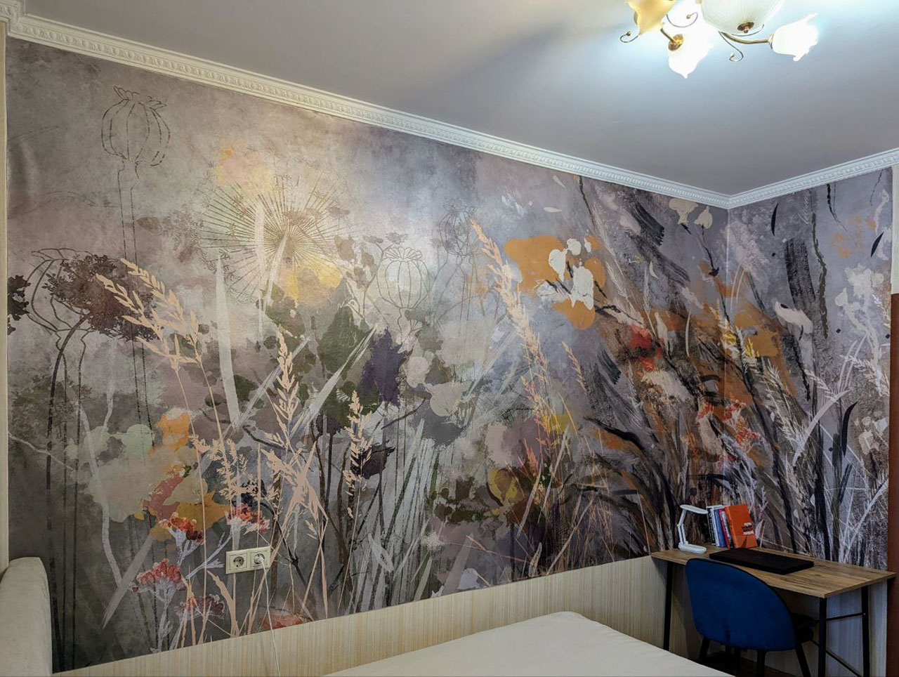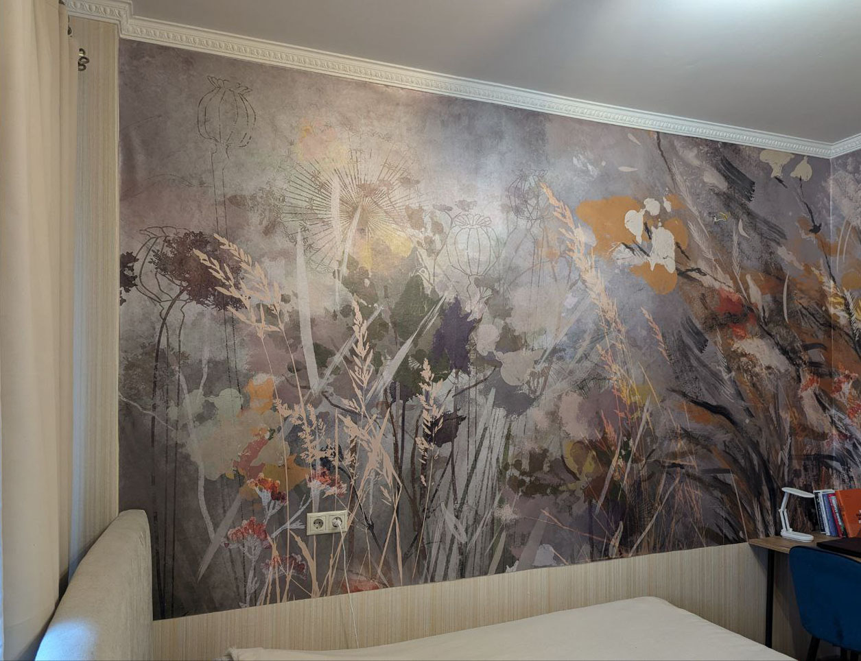 Им хотелось видеть в спальне природные мотивы, а также добавить в интерьер динамики. С этими задачами отлично справилась коллекция ALTAY. Выбранный сюжет изготовили на материале PALERMO с фактурой переливающегося шелка.