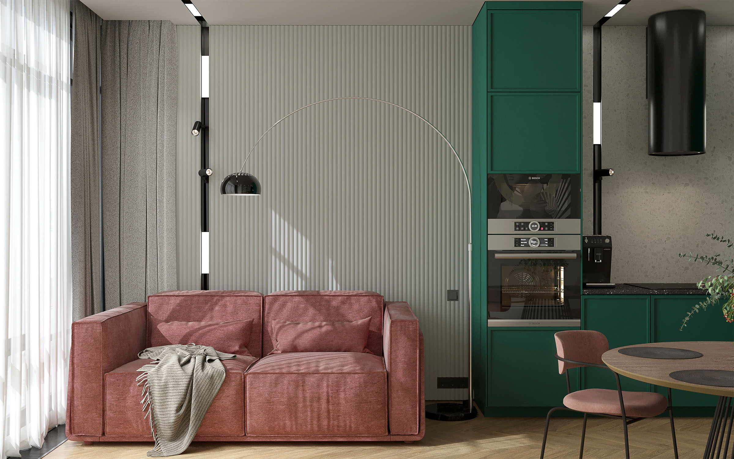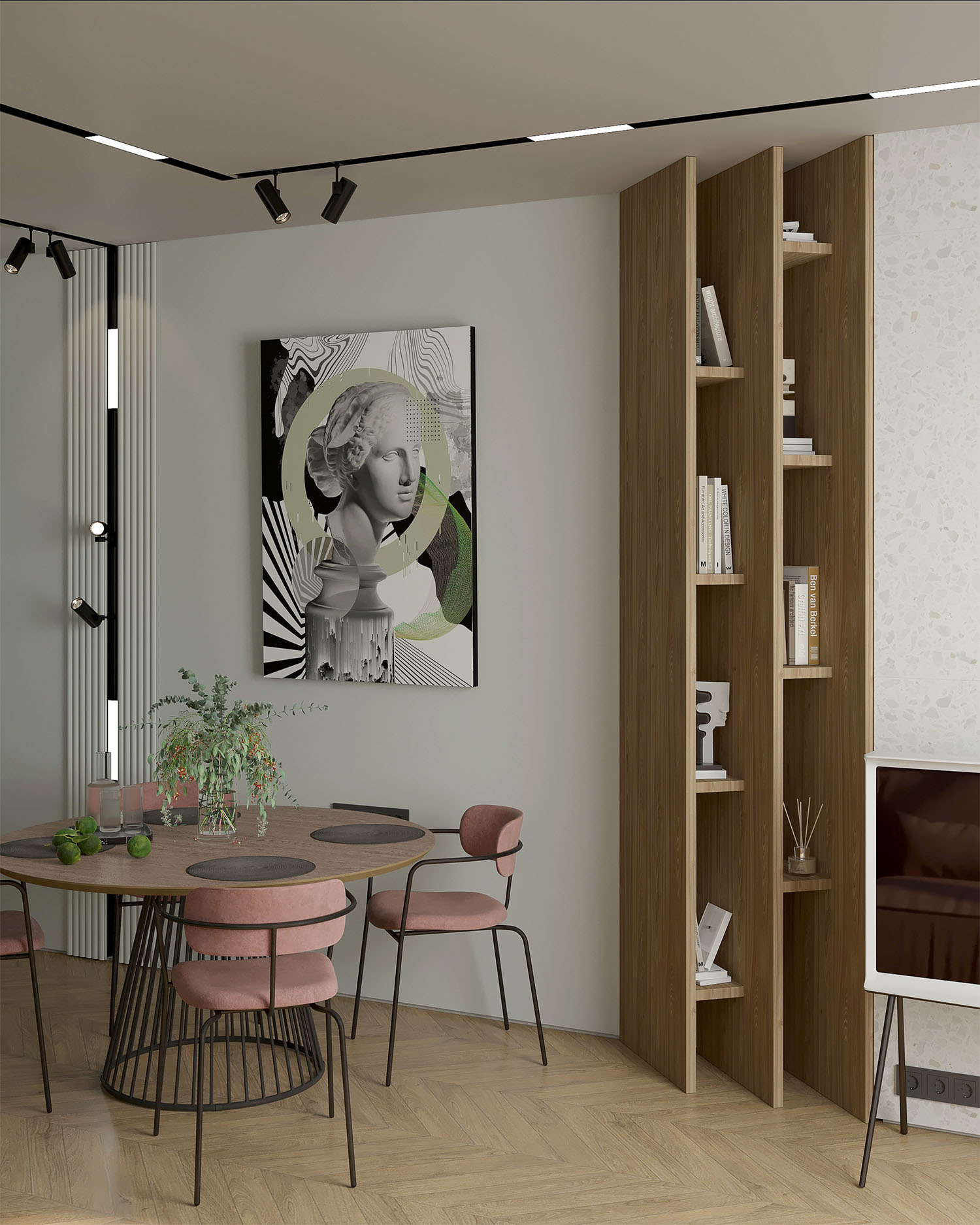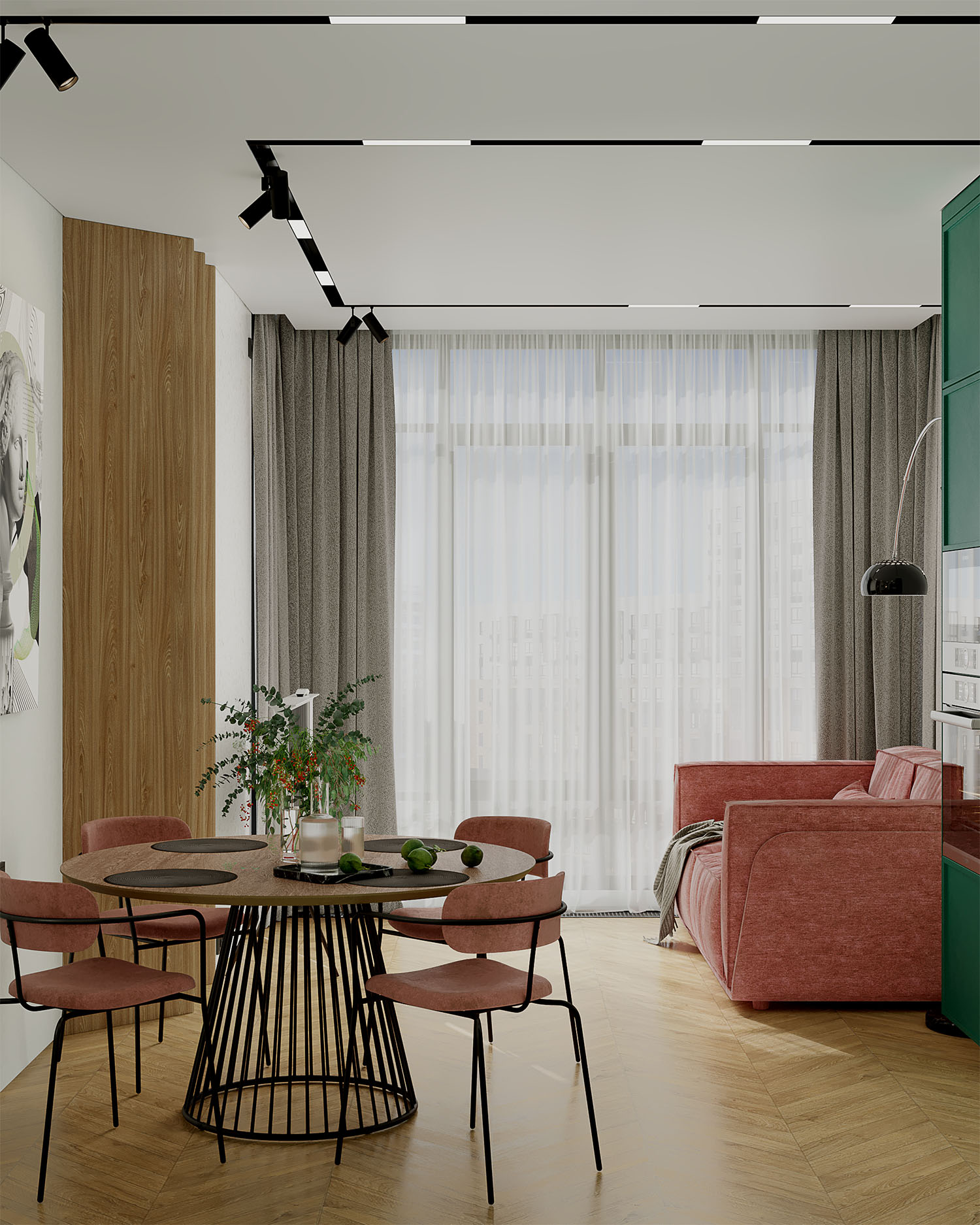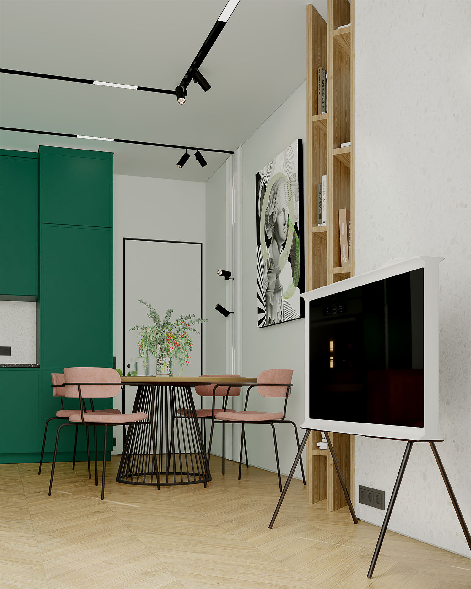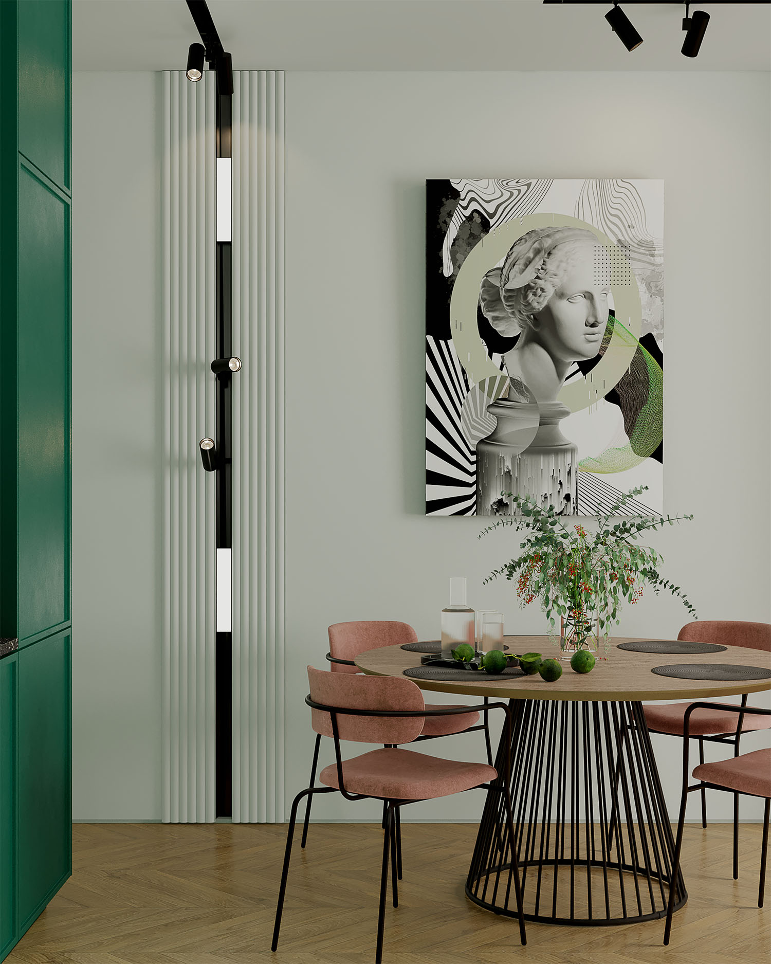 Кухня-гостиная из проекта квартиры в Санкт-Петербурге. Одной из задач было использование ярких цветов, отсутствие однообразия при переходе из одной комнаты в другую. В качестве акцента над обеденной зоной была выбрана картина из коллекции ANTIQUE.