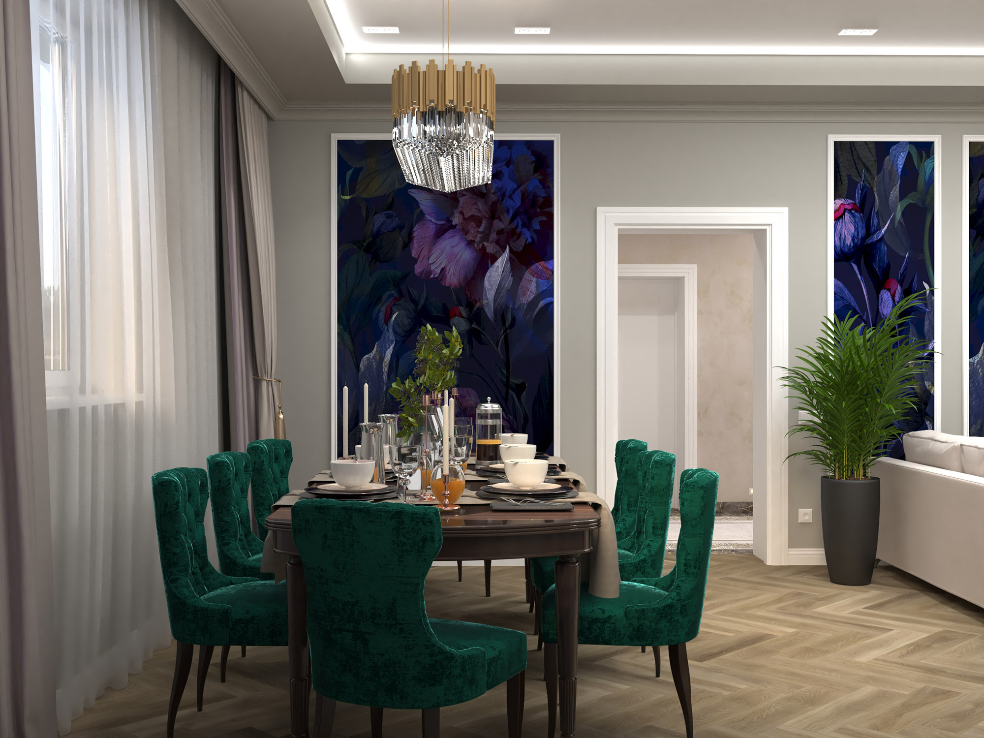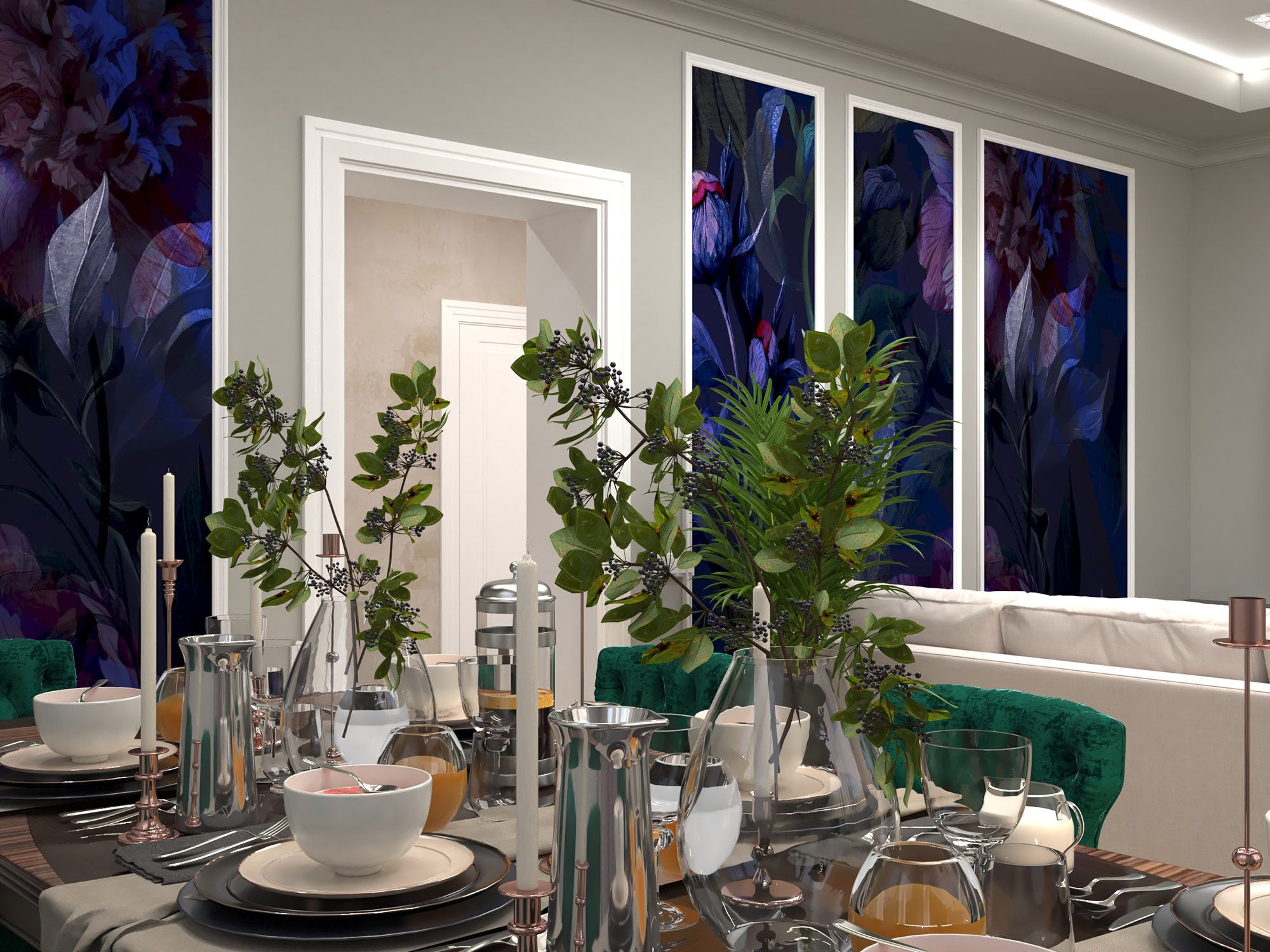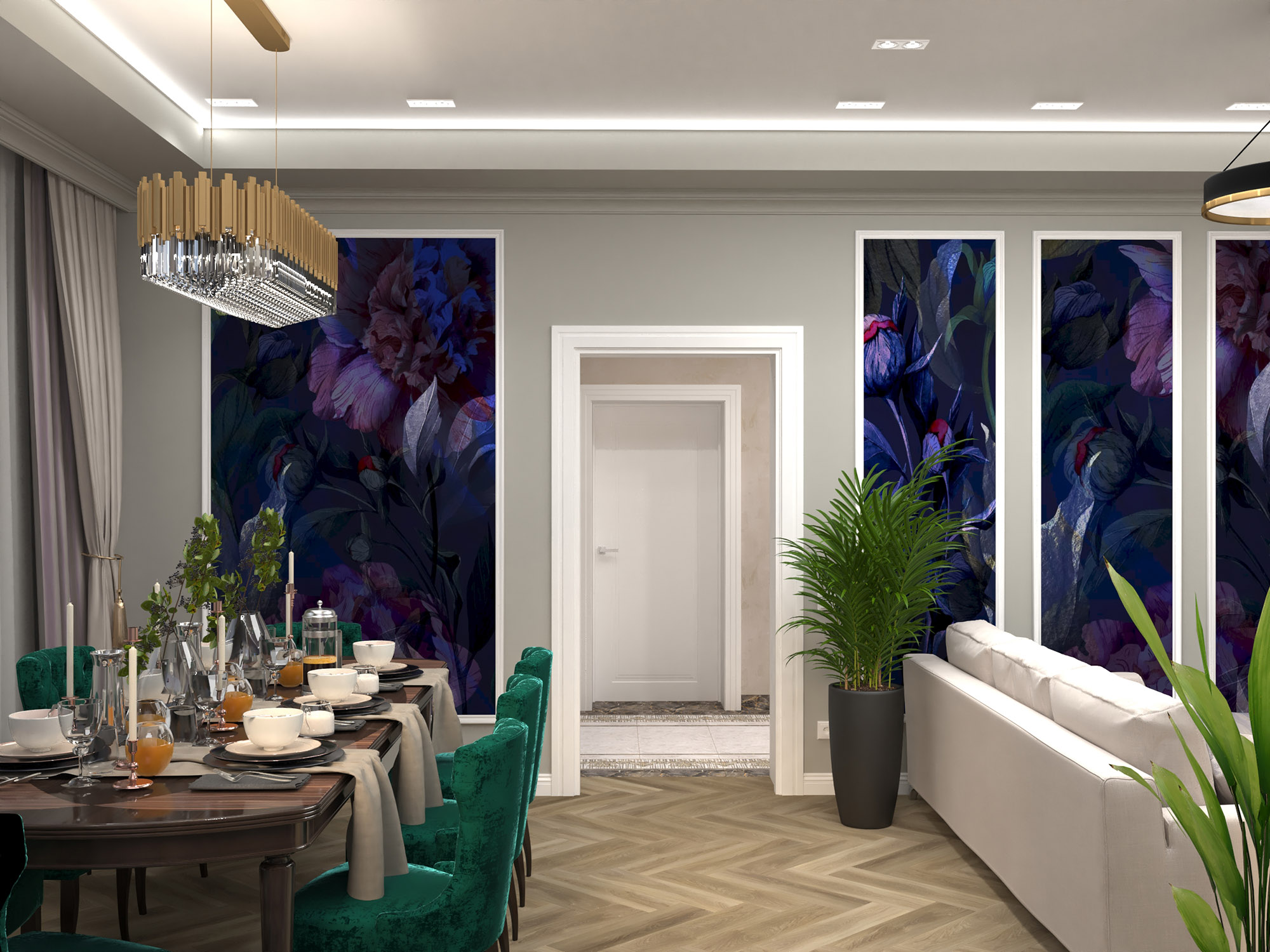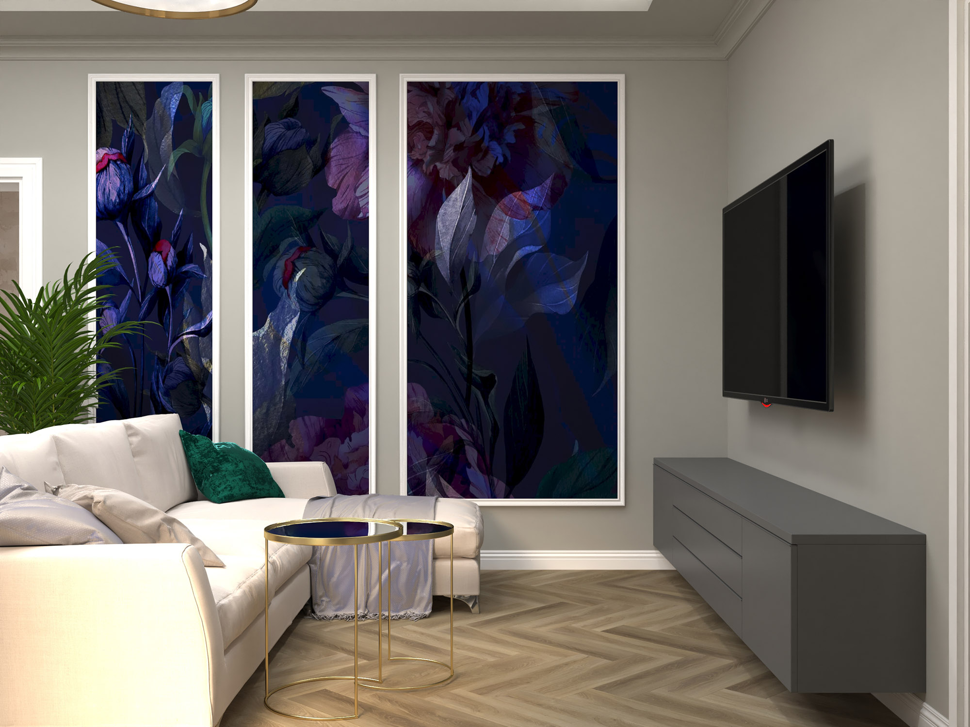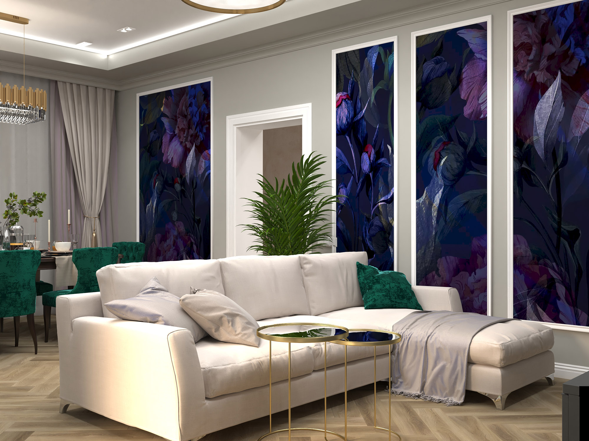 Яркие акценты в виде обоев в благородном царственном фиолетовом оттенке прекрасно дополняют атмосферу помещения. Цвет и рисунок уравновешивают багеты, обрамляющие вставки обоев.