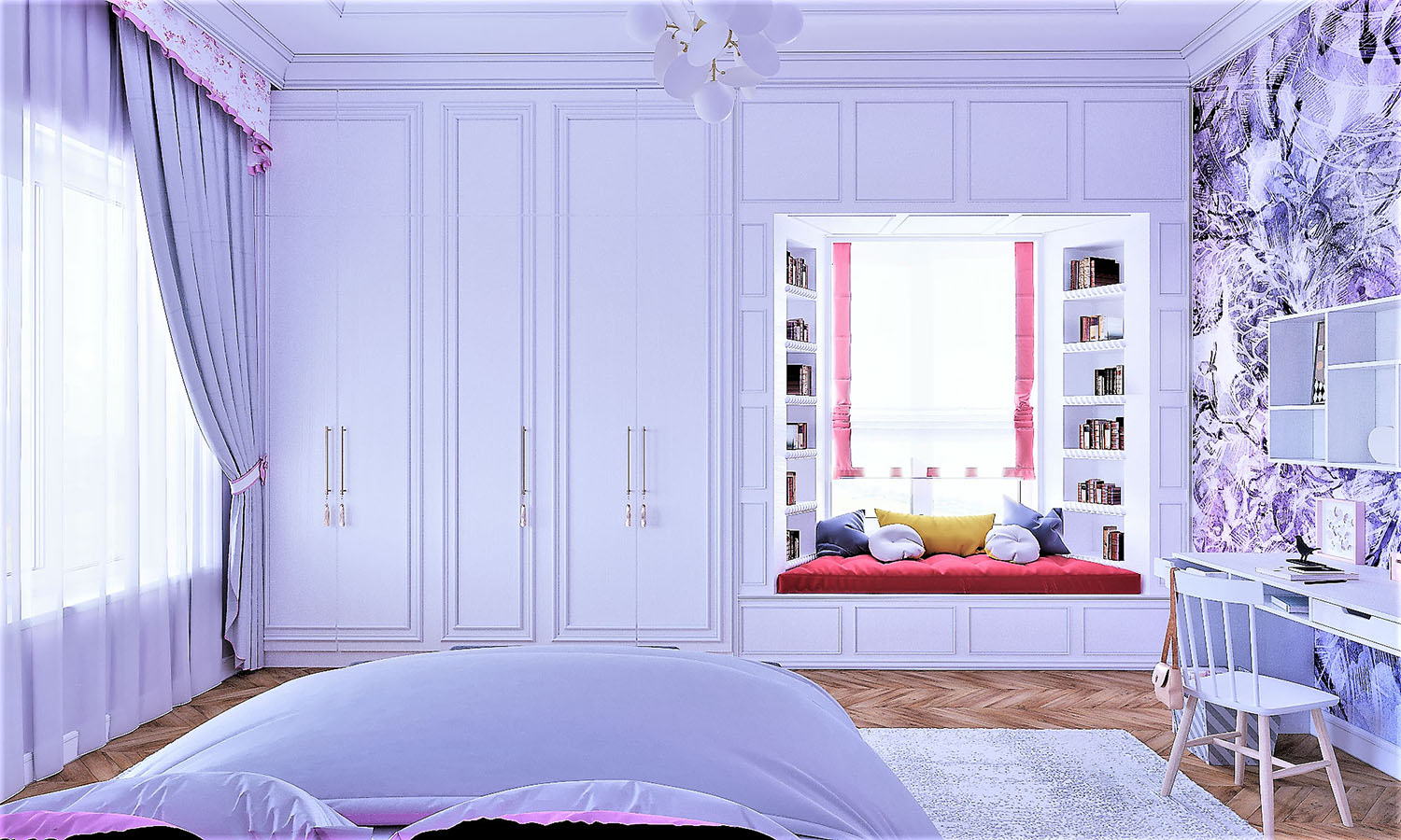 Спальня для девочки возрастом 9 лет. Квартира находится в г. Алматы. Обои из коллекции AQUARELLE. Нежная и воздушная, она похожа на осенний гербарий из сухоцветов. В поиске идеальных оттенков дизайнер смешал целую палитру красок цветовых сочетаний! Только представьте, как будут искриться и переливаться обои из этой коллекции при естественном солнечном свете!