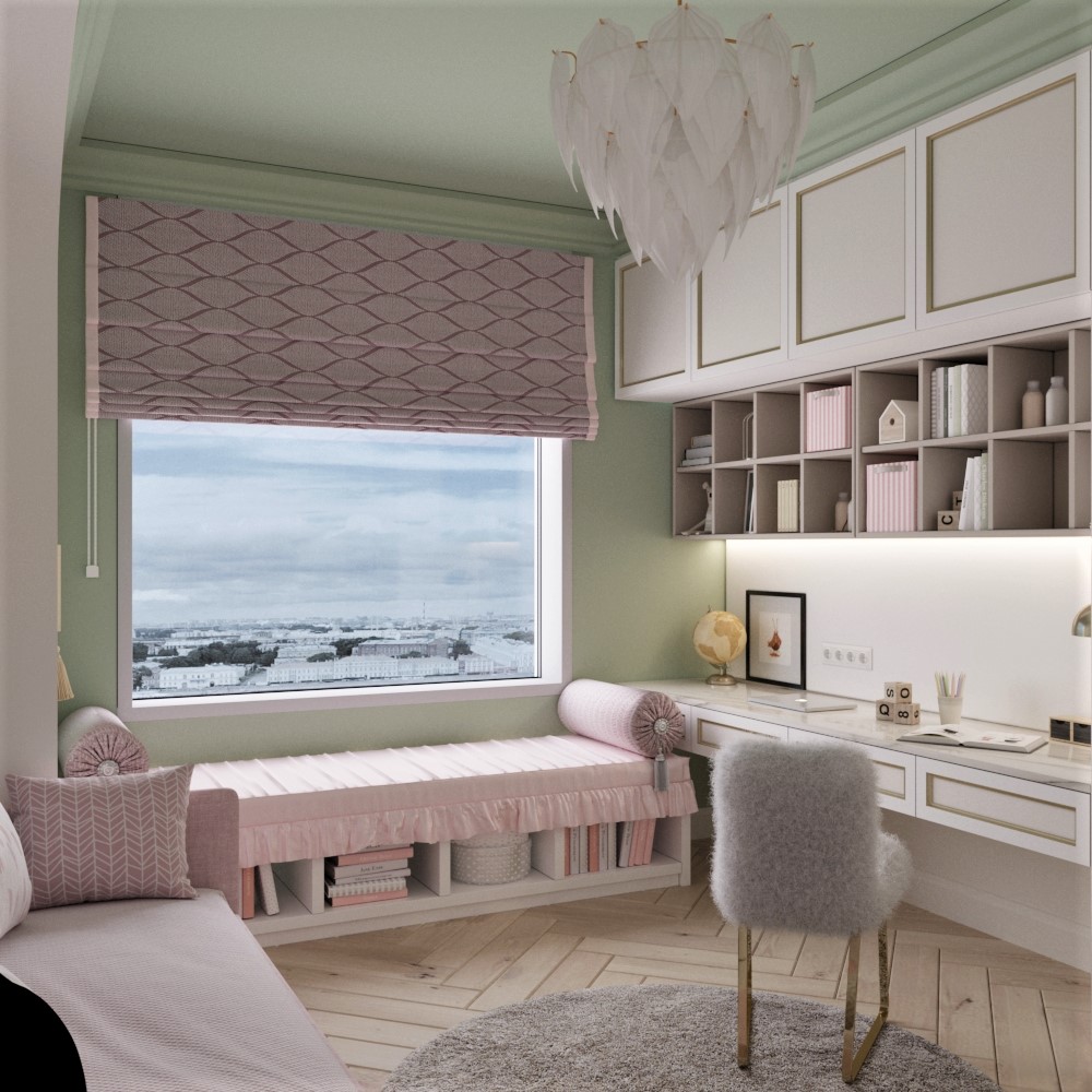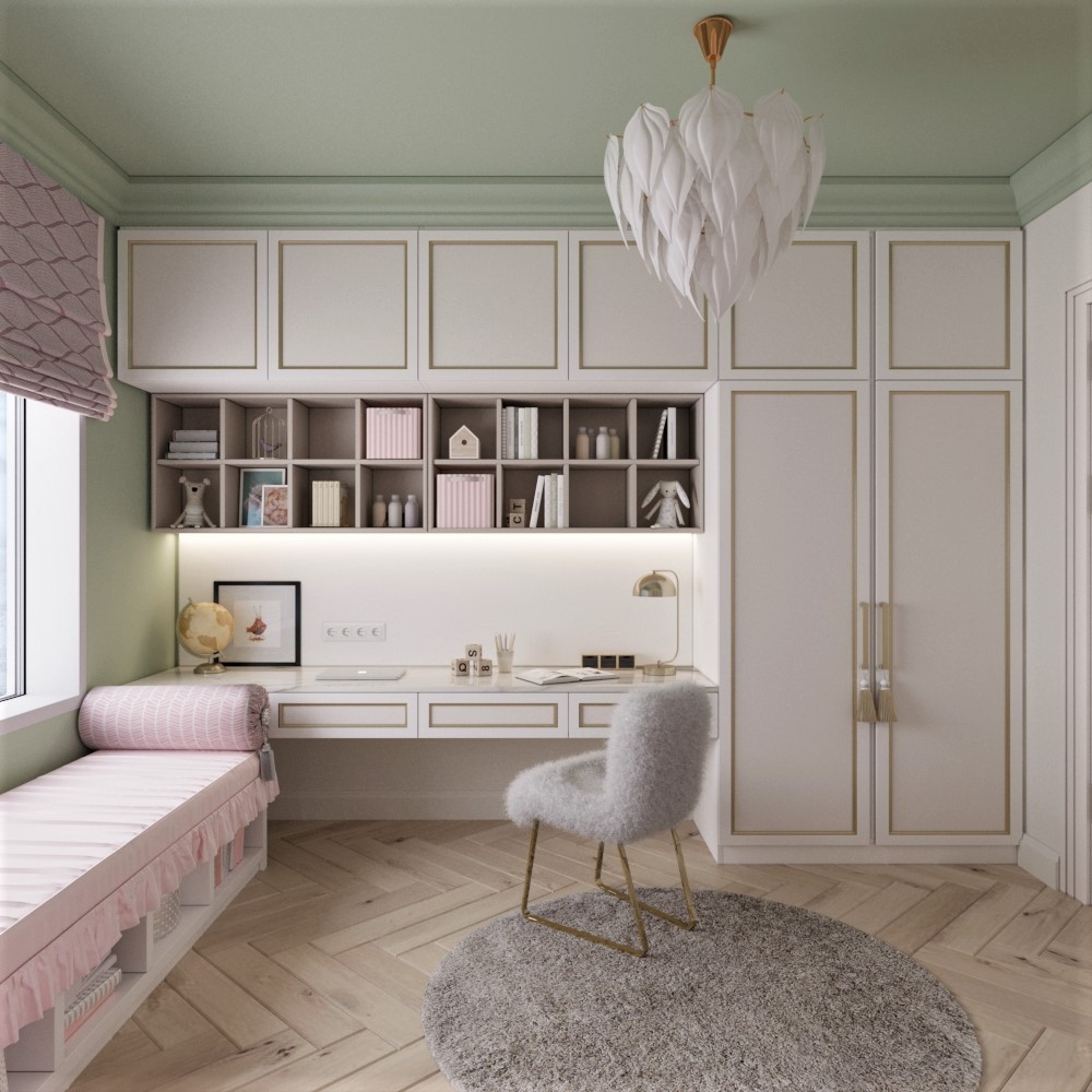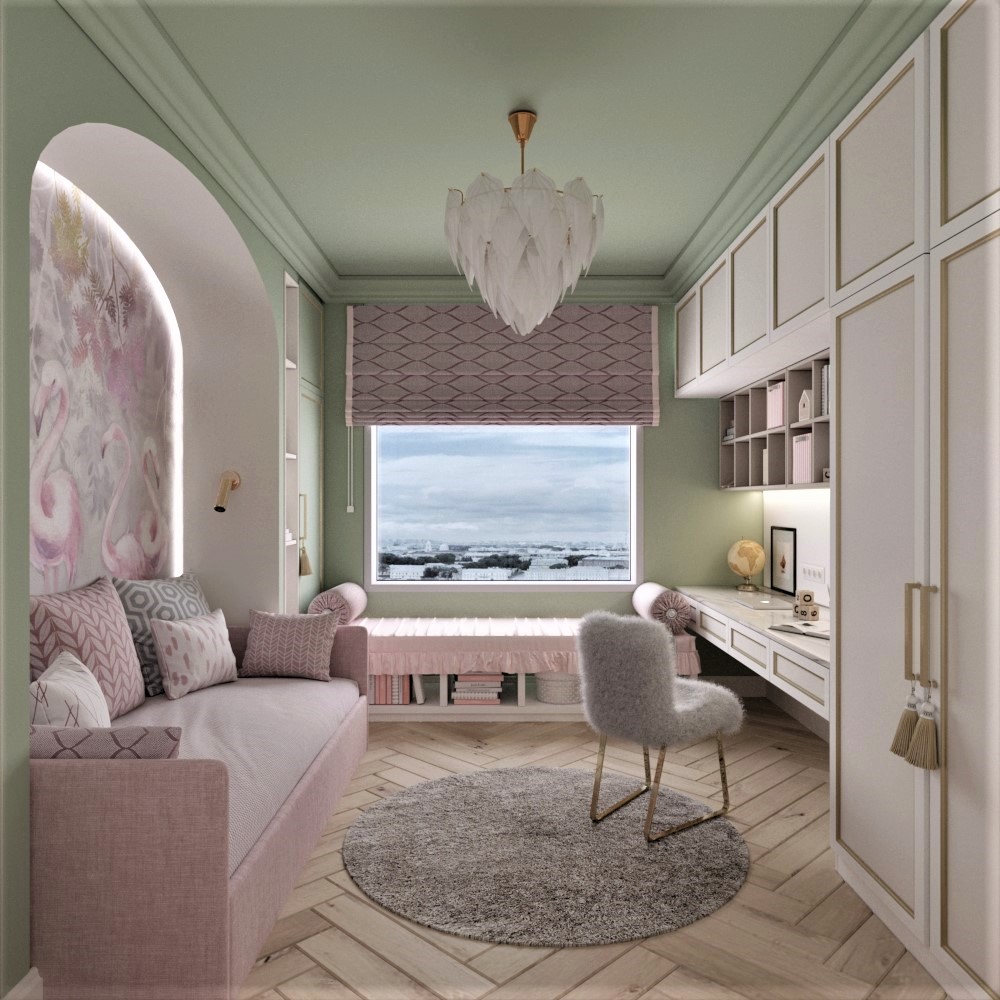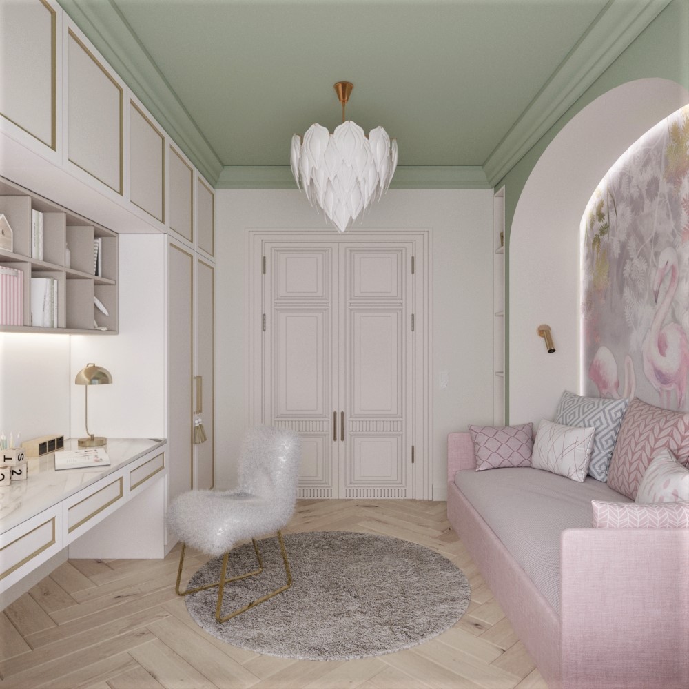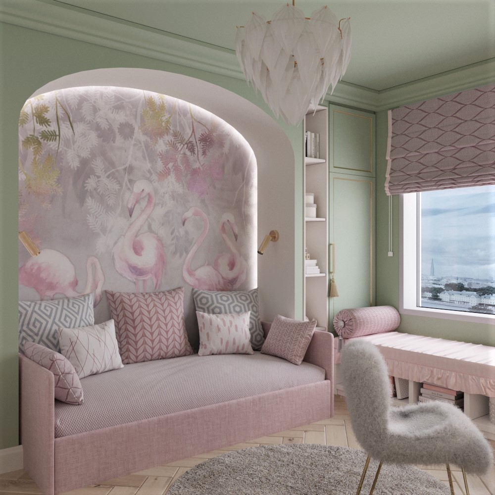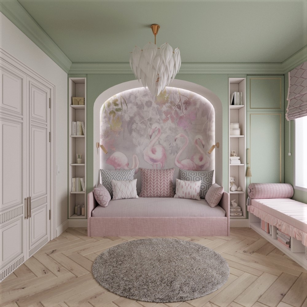 Проект детской комнаты для девочки, ЖК «Platinum» в современном классическом стиле. Обои из коллекции «Arbre». С полотен коллекции открываются загадочные сады и будто слышится звонкое пение птиц. Хочется как следует рассмотреть пугливых зебр и восхитительных фламинго, спрятавшихся за деревьями. Вдохновившись этими пейзажами, ваш внутренний писатель или художник обязательно проснётся и начнёт творить красоту!