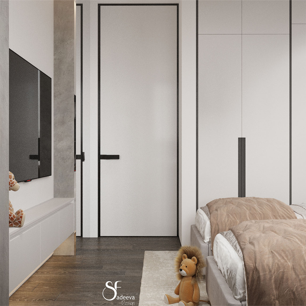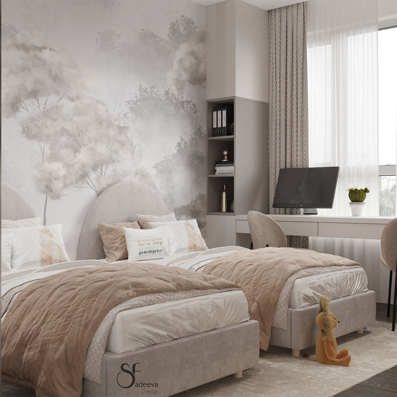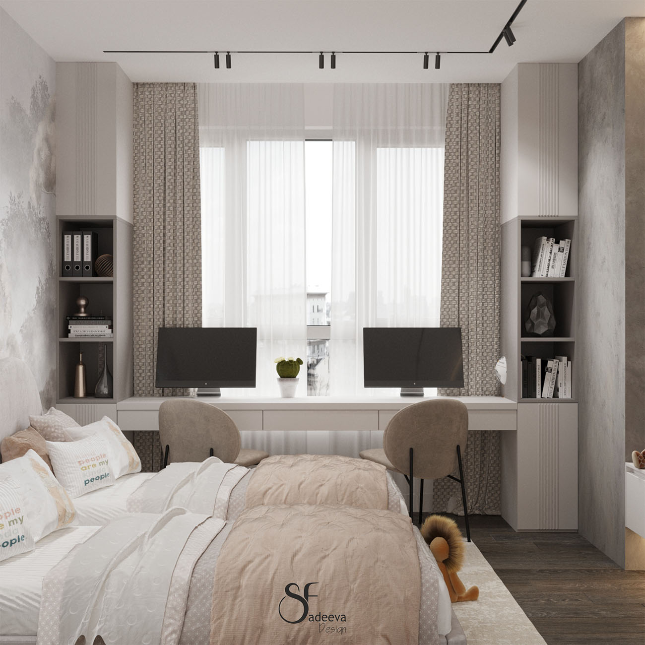 Детская площадью 13,2 м² в ЖК «Айвазовский» г. Владивосток. Комната с гардеробной и большой рабочей зоной была разработана для двух сестер. Задачей было создать интерьер, который не потеряет актуальность и тогда, когда девочки станут старше.