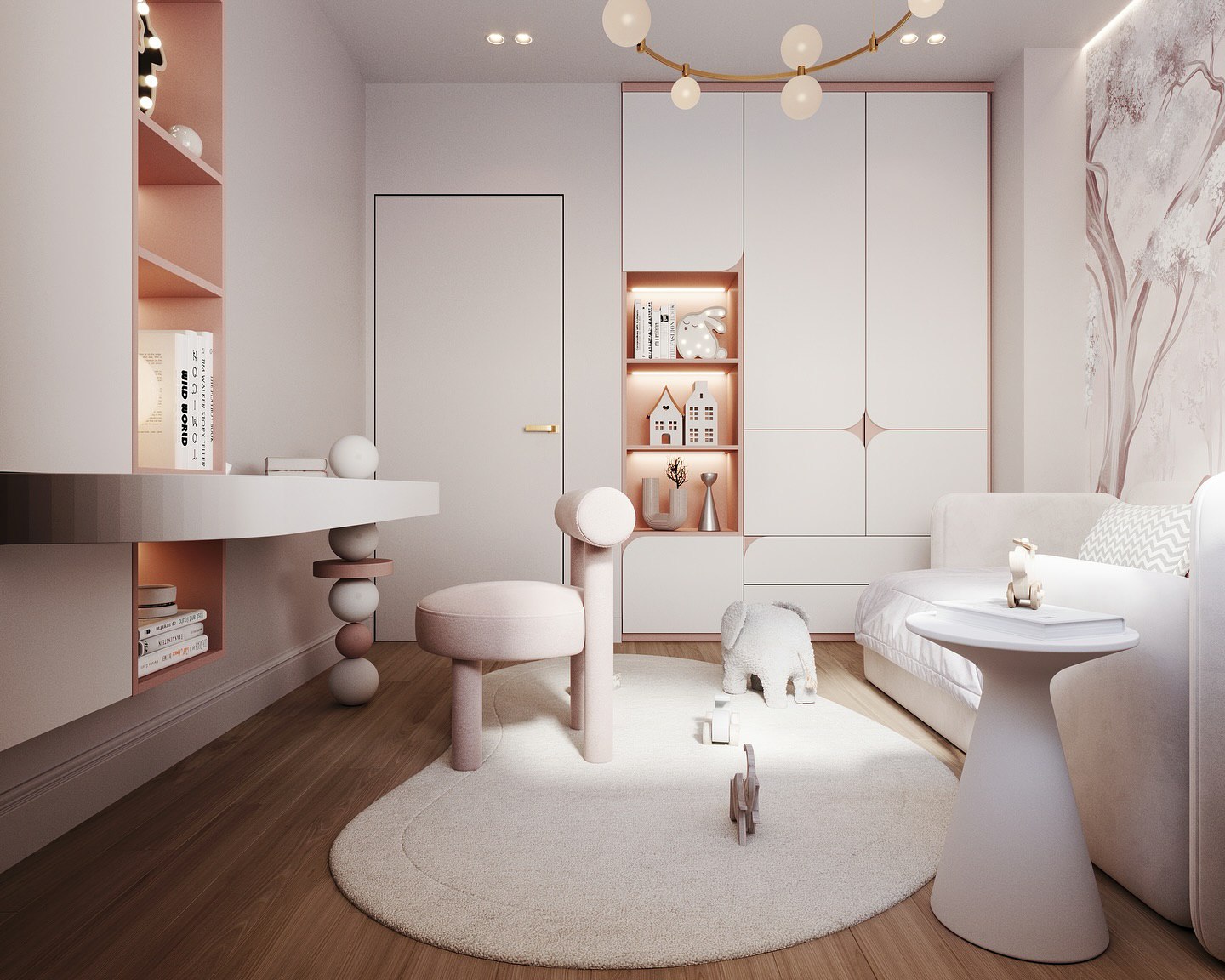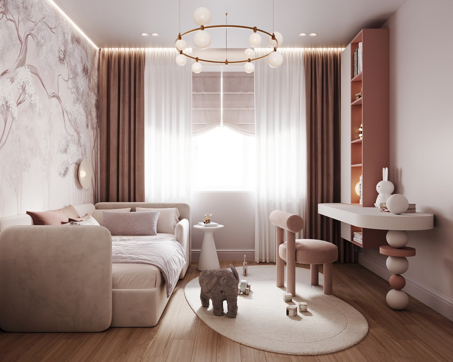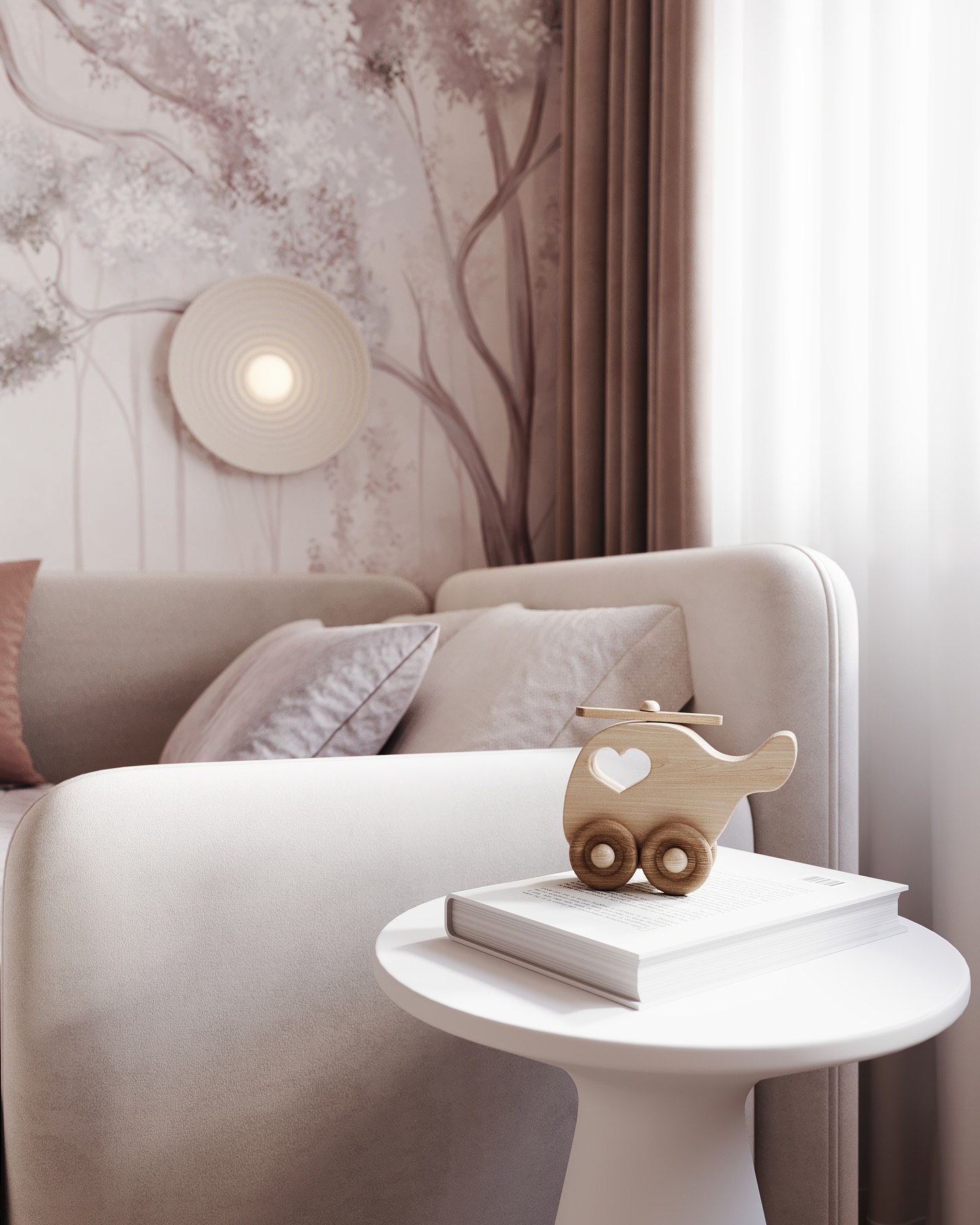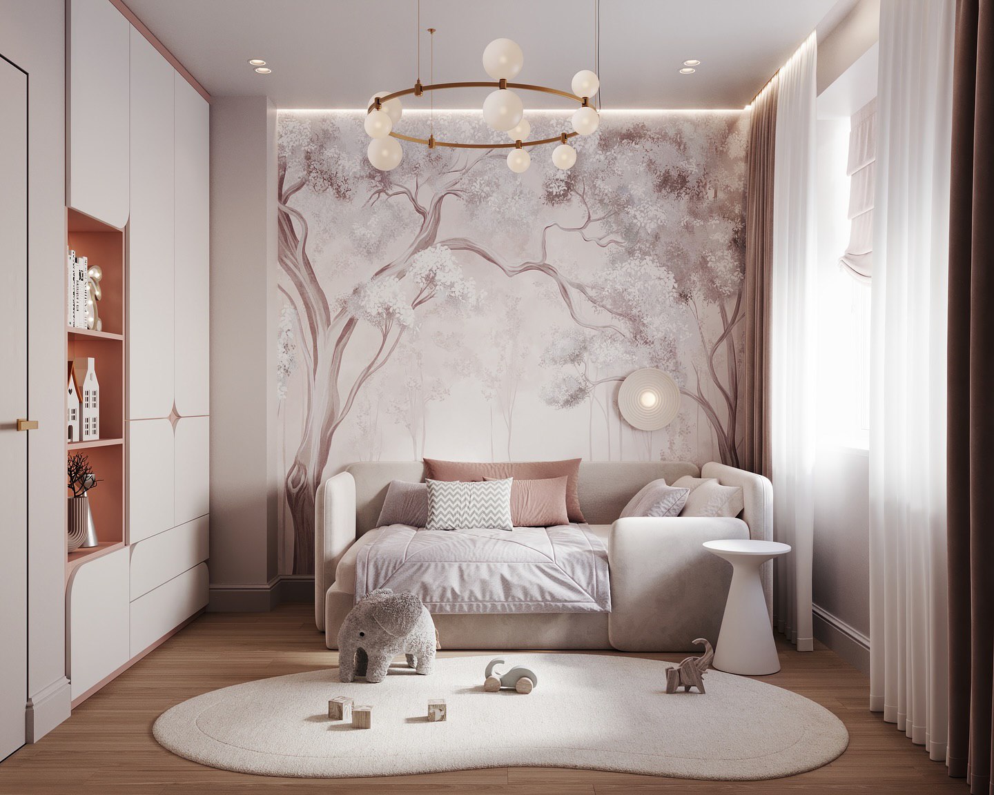 Детская комната с обоями из коллекции Arbre 22. В переводе с французского Arbre означает «дерево». Основная художественная задумка коллекции — сочетание классических пейзажных сюжетов, популярных для традиционных фресок, и скандинавской стилистики. Силуэты сказочных деревьев, романтические пейзажи, переплетающиеся ветви, колышущиеся на ветру травы и сдержанная цветовая гамма коллекции Arbre 22 придадут интерьеру соответствующую атмосферу и расставят деликатные акценты.