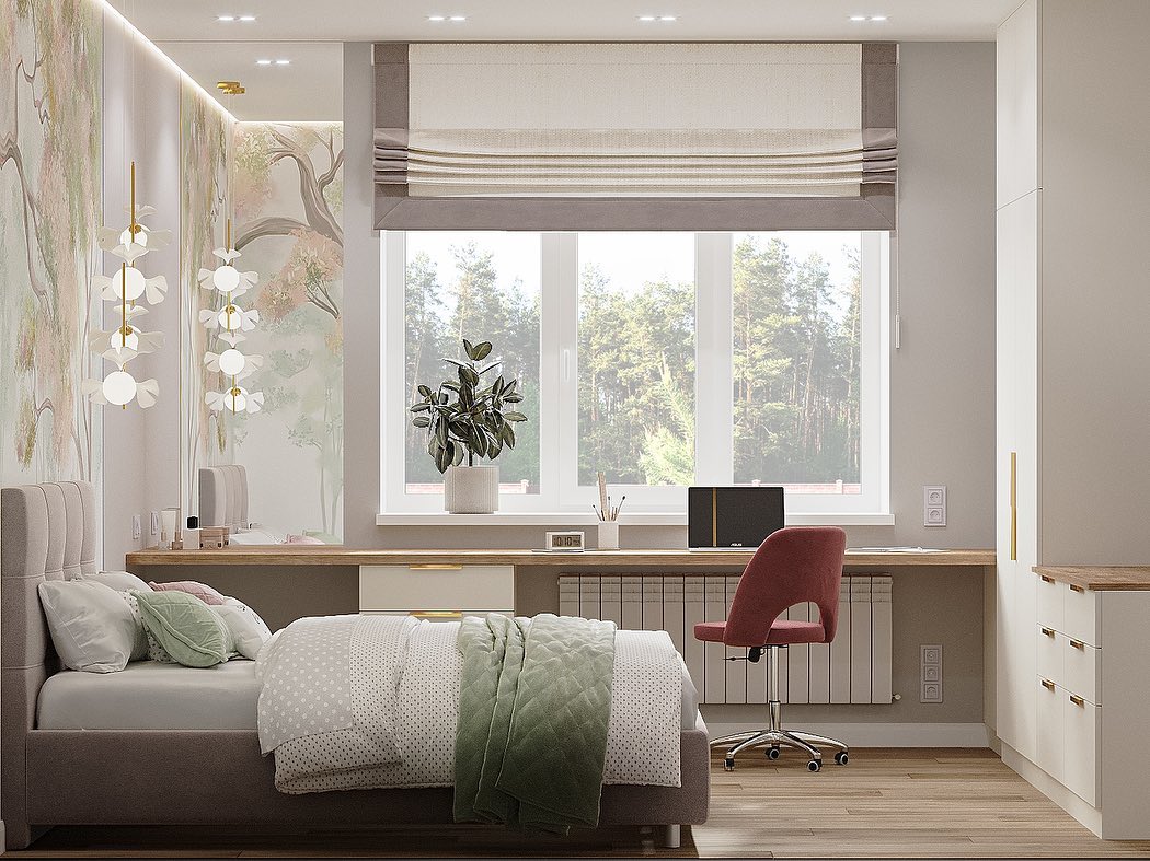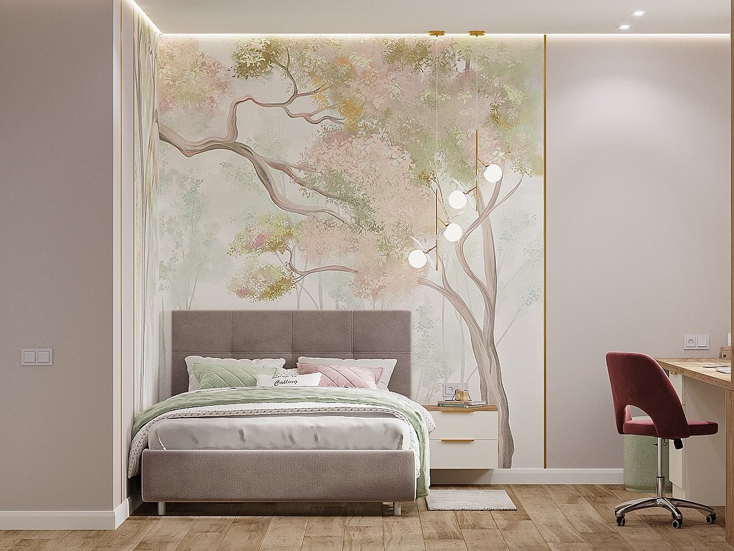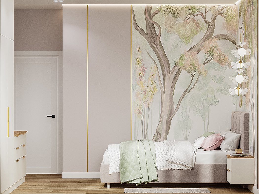 Детская комната для девочки в частном доме. Обои из коллекции ARBRE 22. Arbre означает «дерево» в переводе с французского. Основная художественная задумка коллекции — сочетание классических пейзажных сюжетов, популярных для традиционных фресок, и скандинавской стилистики. Идеальное решение для внесения нежных акцентов в интерьер в скандинавском и минималистичном стиле.