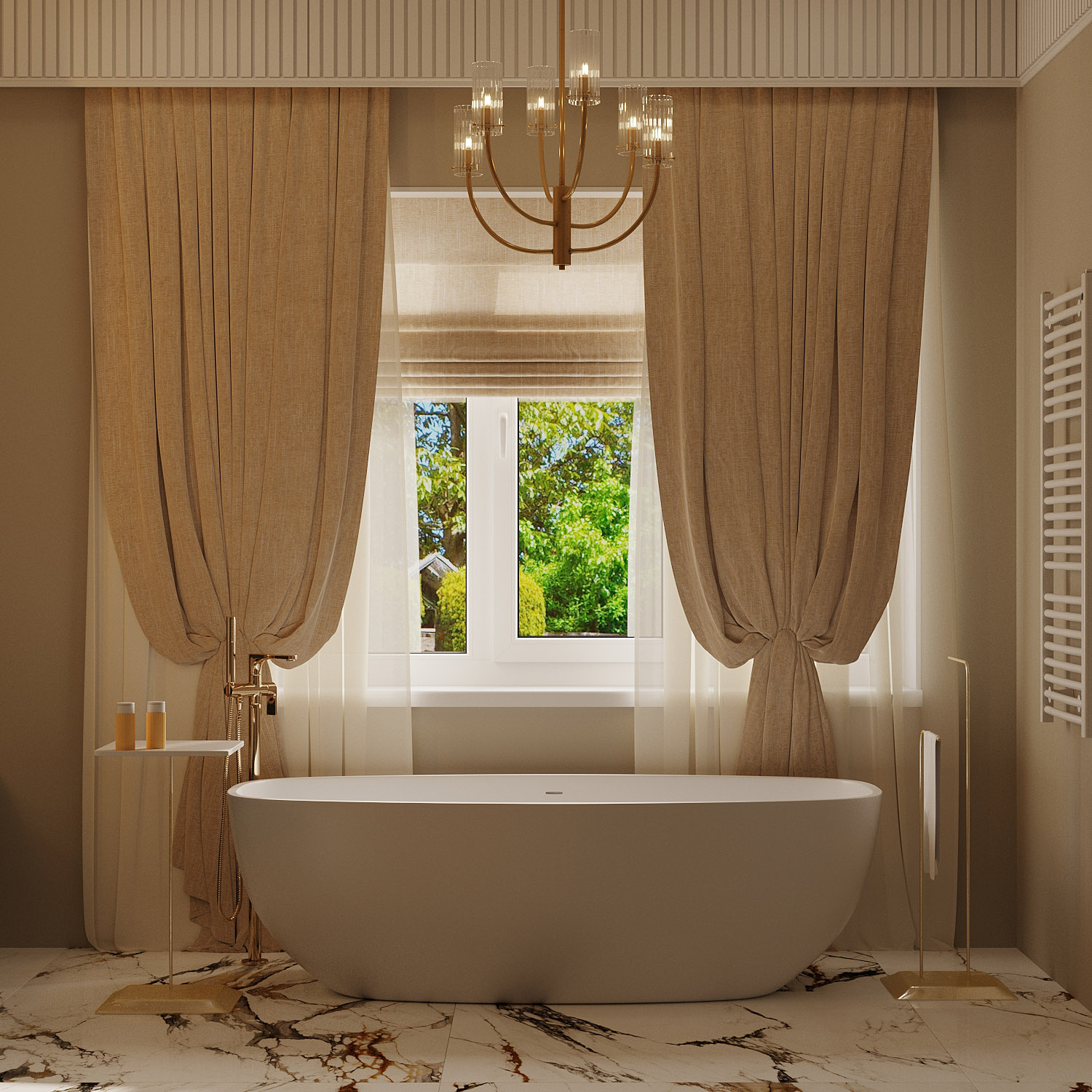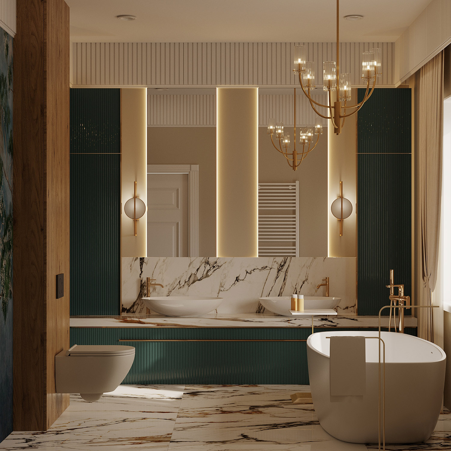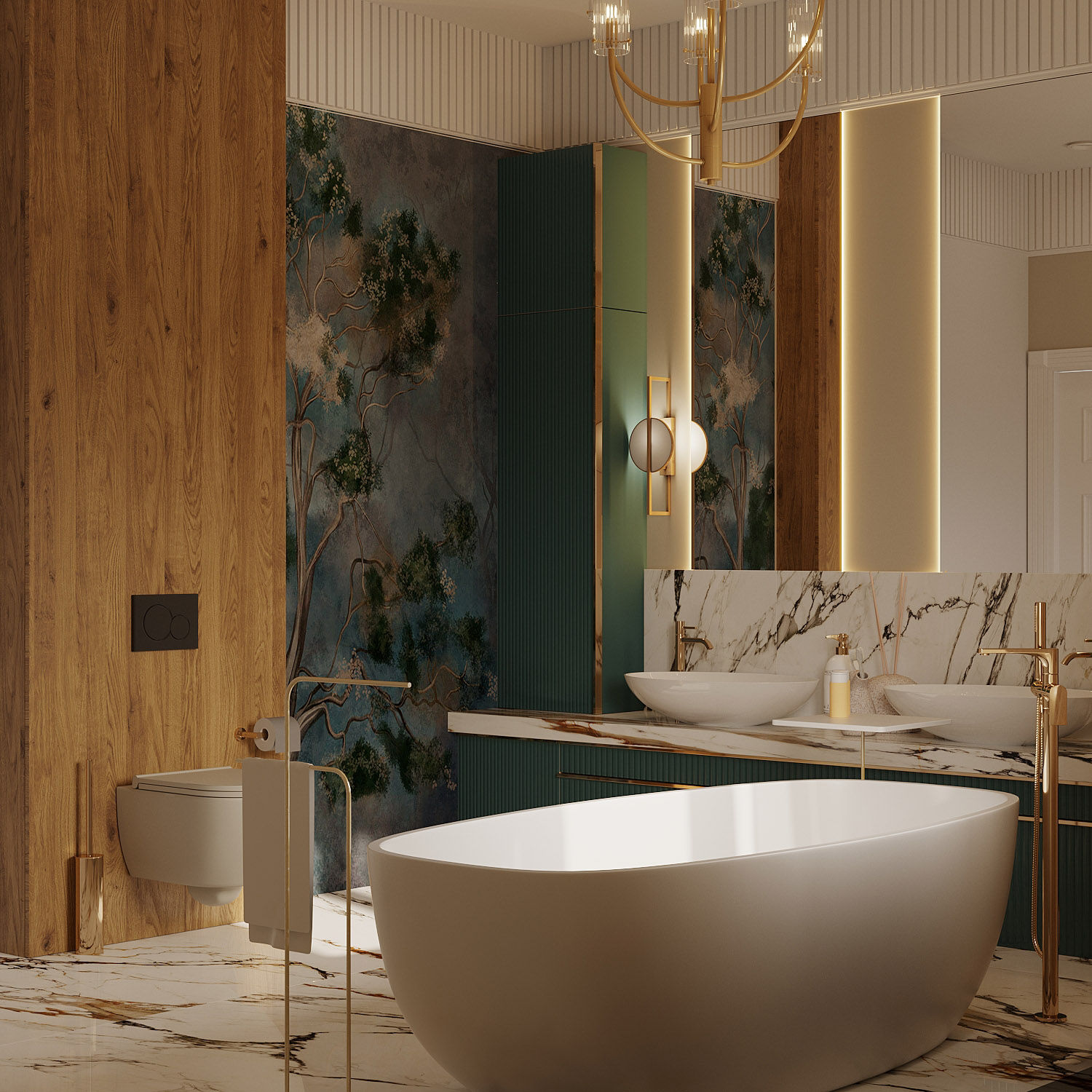 Ванная из проекта дома в г. Воронеж. Это был тот случай, когда заказчица сказала: «В ванной на стены плитки по минимуму». Посмотрите, какой глубокой, обволакивающей получилась эта ванная комната. То, что нужно для расслабления и релакса!