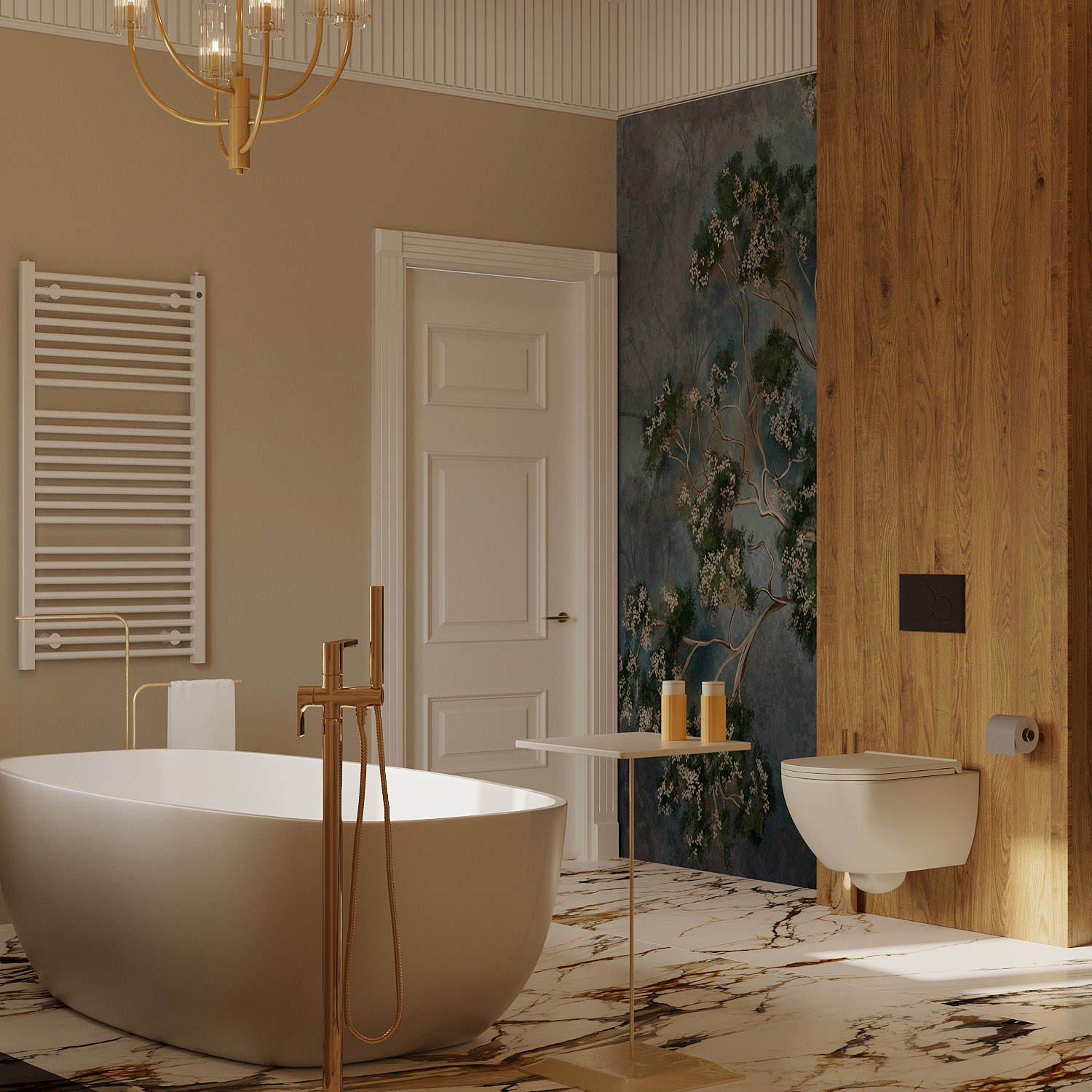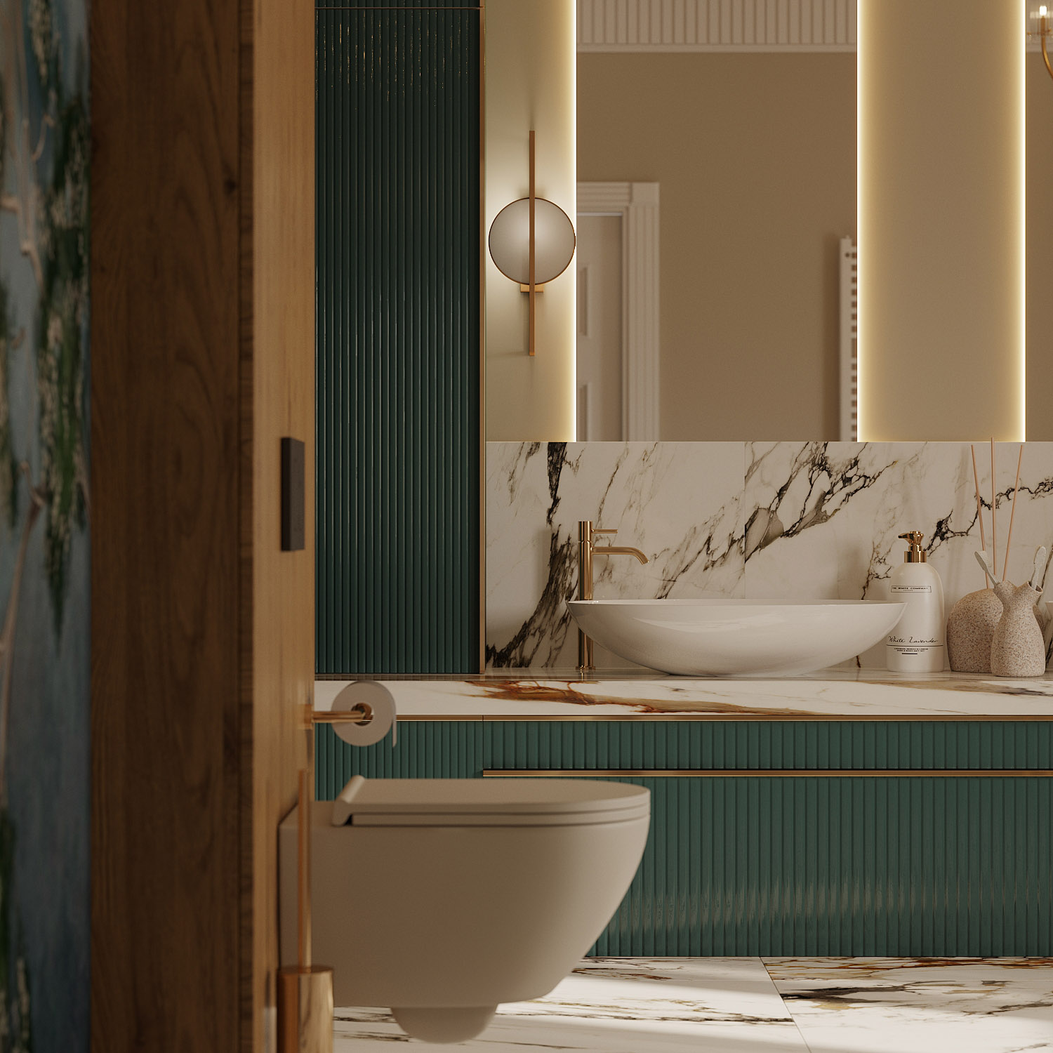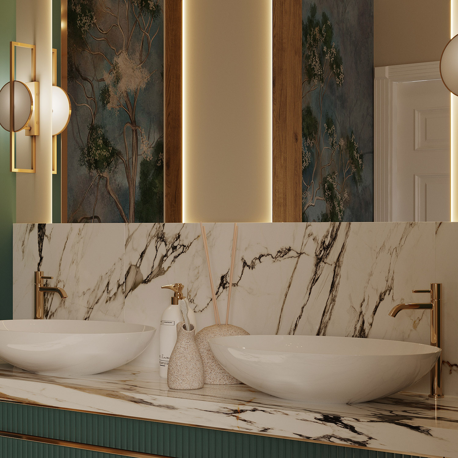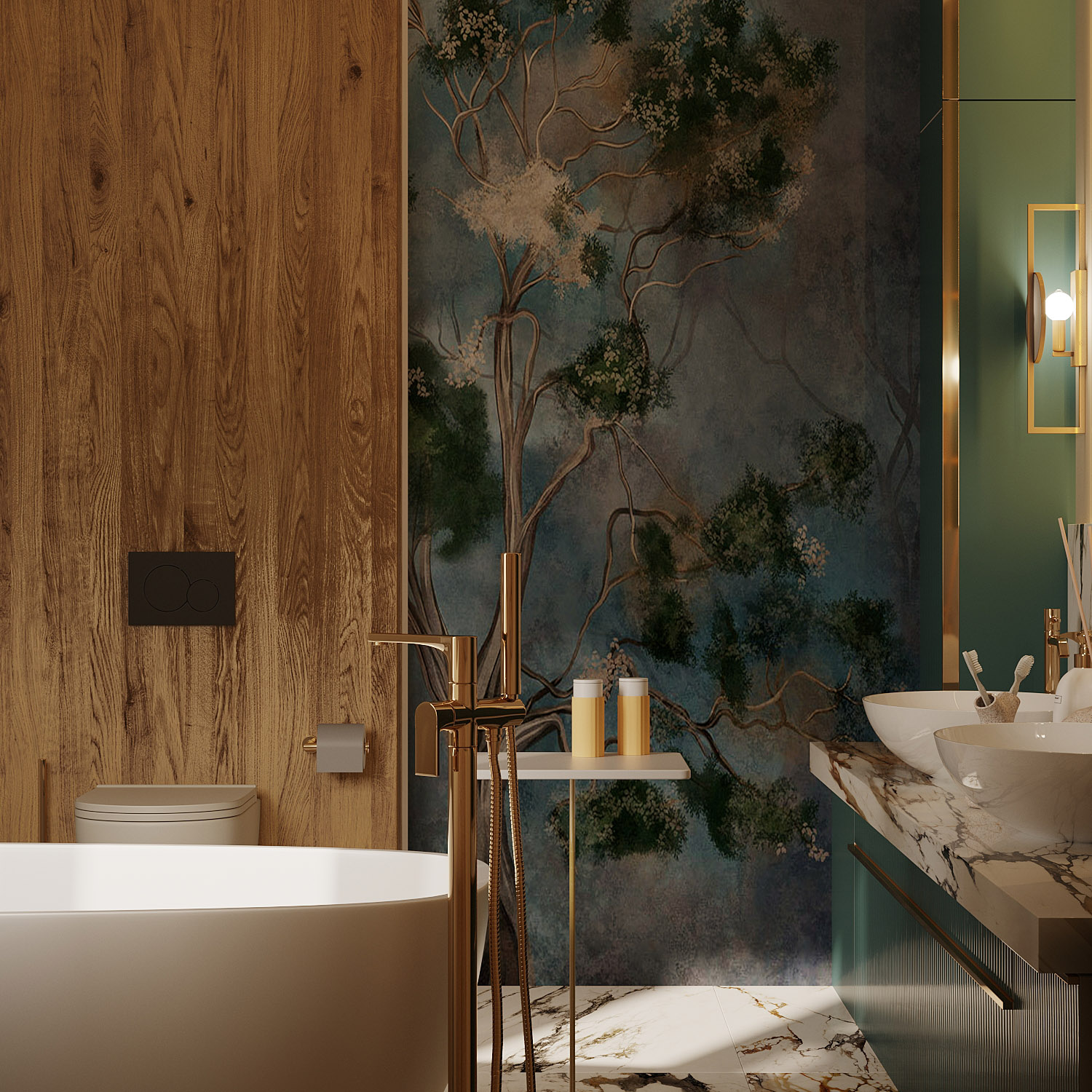 Ванная из проекта дома в г. Воронеж. Это был тот случай, когда заказчица сказала: «В ванной на стены плитки по минимуму». Посмотрите, какой глубокой, обволакивающей получилась эта ванная комната. То, что нужно для расслабления и релакса!