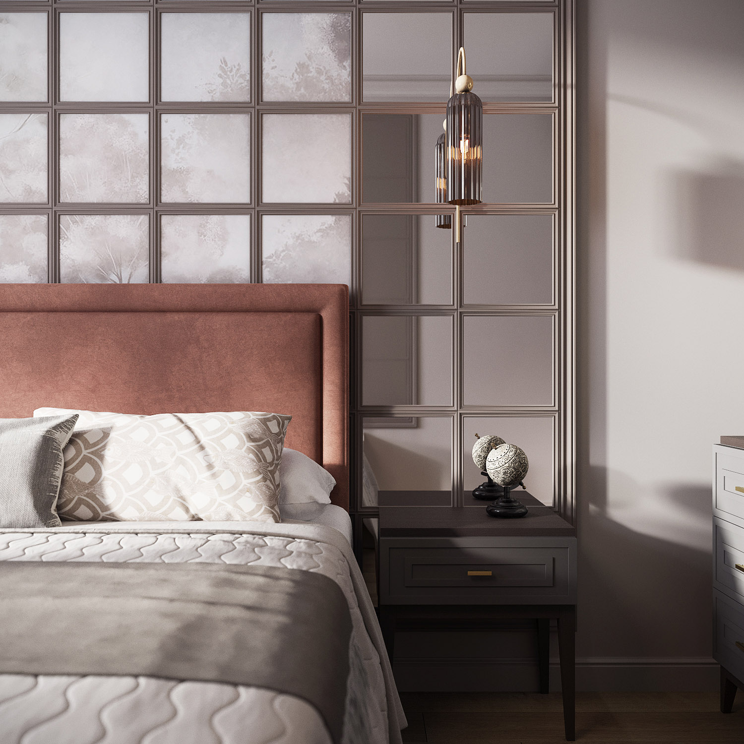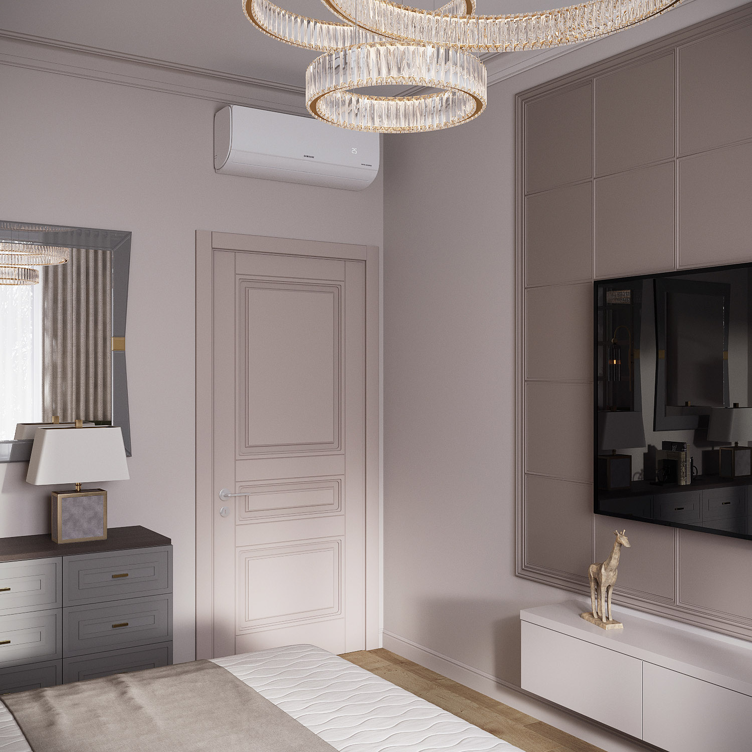 Лаконичность, строгость линий, мягкая цветовая гамма, продуманный комфорт – именно так можно охарактеризовать дизайн этой спальни в ЖК Дом у реки Тушино. Проект был выполнен для взрослых людей, которые переезжают в Москву, чтобы быть поближе к детям и помогать им в воспитании внуков. Чтобы интерьер получился визуально просторным, были использованы фирменные дизайнерские примы с зеркалами и нестандартная расстановка мебели. Необычным решением стала зеркальная раскладка в изголовье кровати в сочетании с фреской. На полу в квартире использован техно массив. Зону ТВ украшает паровой камин.