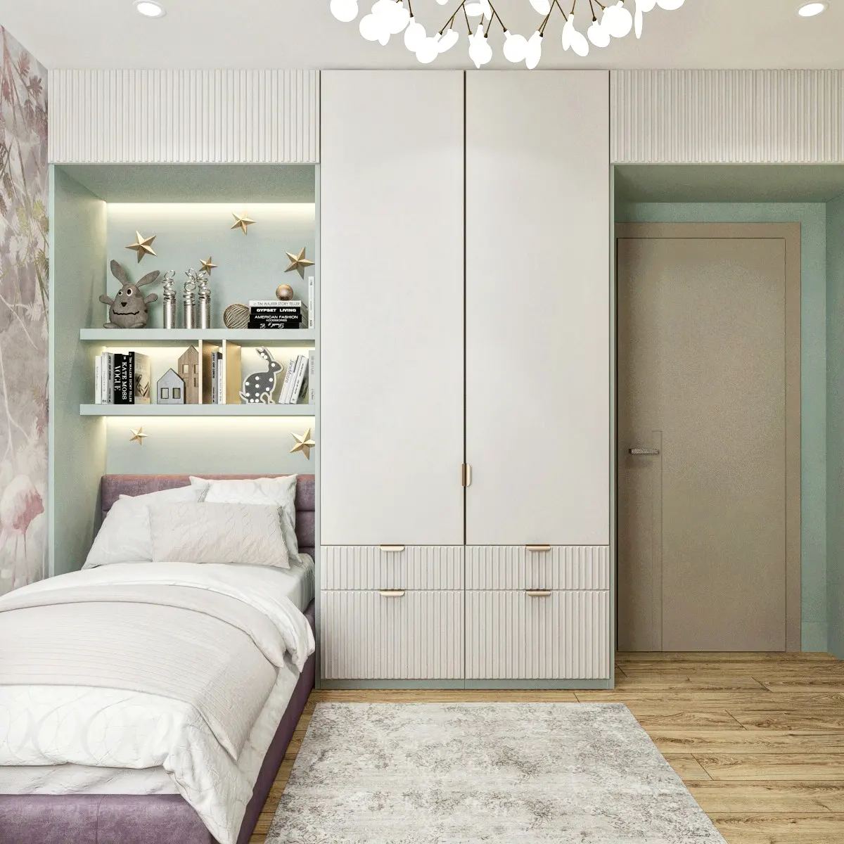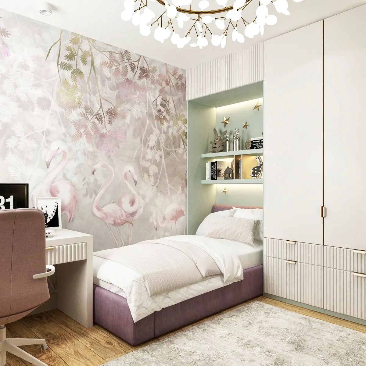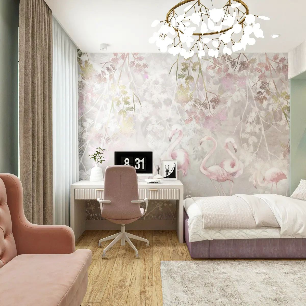 В детскую для творческой девочки выбрали нежные и пудровые оттенки. Поддержали это решение обоями с фламинго из коллекции «Arbre».