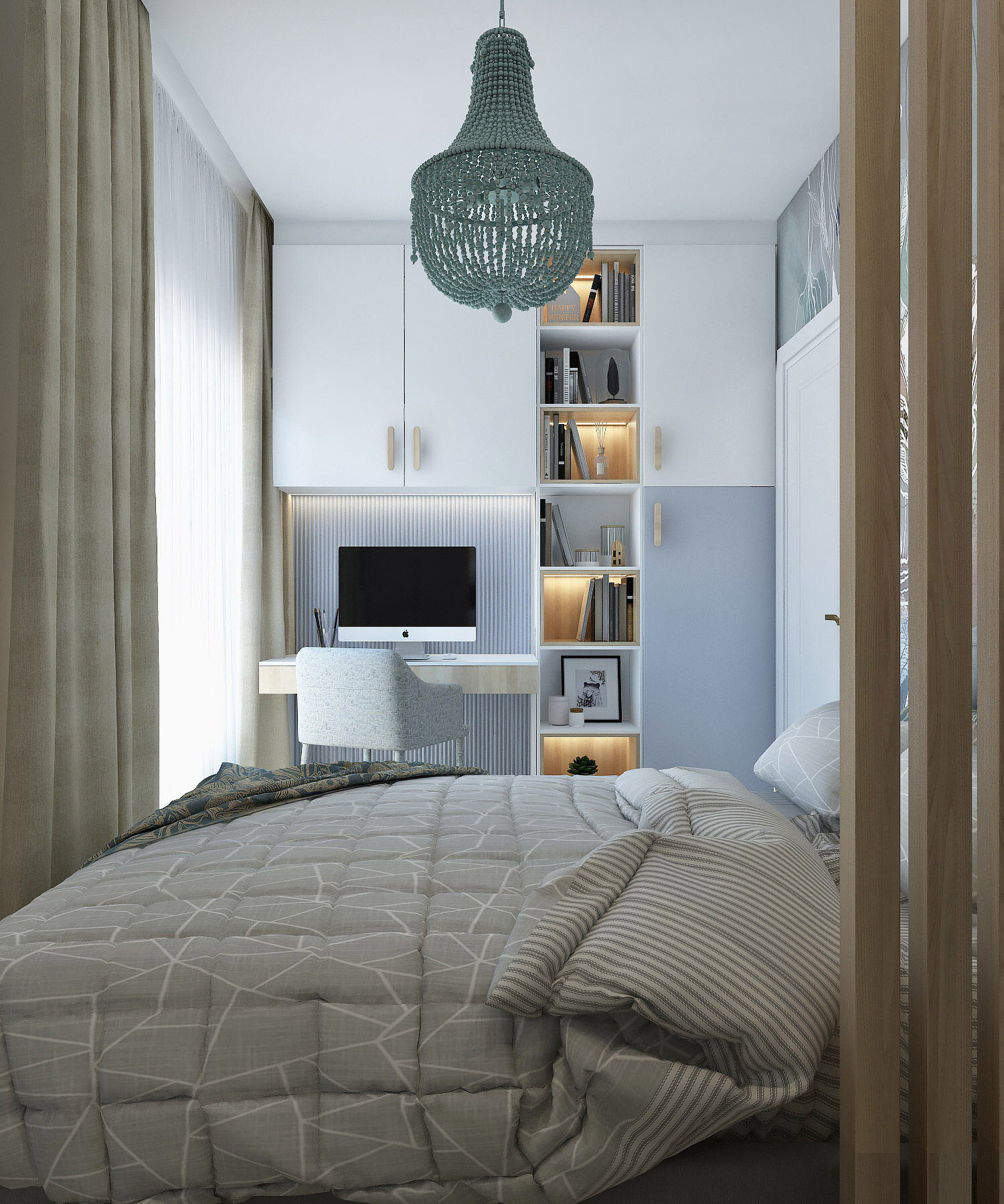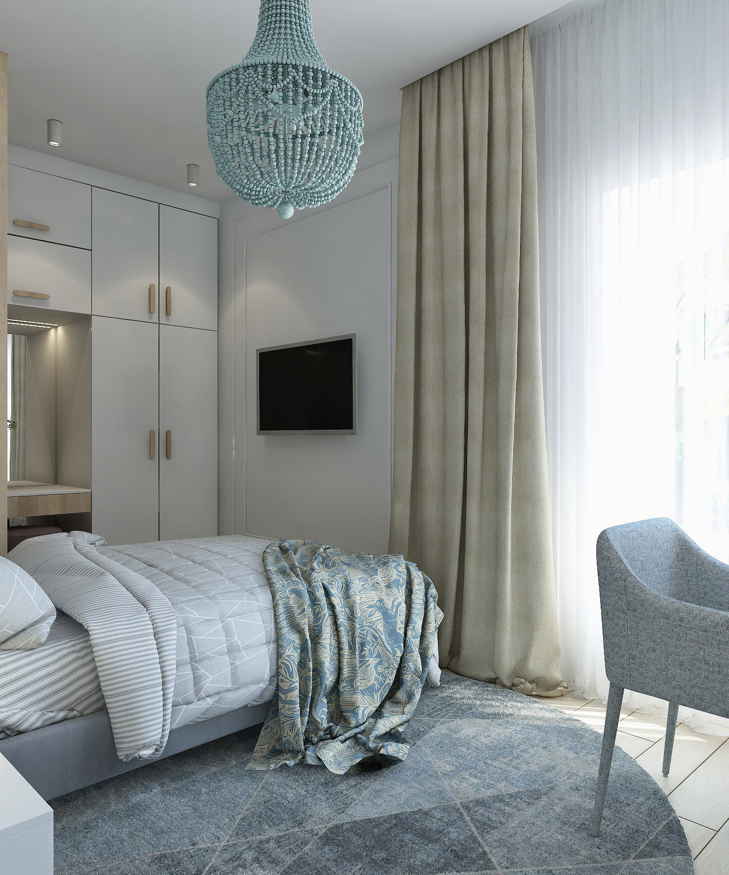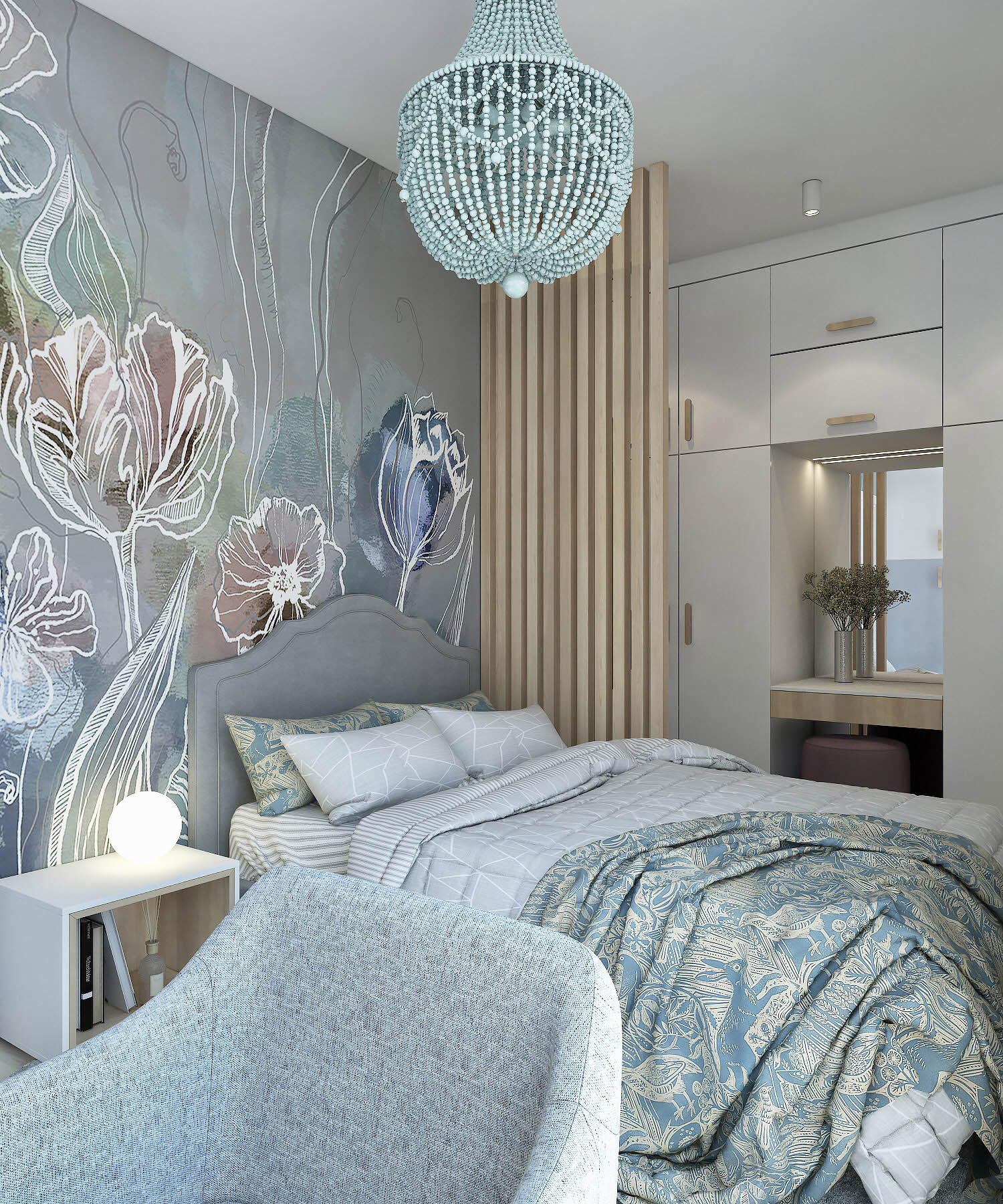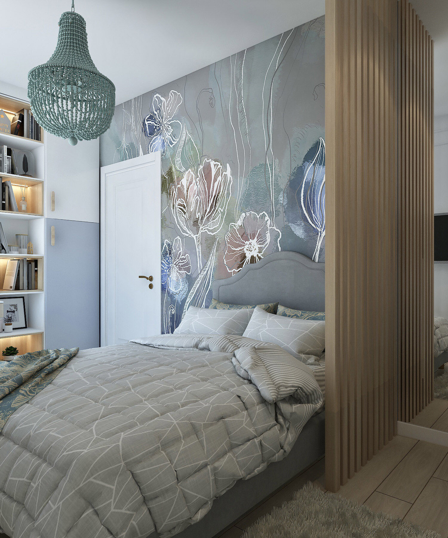 10 минут понадобилось заказчику, чтобы утвердить этот интерьер! Обои «Astral 22» отлично вписались по цветовой гамме и настроению, добавив комнате нежности и уюта.