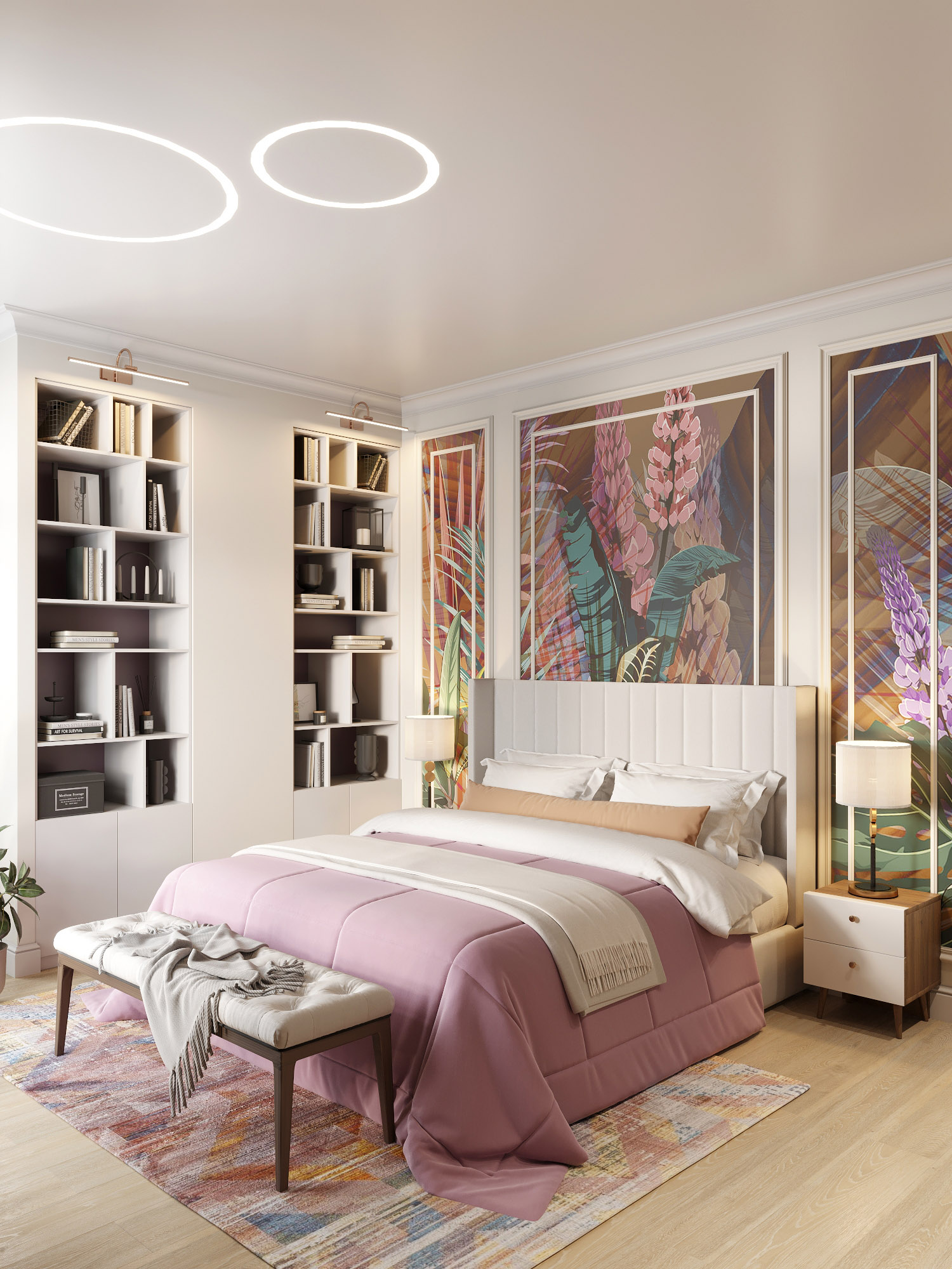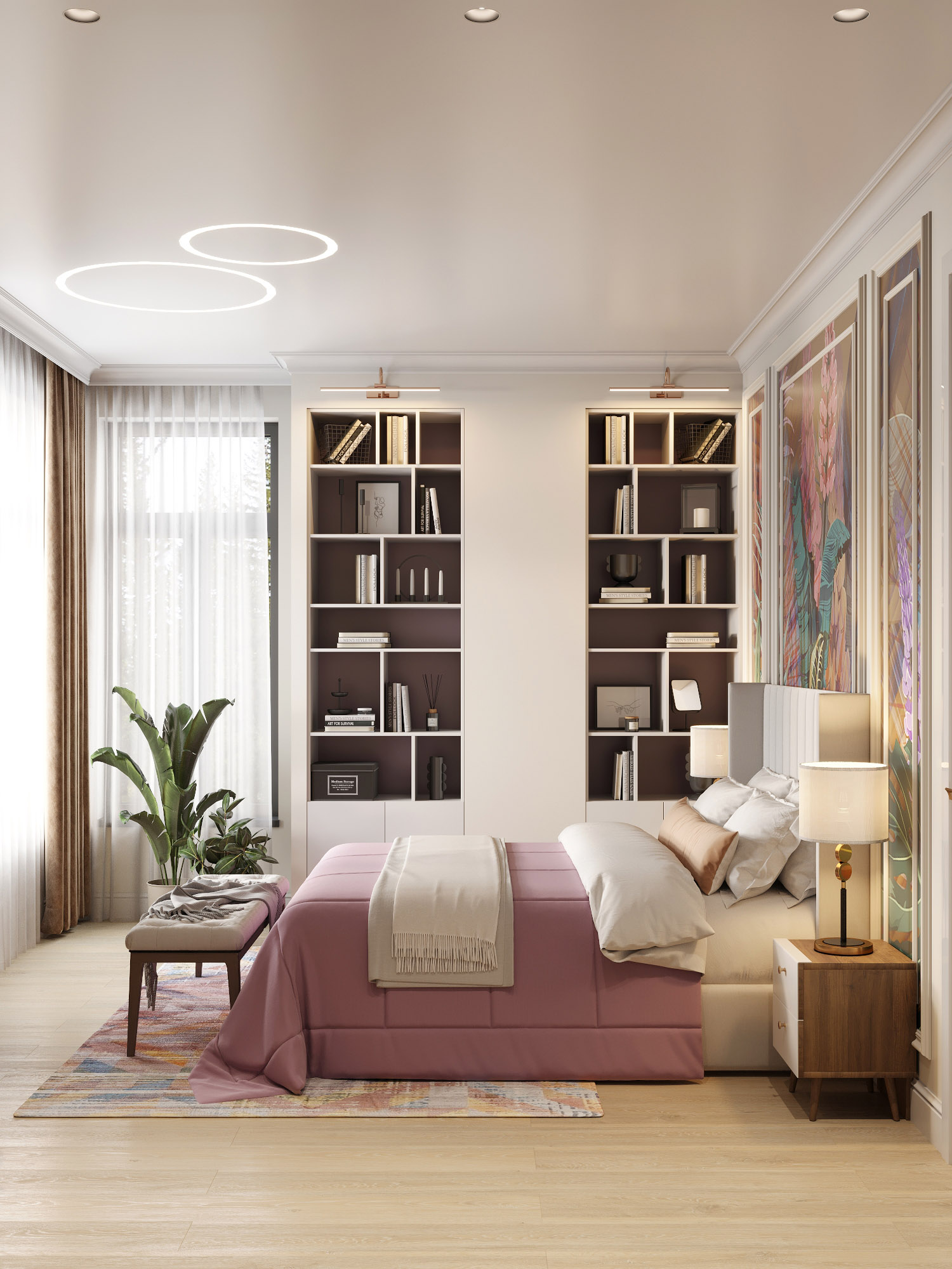 Проект спальни площадью 20 м². Акцент сделан в изголовье кровати из сочетания обоев «Astral» и молдингов. А полки на стене возле кровати появились там не случайно — так дизайнер обыграл короб, в котором спрятана каминная труба!