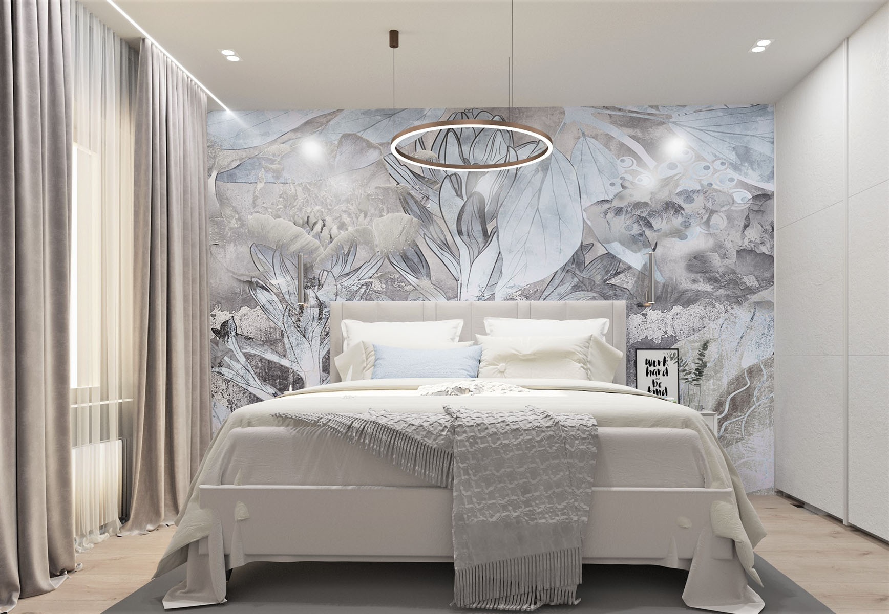 Спальня площадью 13,4 м² в городе Барнаул для молодой семейной пары. Пожелание заказчиков — использование нежных цветов, легкость и воздушность. Обои из коллекции ASTRAL помогли воплотить задуманное в жизнь, став нежным акцентом комнаты.