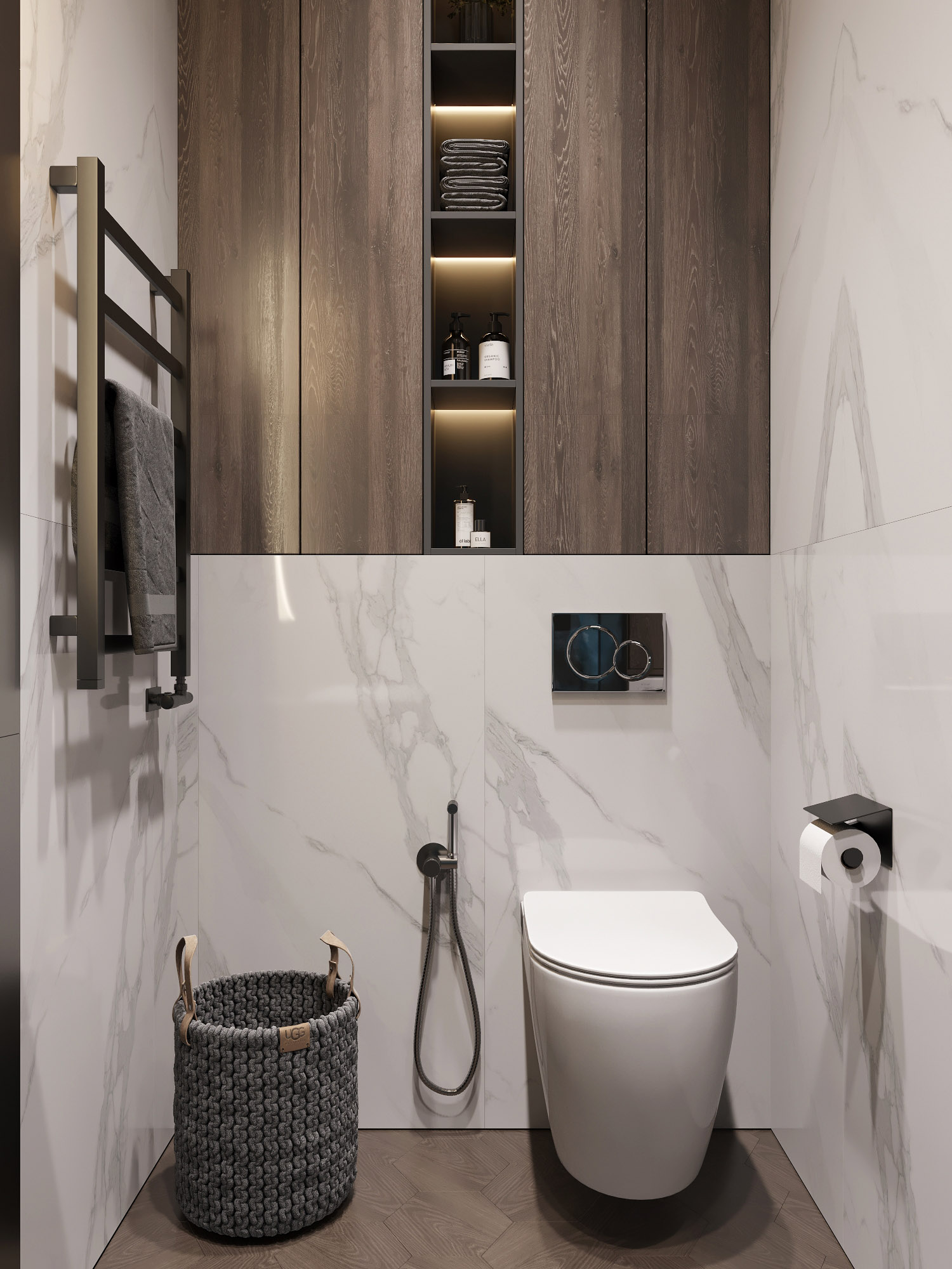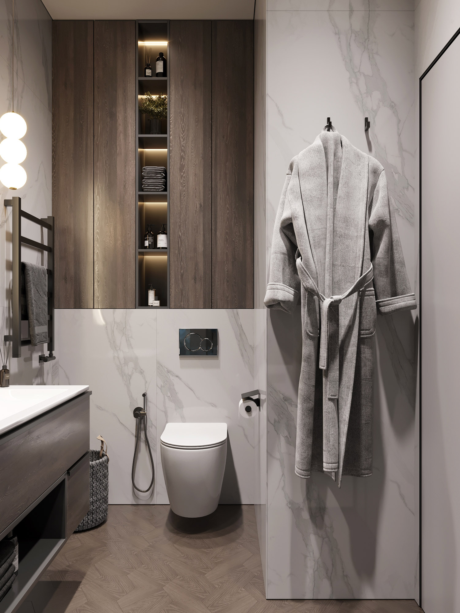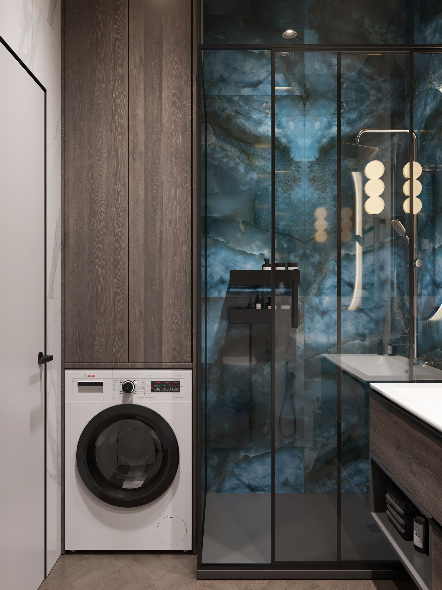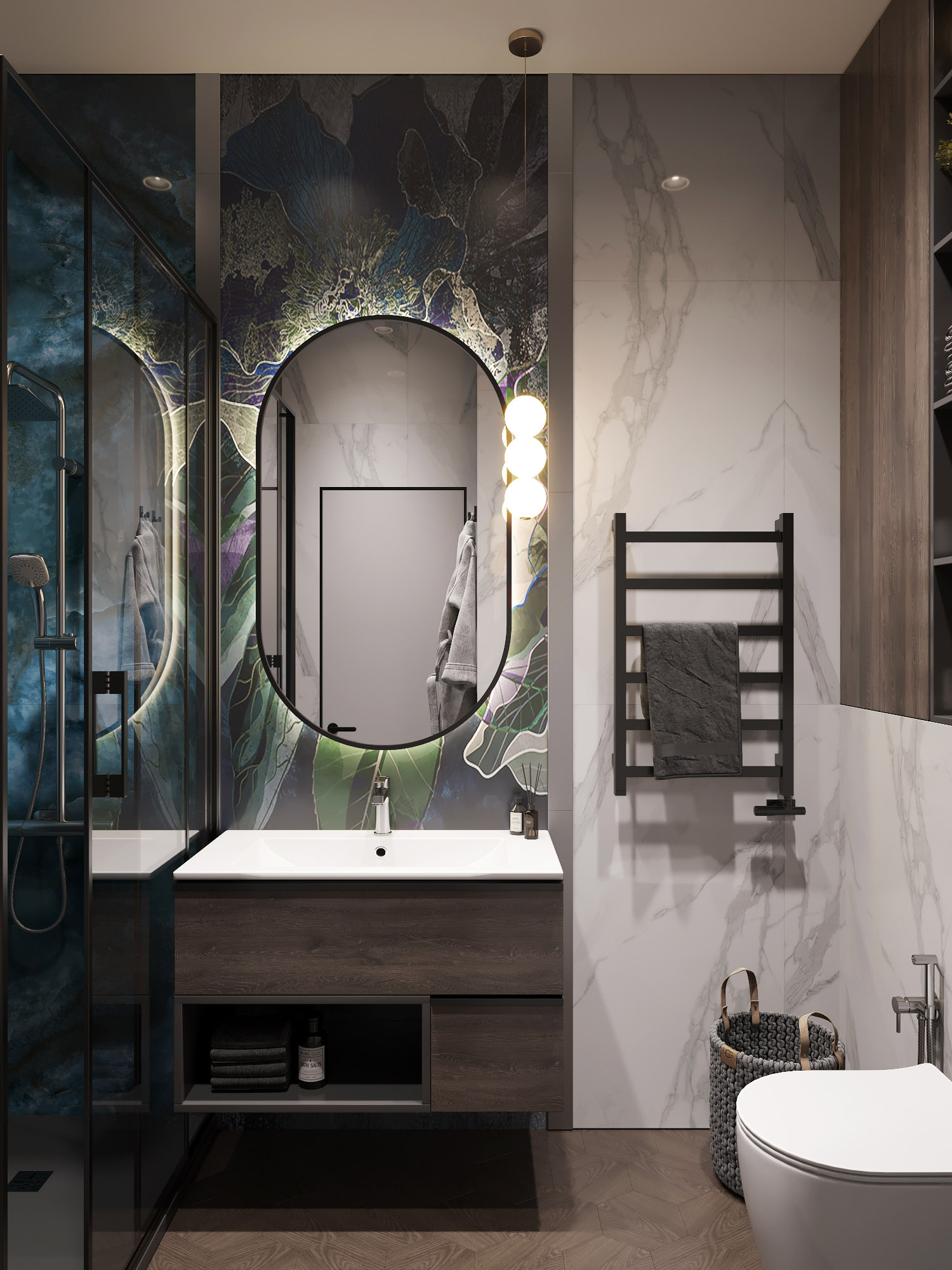Ванная комната для семейной пары с применением ярких красок, но при этом в сдержанном стиле. Обои из коллекции «Astral».