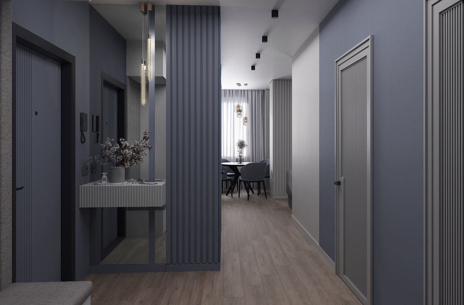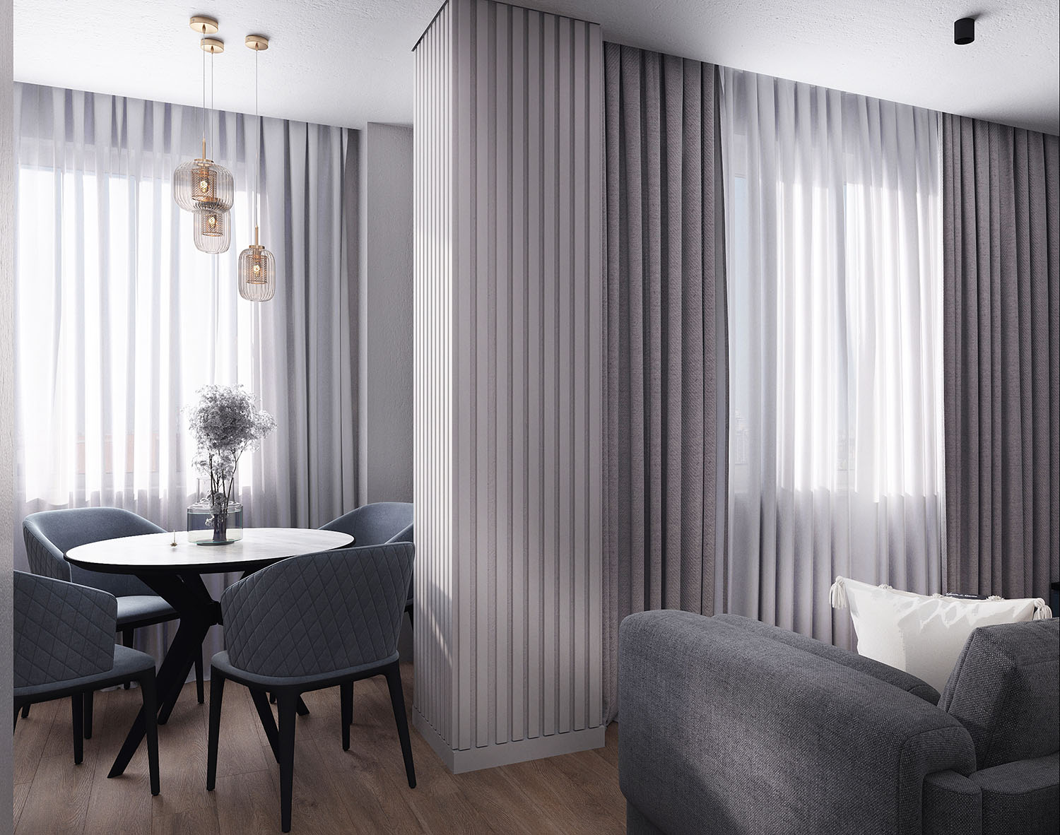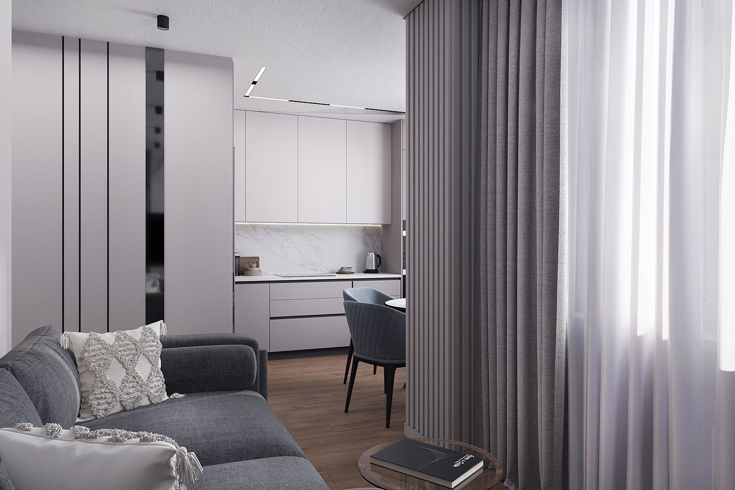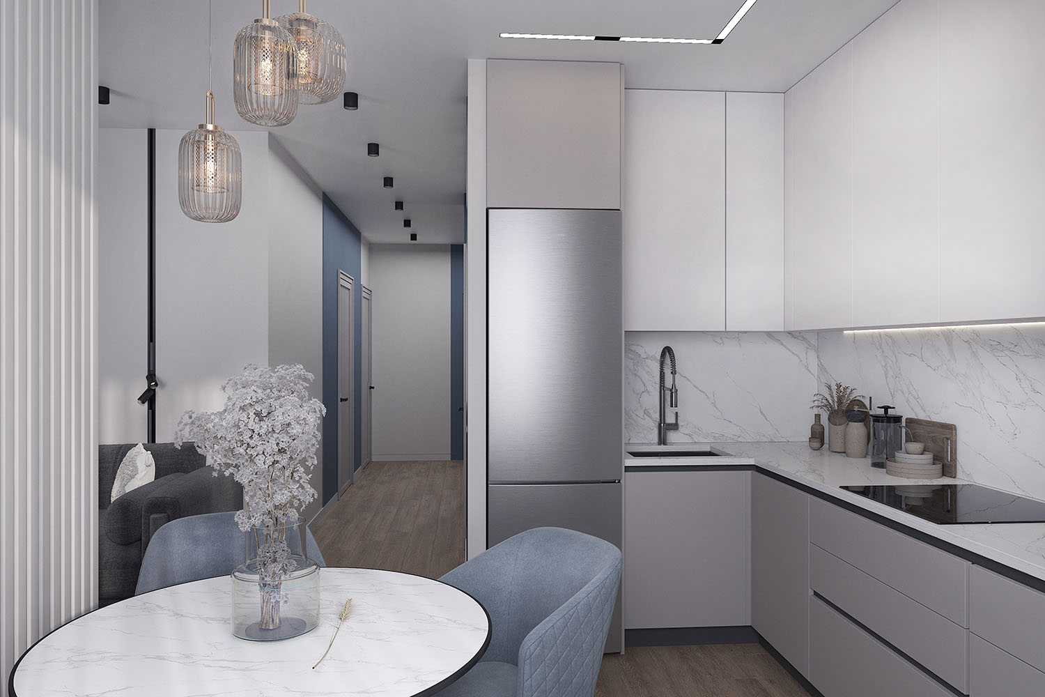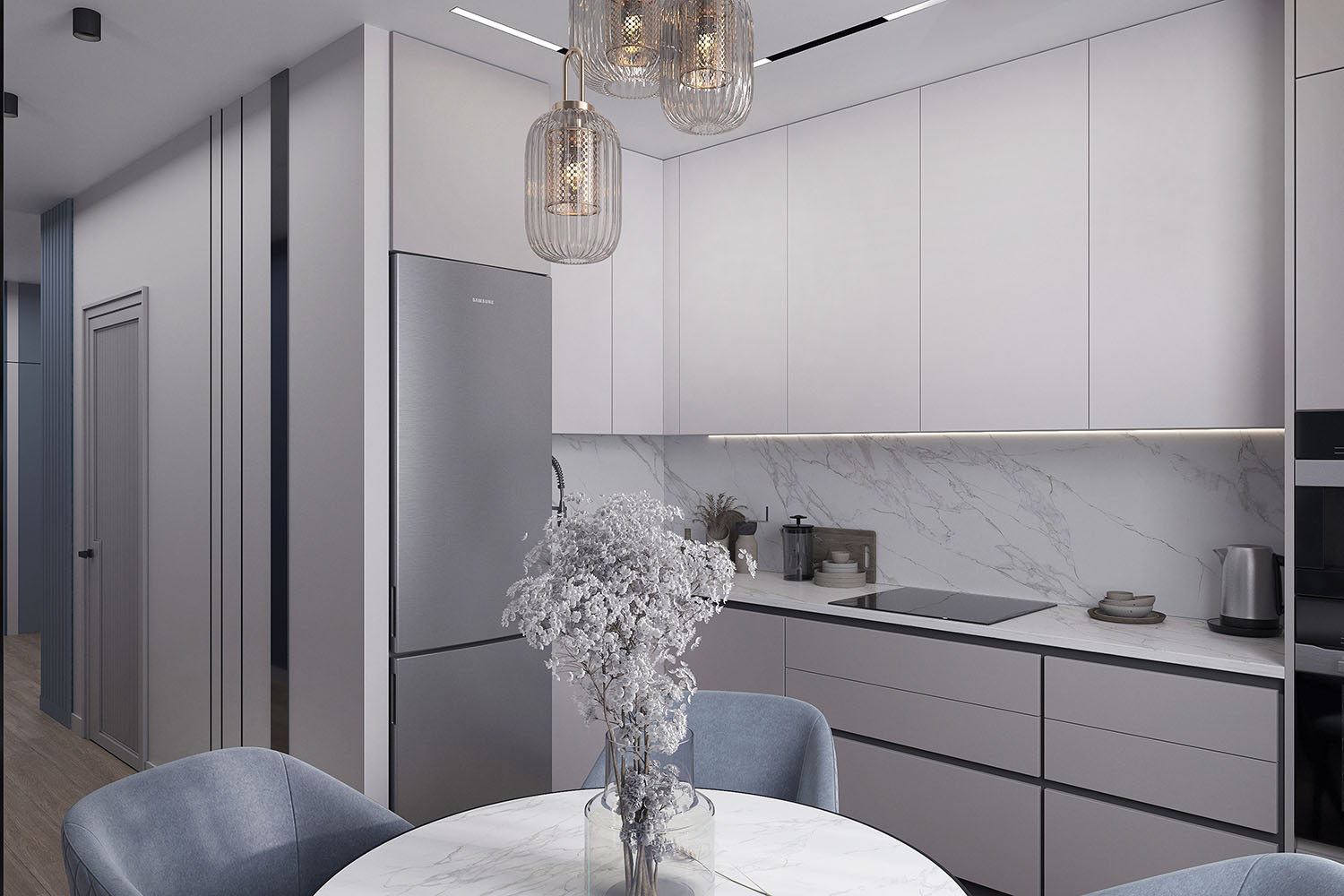Кухня-гостиная в современном стиле. В интерьере гармонично сочетаются светло-серые оттенки с припыленно-голубым цветом. Обеденная зона выделена дизайнерскими обоями из коллекции BELLA и поддержана стальными светильниками. Получилось изящно.