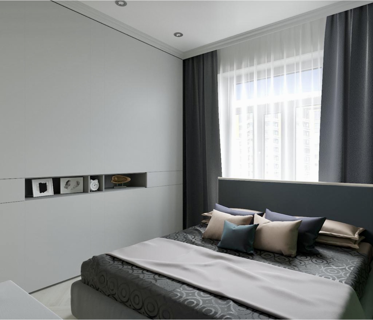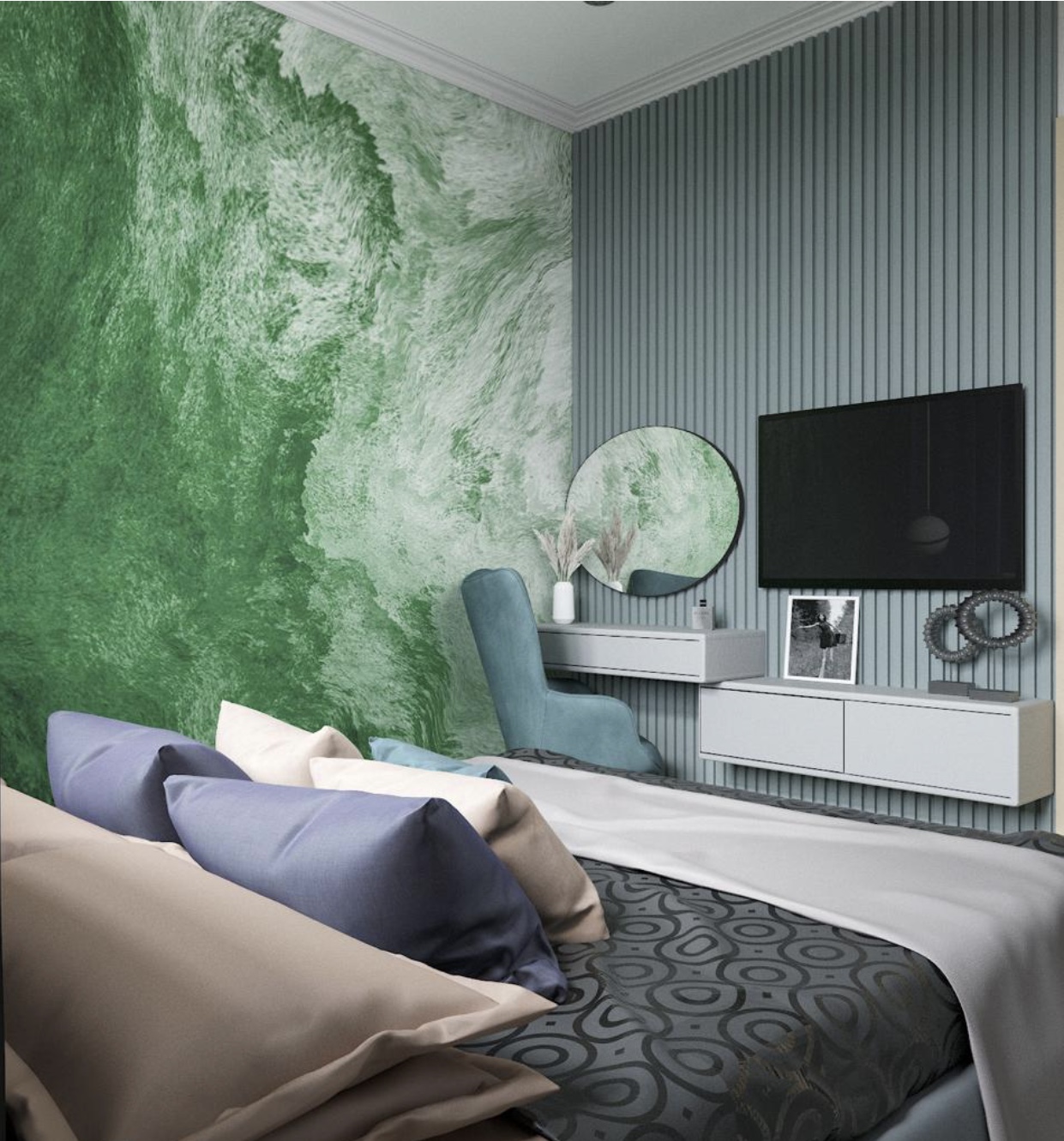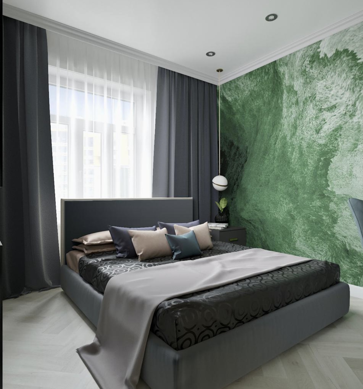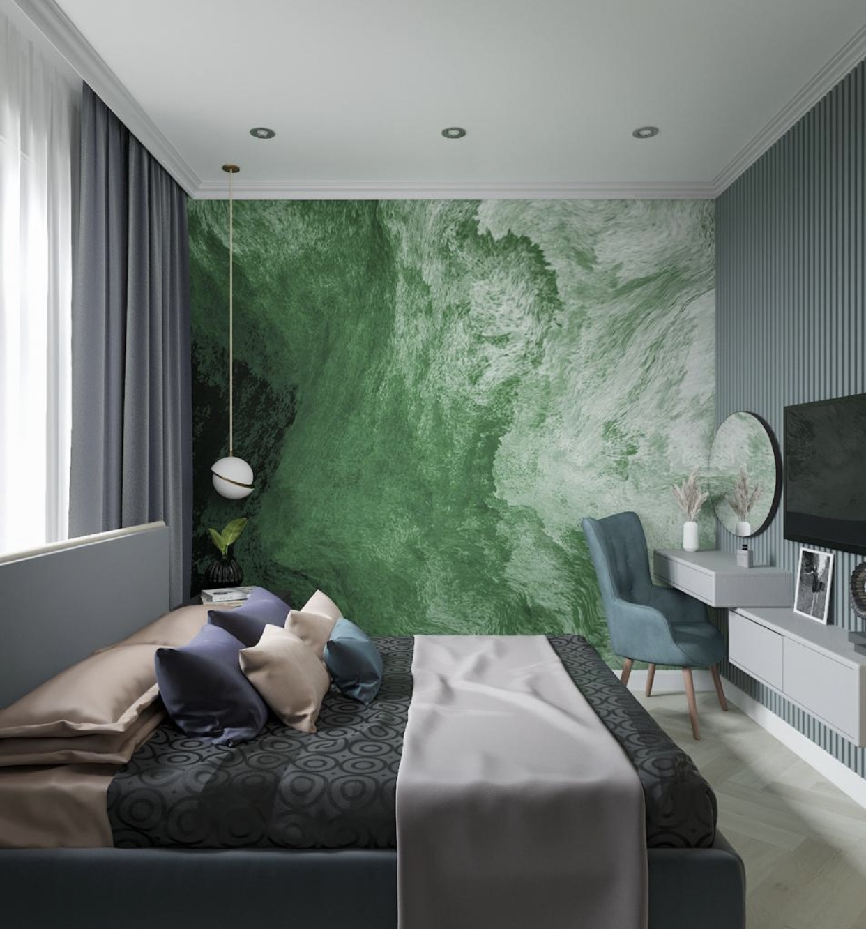 Дизайн-проект спальни разрабатывался для молодой девушки из Барнаула. Заказчице нравятся зеленый и серый оттенки, что отразилось на цветовой гамме комнаты. Обои из коллекции Beryozi I Vodopady подошли по цвету идеально, став ярким акцентом и дополнив нейтральный серый.