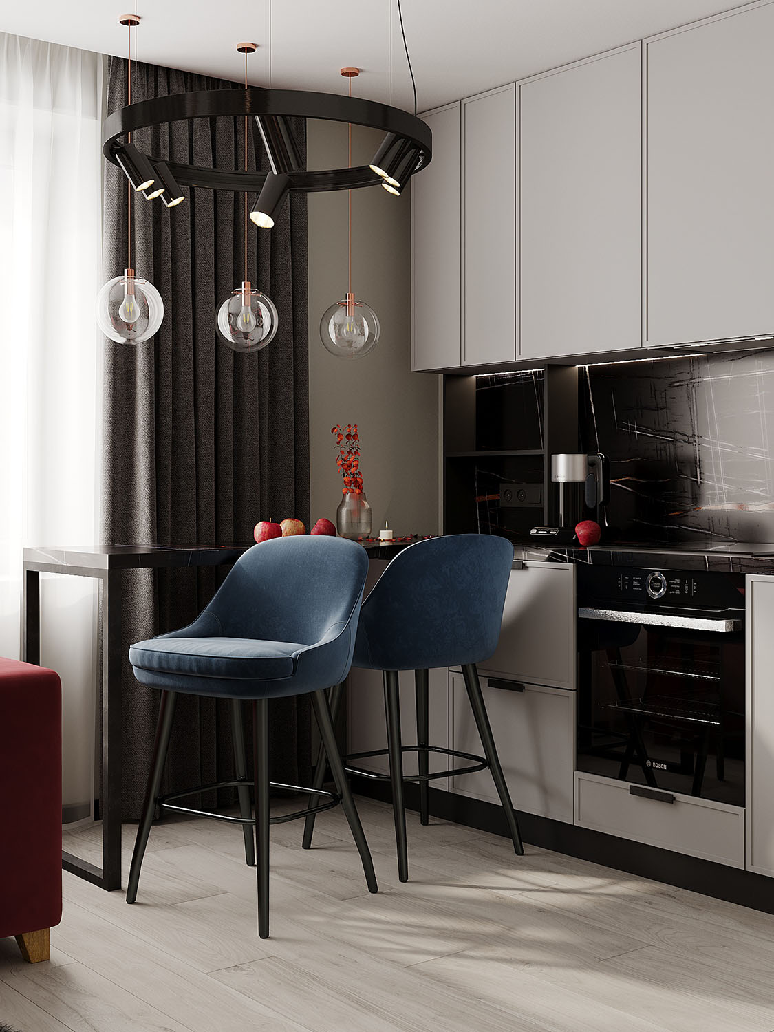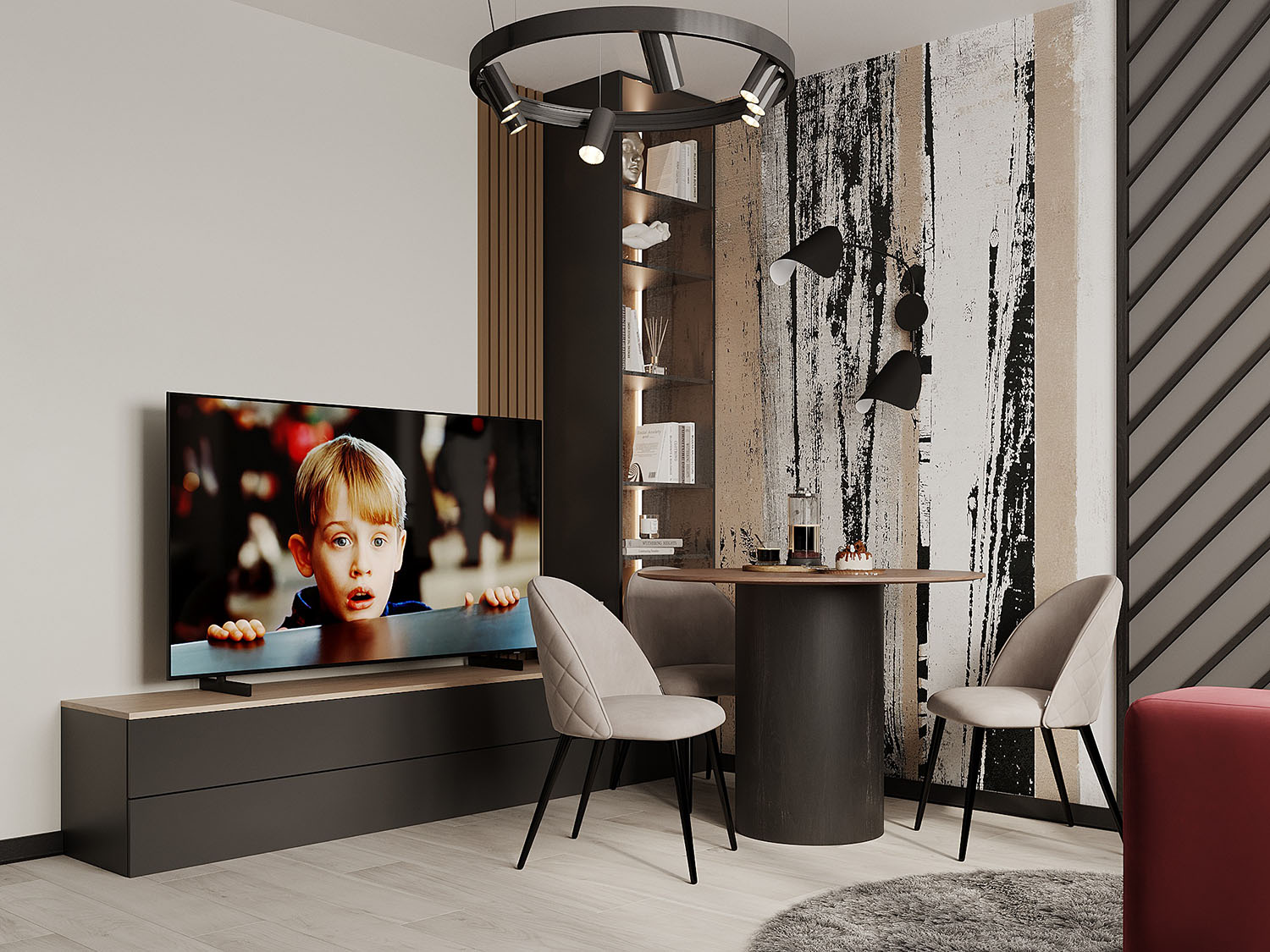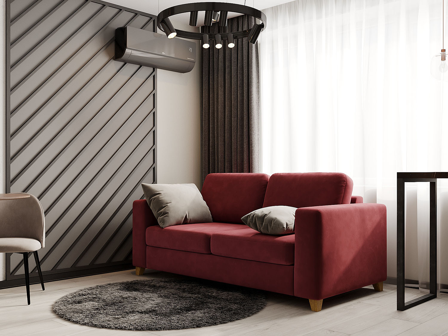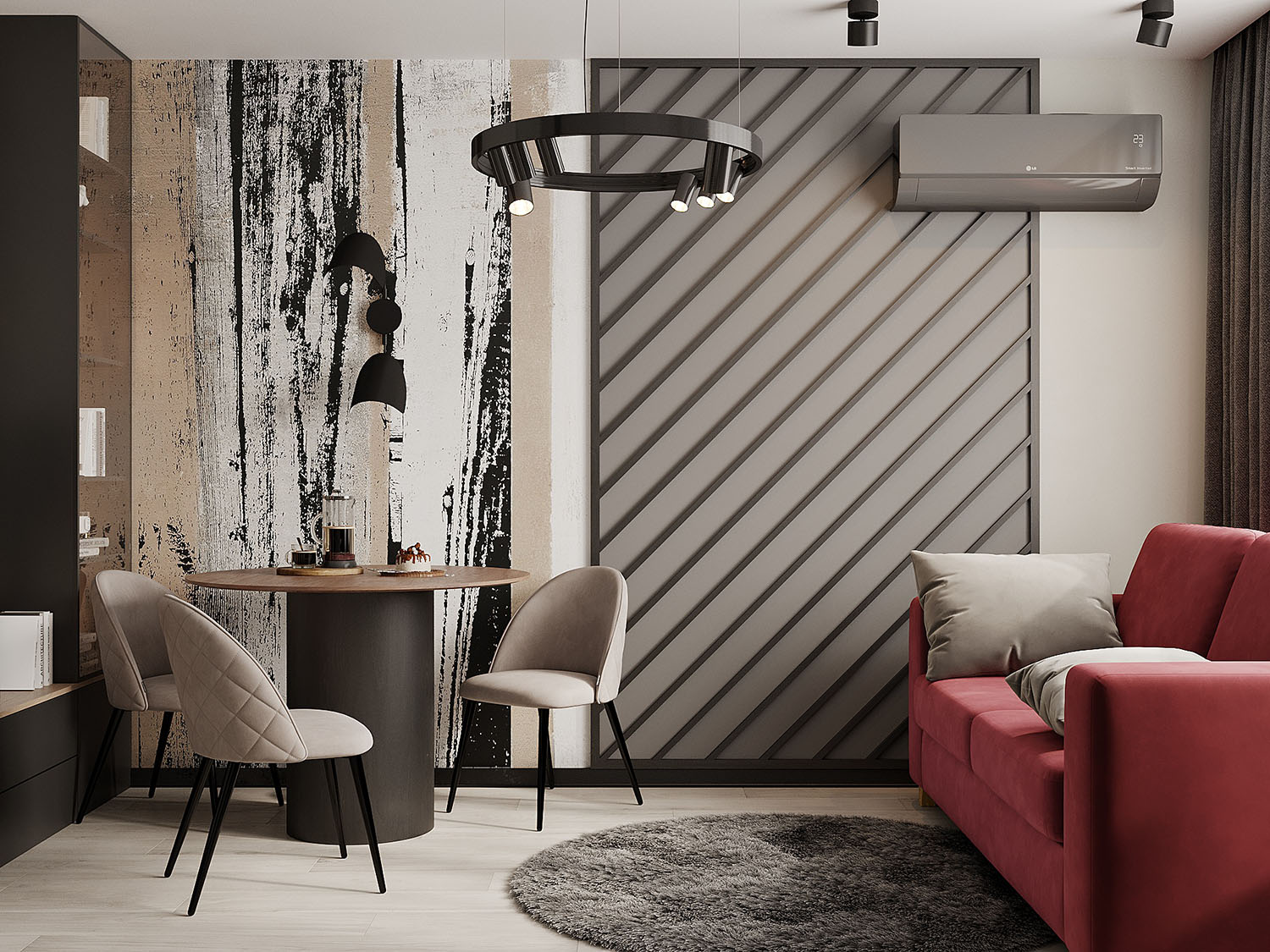 К дизайнеру обратилась семейная пара с запросом создать интерьер, в который можно с легкостью вписать уже купленный красный диван. При этом необходимо было сохранить современность и уют квартиры. Обои из коллекции BERYOZI I VODOPADY отлично вписались в задуманную концепцию интерьера.