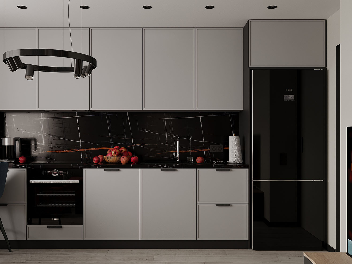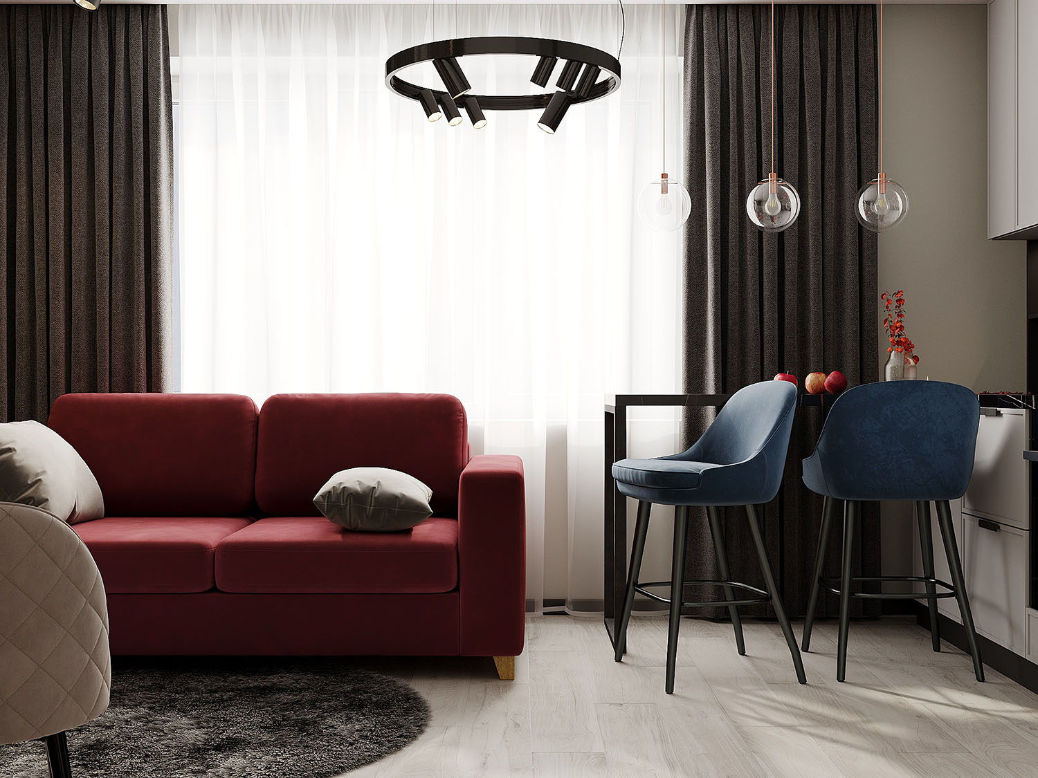 Кухня-гостиная в спокойных тонах с яркими акцентами