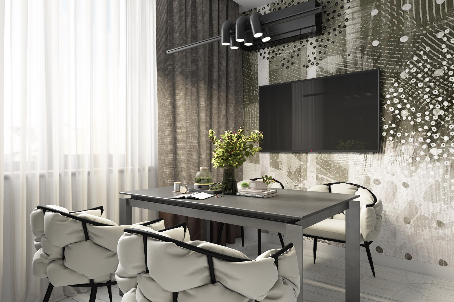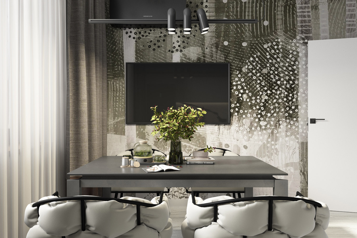 Главным акцентом являются бесшовные обои из коллекции Beryozi I Vodopady. Принт разбавляет сдержанную монохромную гамму, добавляя пространству глубину и яркость.