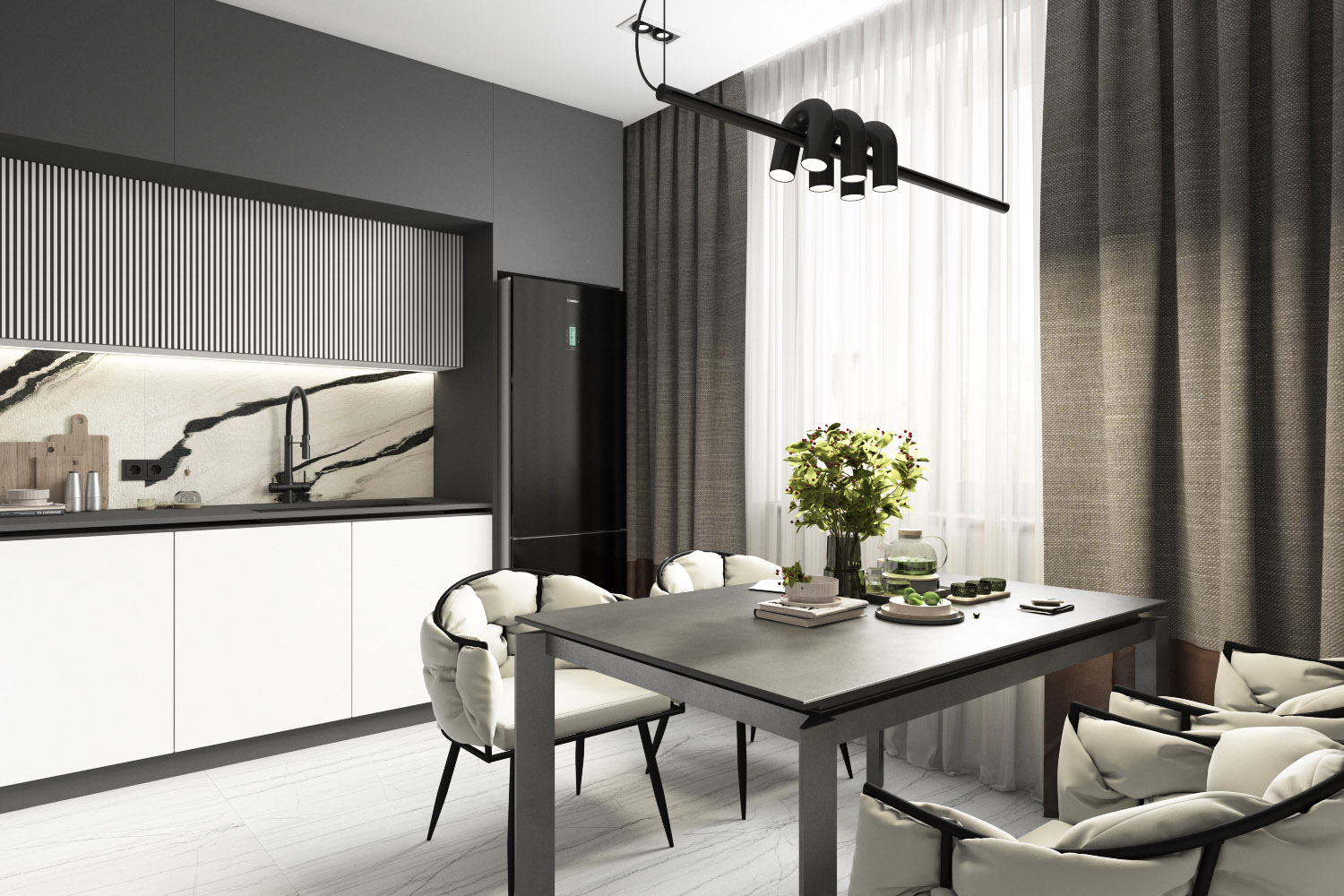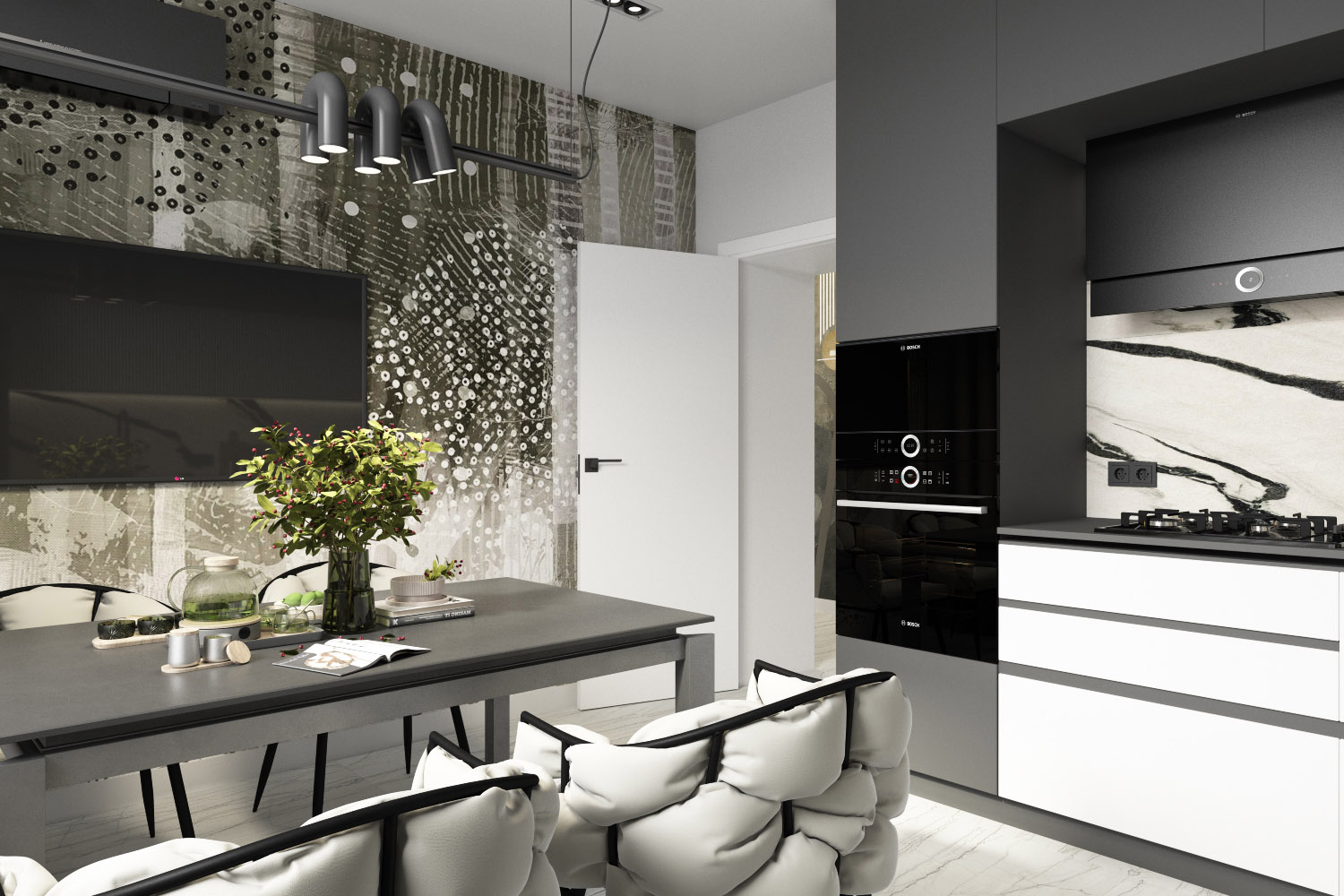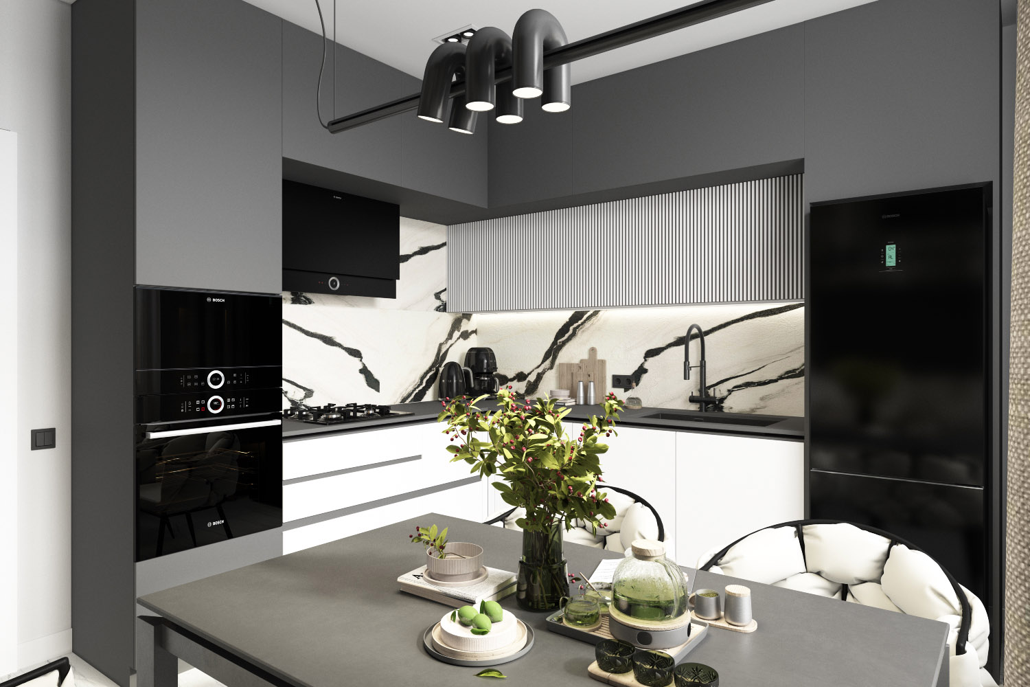 Кухня из проекта жилого дома в г. Волгоград. Площадь помещения — 13,4 м². Интерьер создавался для молодого человека, который ценит минимализм, изысканность, контраст и монохром.