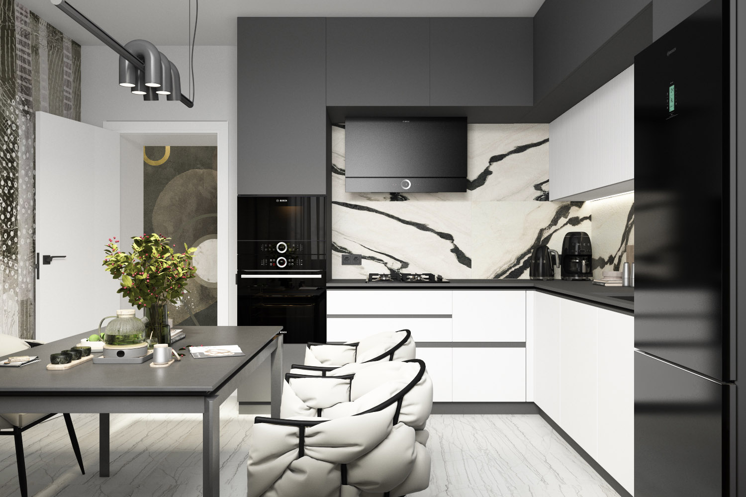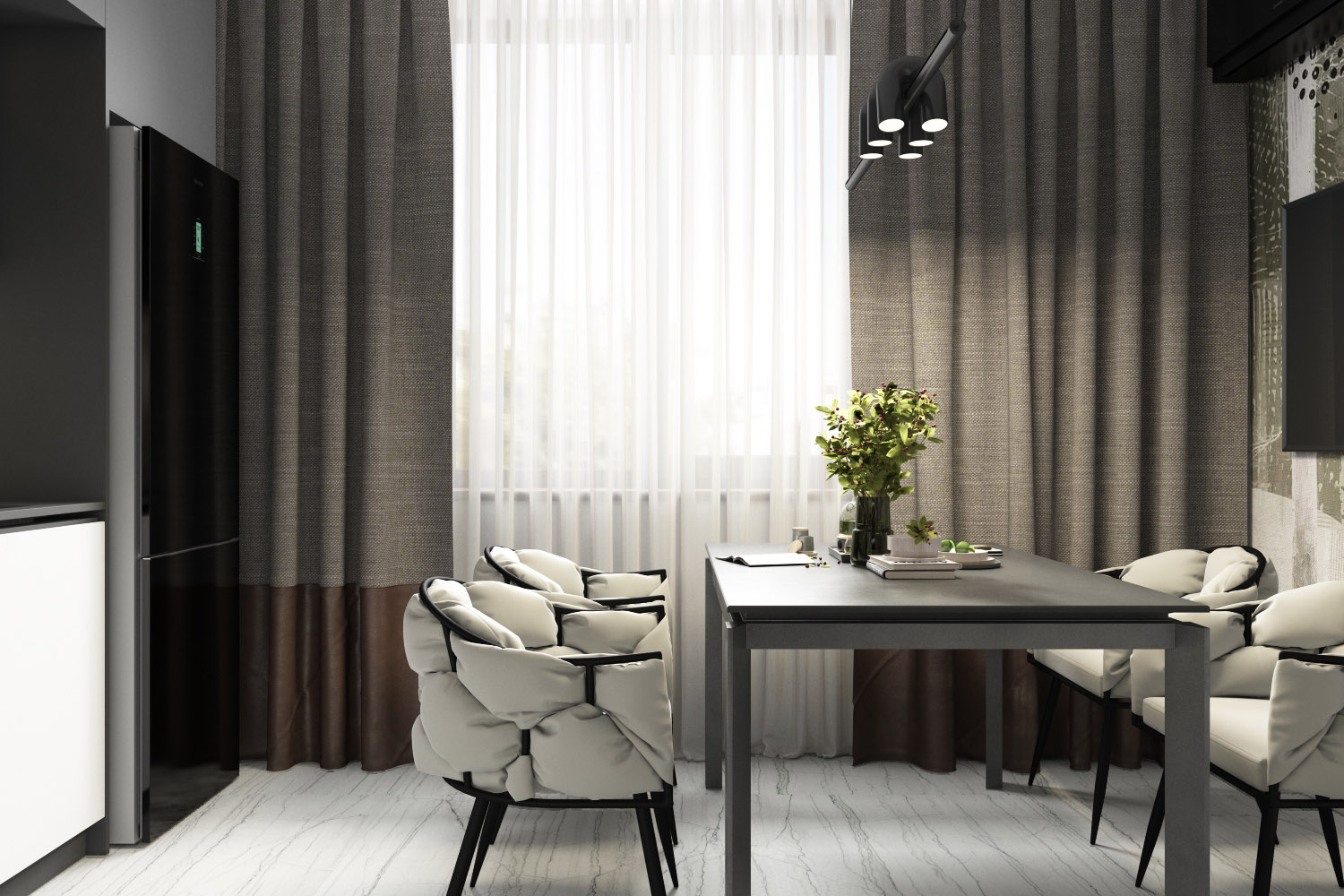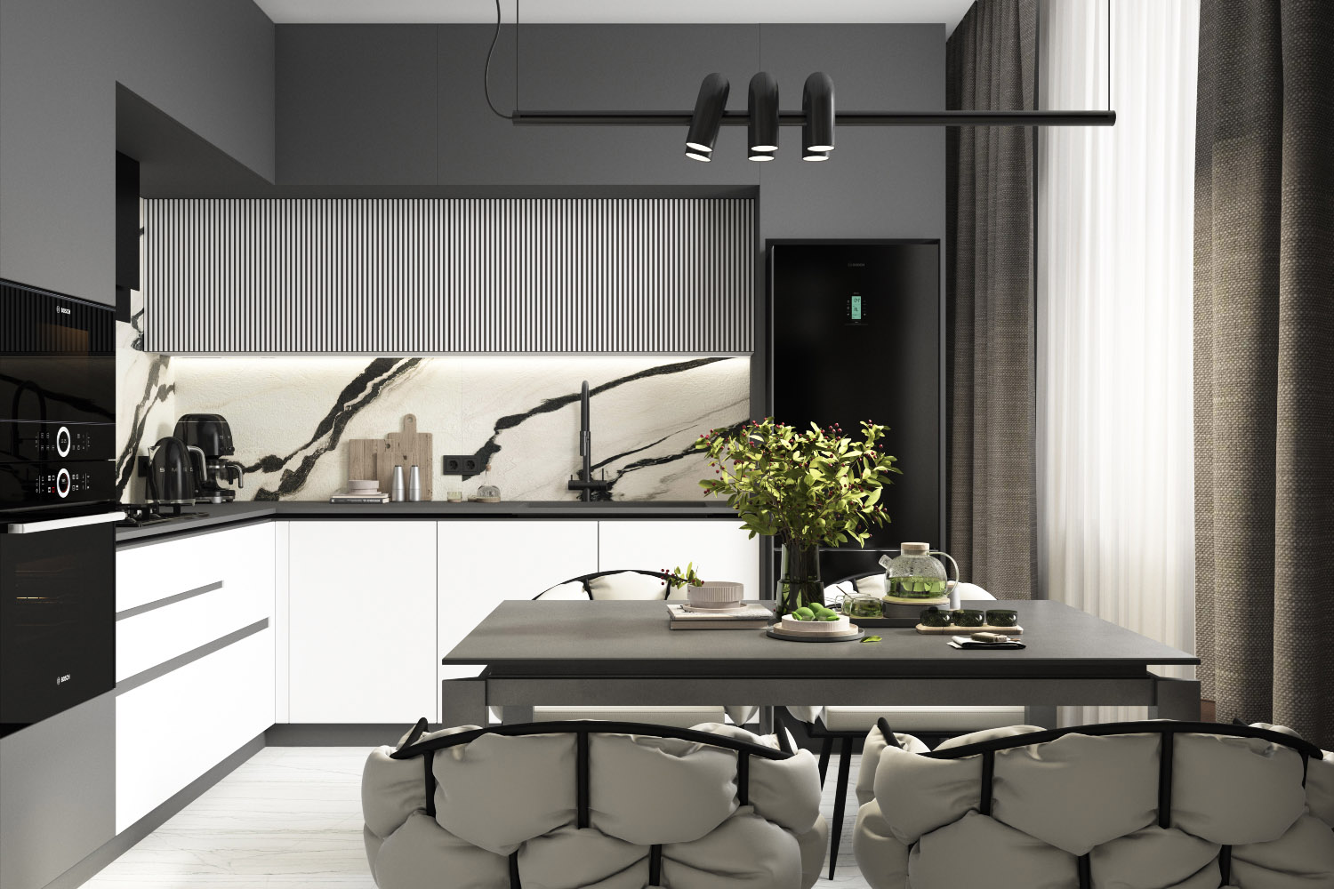 Кухня из проекта жилого дома в г. Волгоград. Площадь помещения — 13,4 м². Интерьер создавался для молодого человека, который ценит минимализм, изысканность, контраст и монохром.
