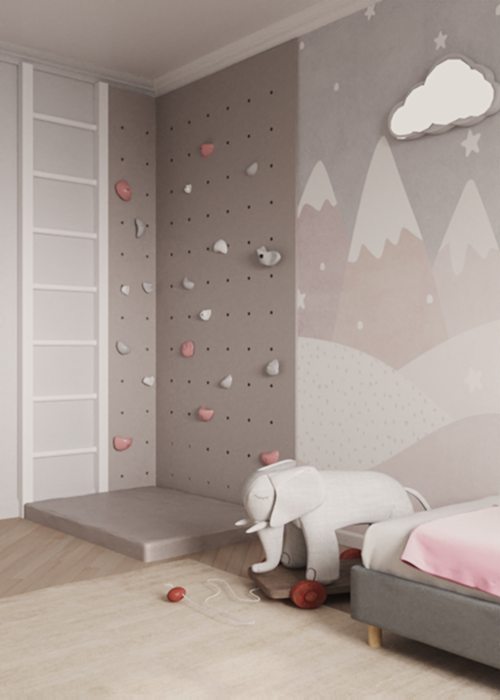 Очаровательная детская комната площадью 14,5 м² для не менее очаровательной девочки 5 лет. Для активного времяпрепровождения маленькой непоседы установлена шведская стенка и скалодром с мягкими стеновыми панелями и матом. А творческий уголок — стол для рисования — со временем будет заменен на уголок школьника.