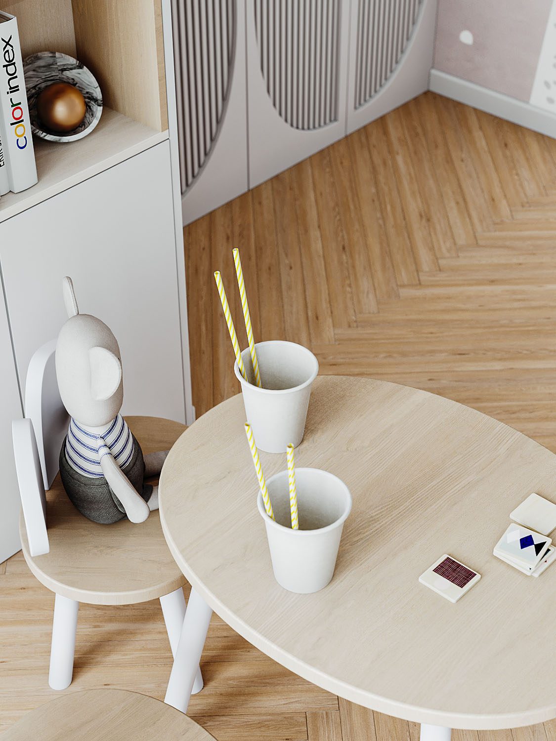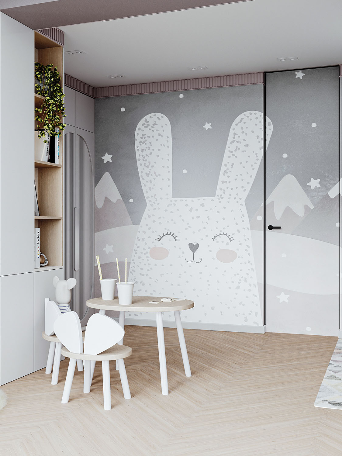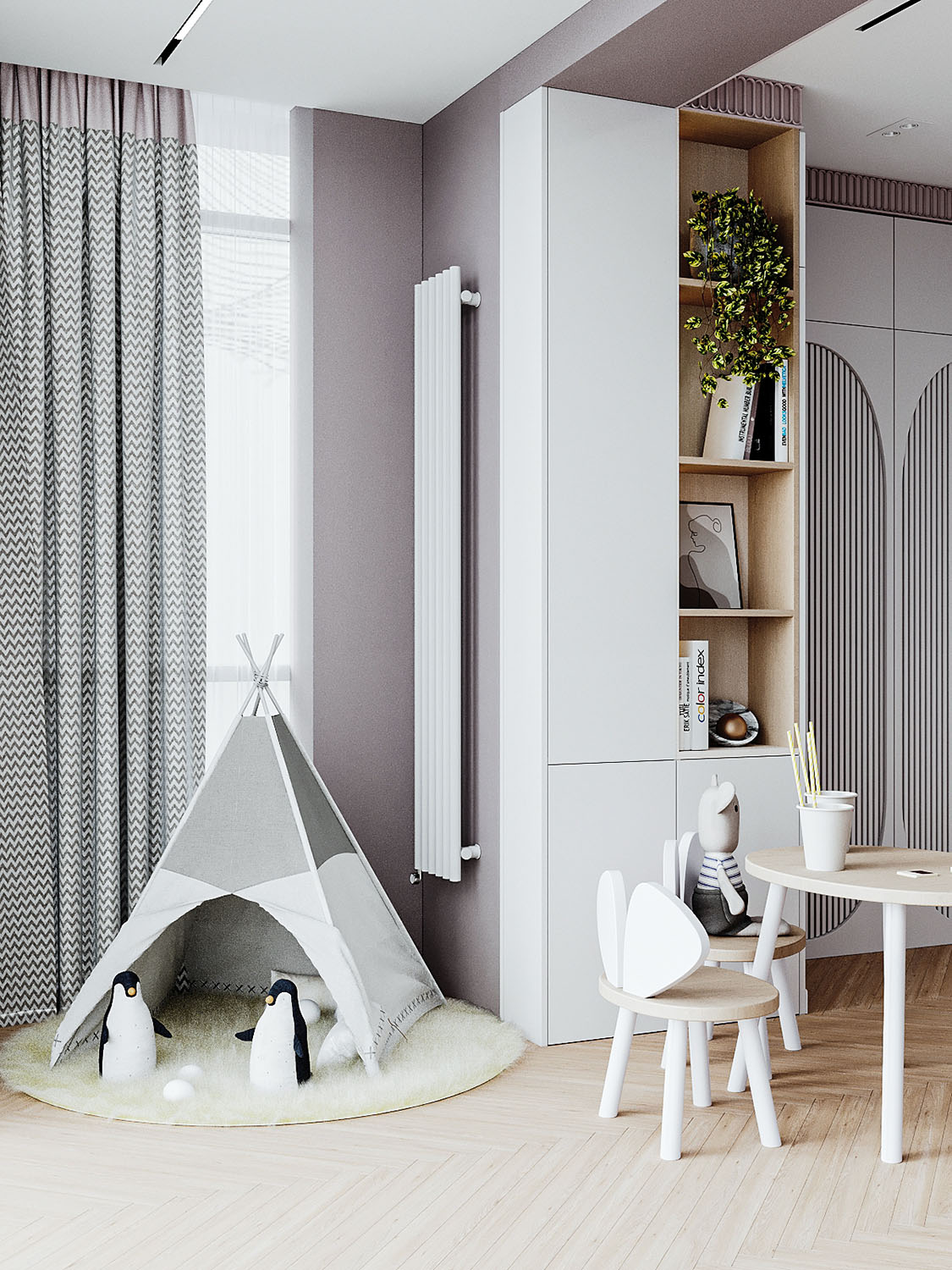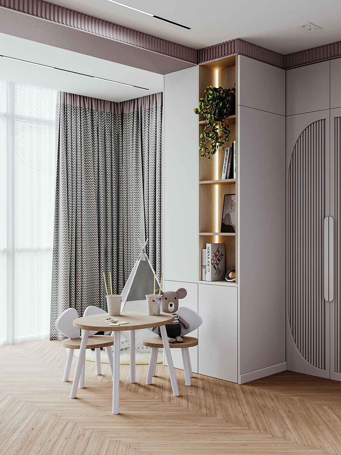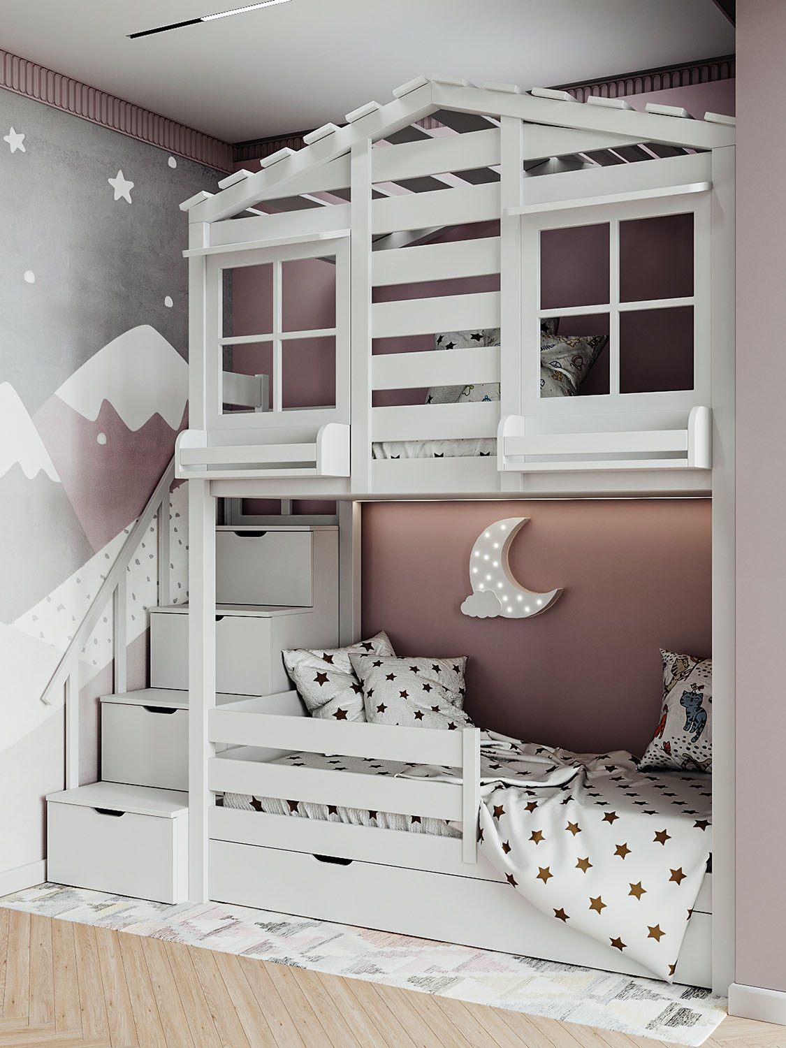 Проект нежной детской комнаты площадью 17,4 м² для девочки 3-7 лет. Здесь дизайнеры старались сделать красивую и волшебную комнату с удобной кроватью, небольшим столиком для игр и творчества, а также парой укромных мест, которые любят все дети: шалаш и второй ярус кровати.