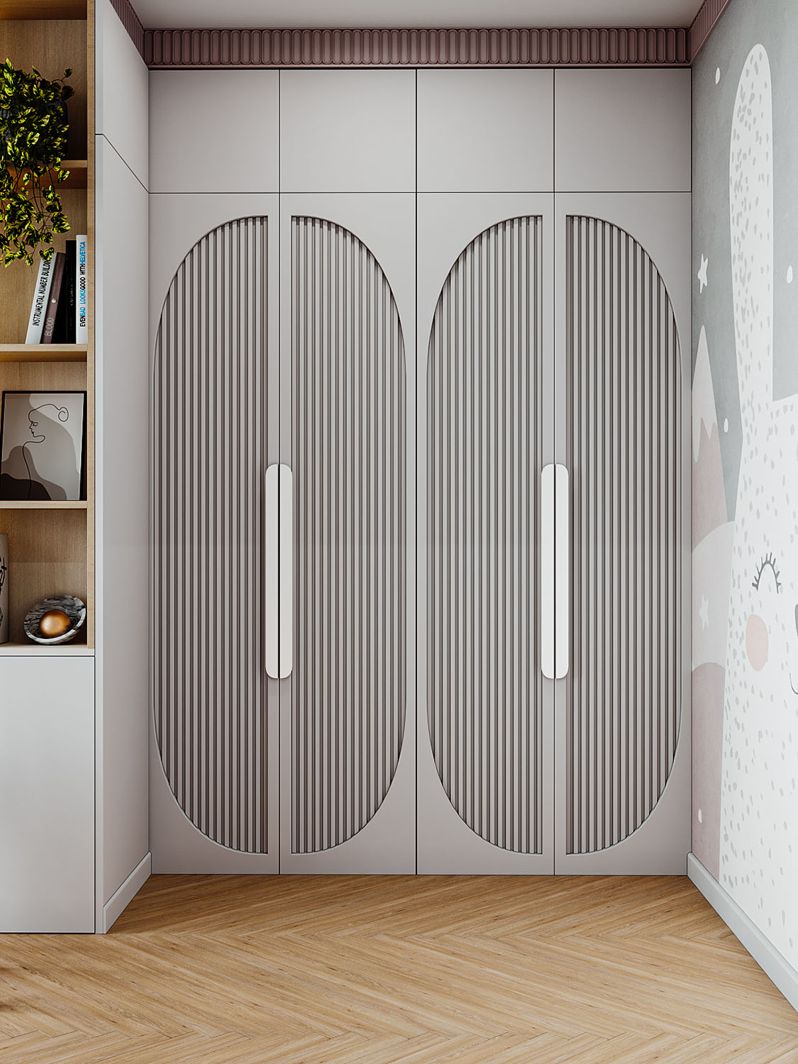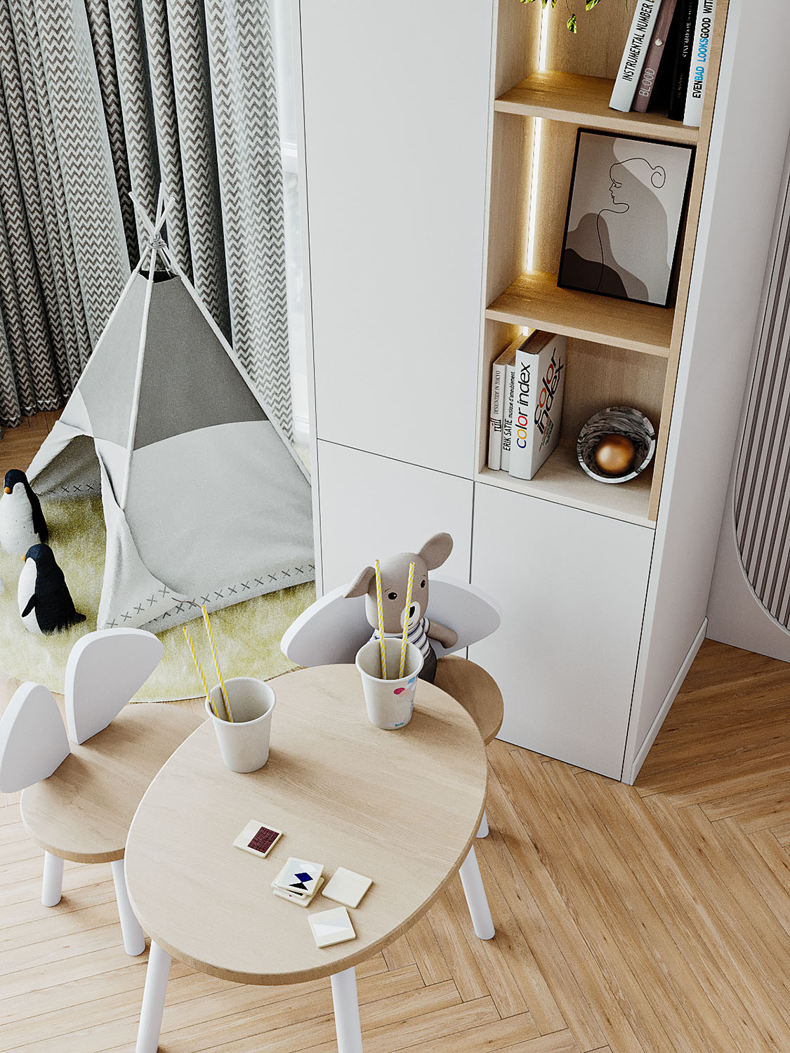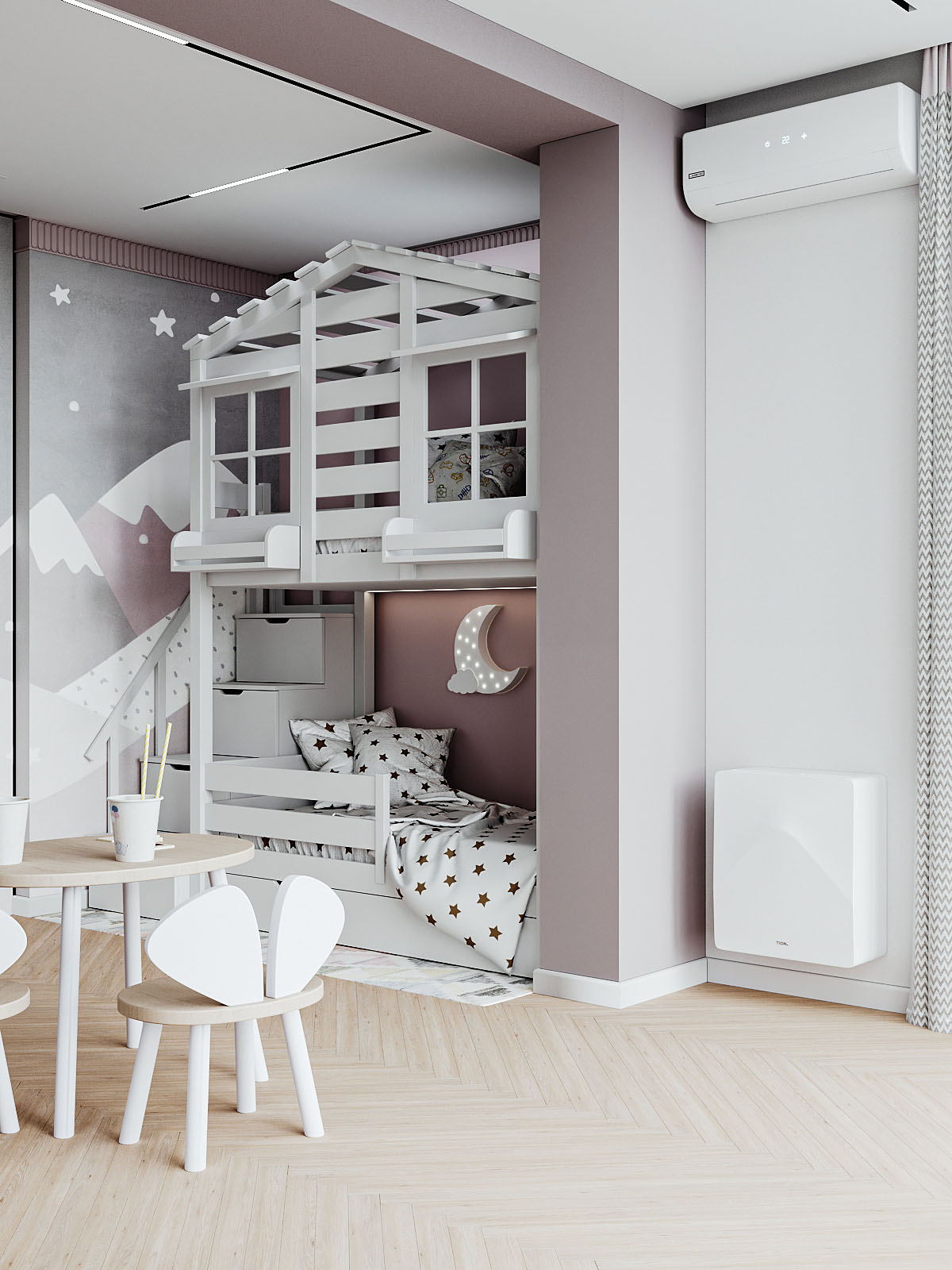 Помимо этого, в комнате предусмотрели просторные места для хранения: шкаф для одежды, вместительная книжная полка и ящики под хранение в ступеньках кровати. В комнате есть кондиционер, бризер для очистки воздуха, трековые системы и небольшая подсветка в книжном шкафу.