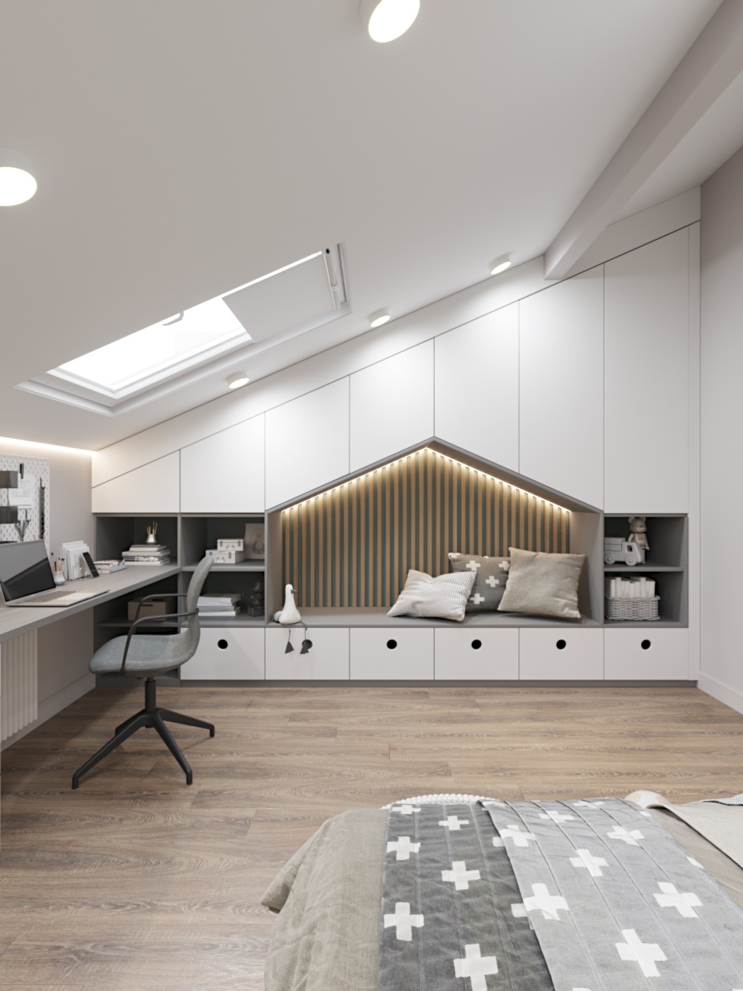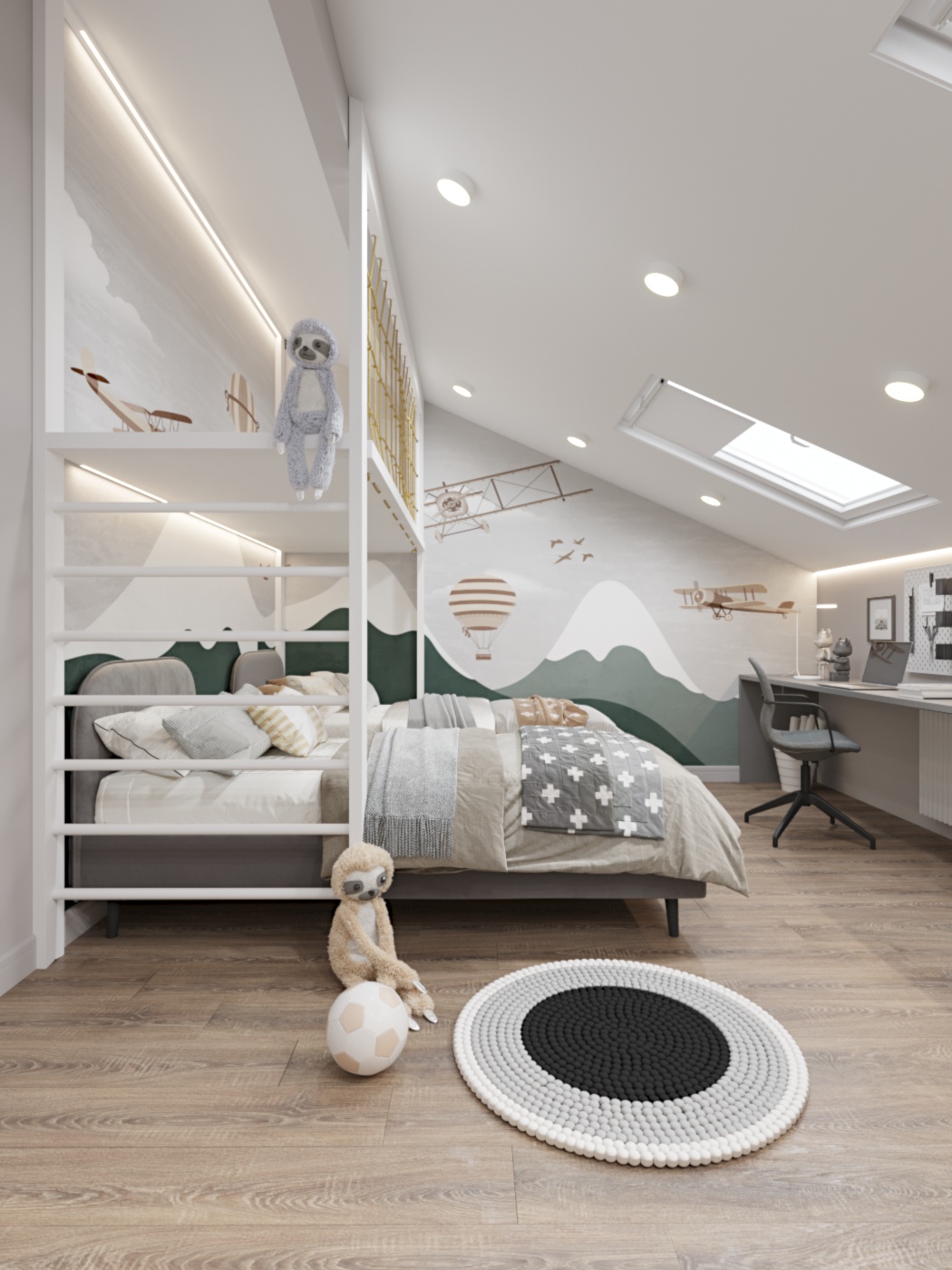 Детская комната площадью 20 м² на мансардном этаже в таунхаусе КП Академия Парк. Комната для двух мальчиков-близнецов. Здесь стояла задача разместить два спальных места, рабочую зону для учебы, хранение, и при этом оставить достаточно пространства для игр и отдыха. Высота потолка в верхней части ската позволила разместить чердак, такой своеобразный «штаб» для игр, заказчики эту идею с радостью поддержали.
