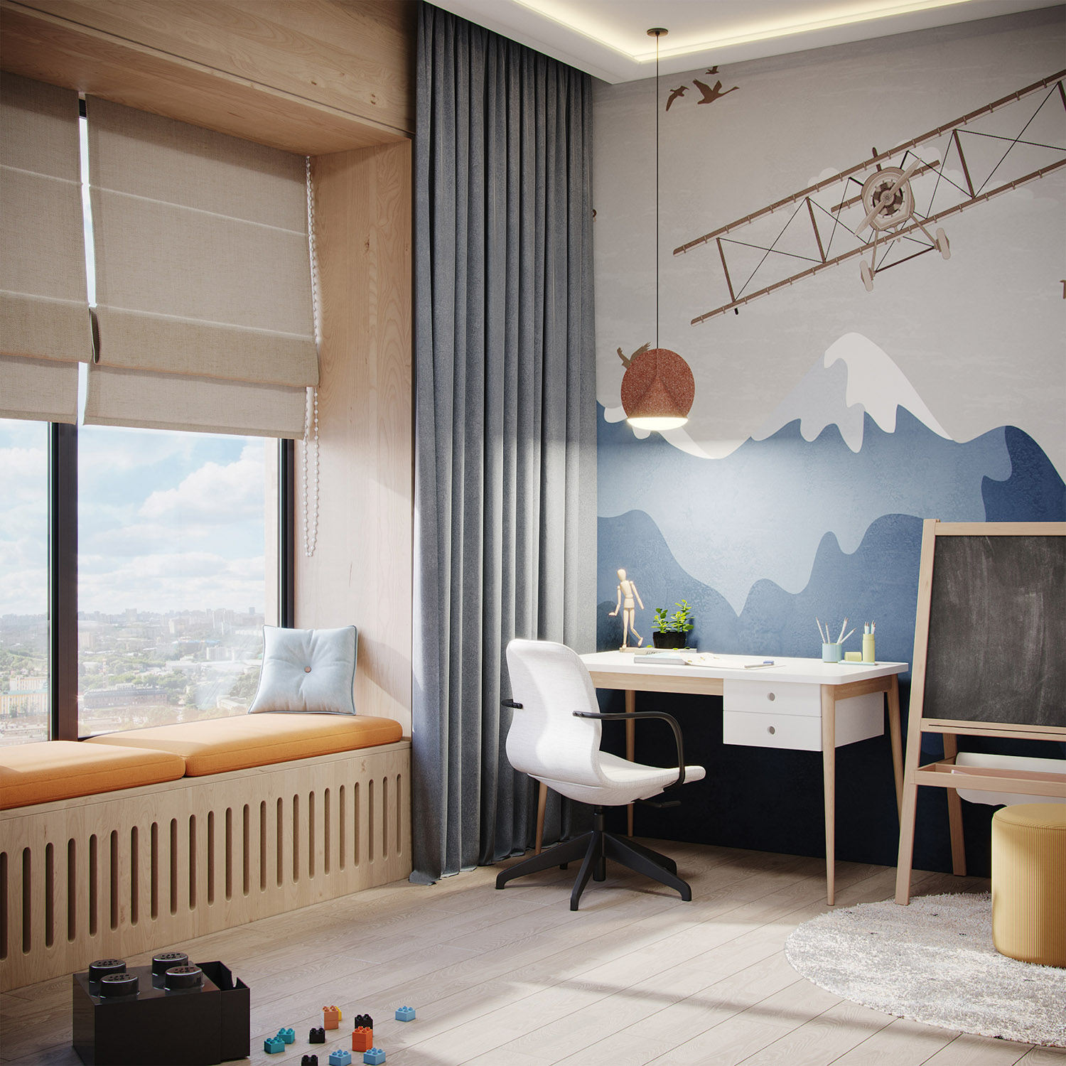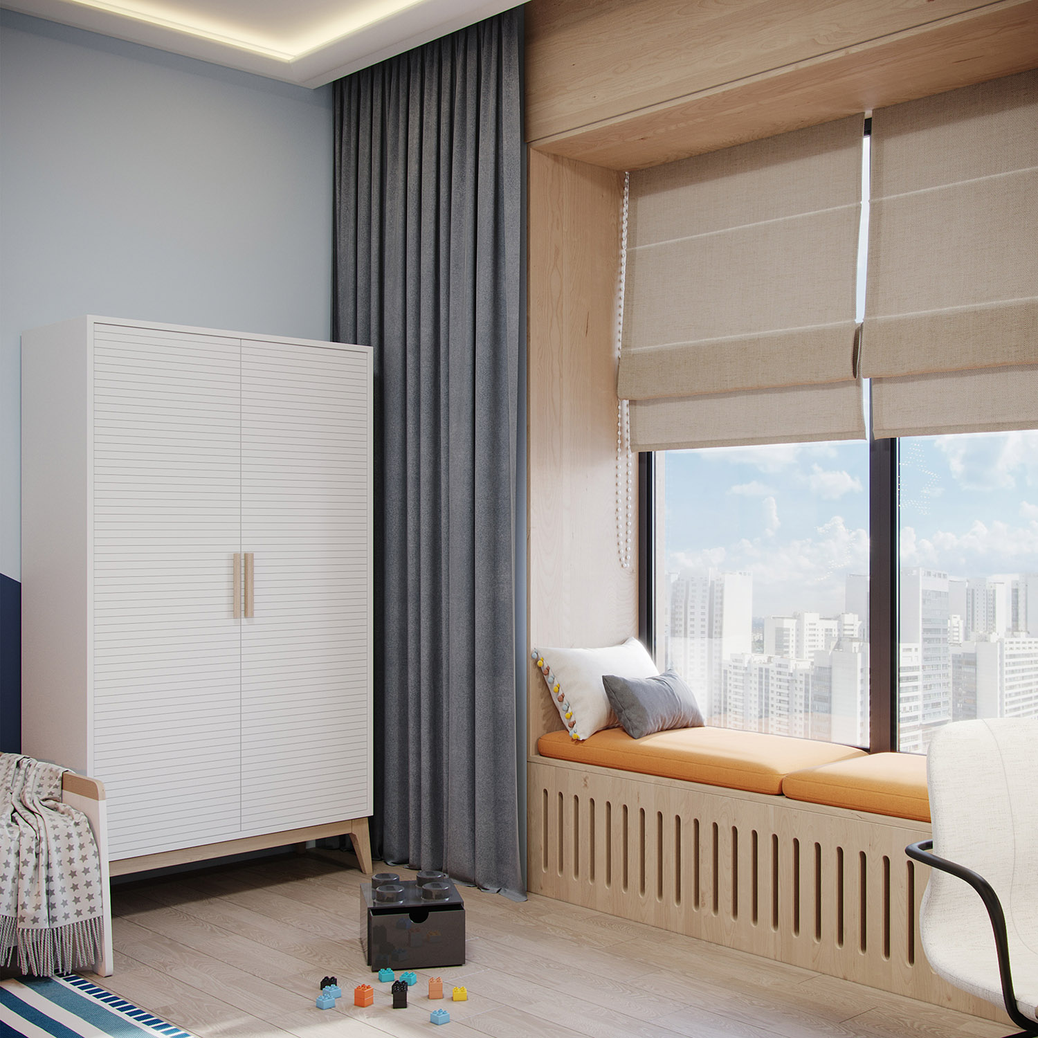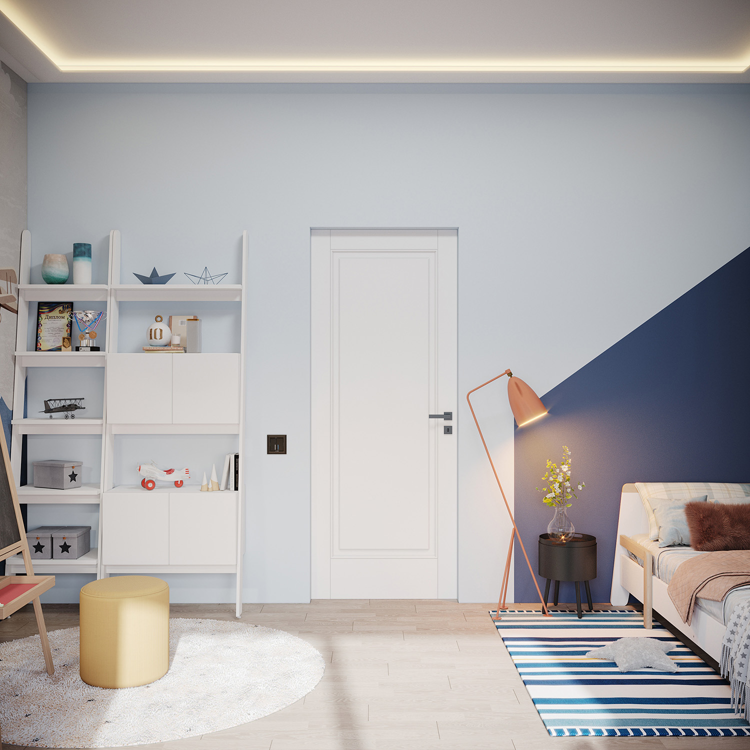Дизайн-проект трехкомнатной квартиры в ЖК Небо создавался для молодой активной семейной пары с ребенком. Мальчику 6 лет. В пожеланиях было создать интерьер в современном стиле с элементами скандинавского, преимущественно в светлых тонах. Мальчик увлекается легоконструированием, авиамоделированием и рисованием. Любит синий цвет, что и послужило отправной точкой в выборе настенных обоев для детской комнаты.