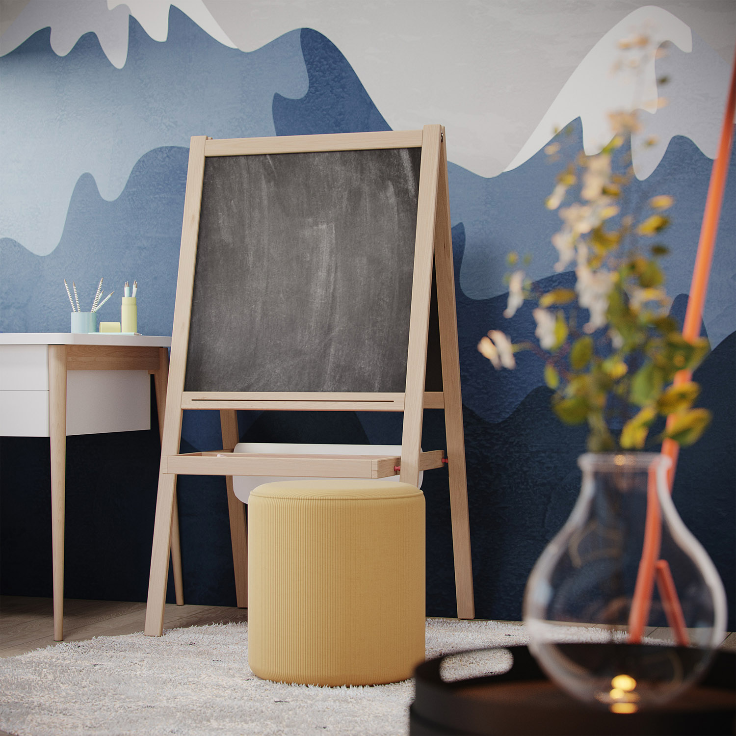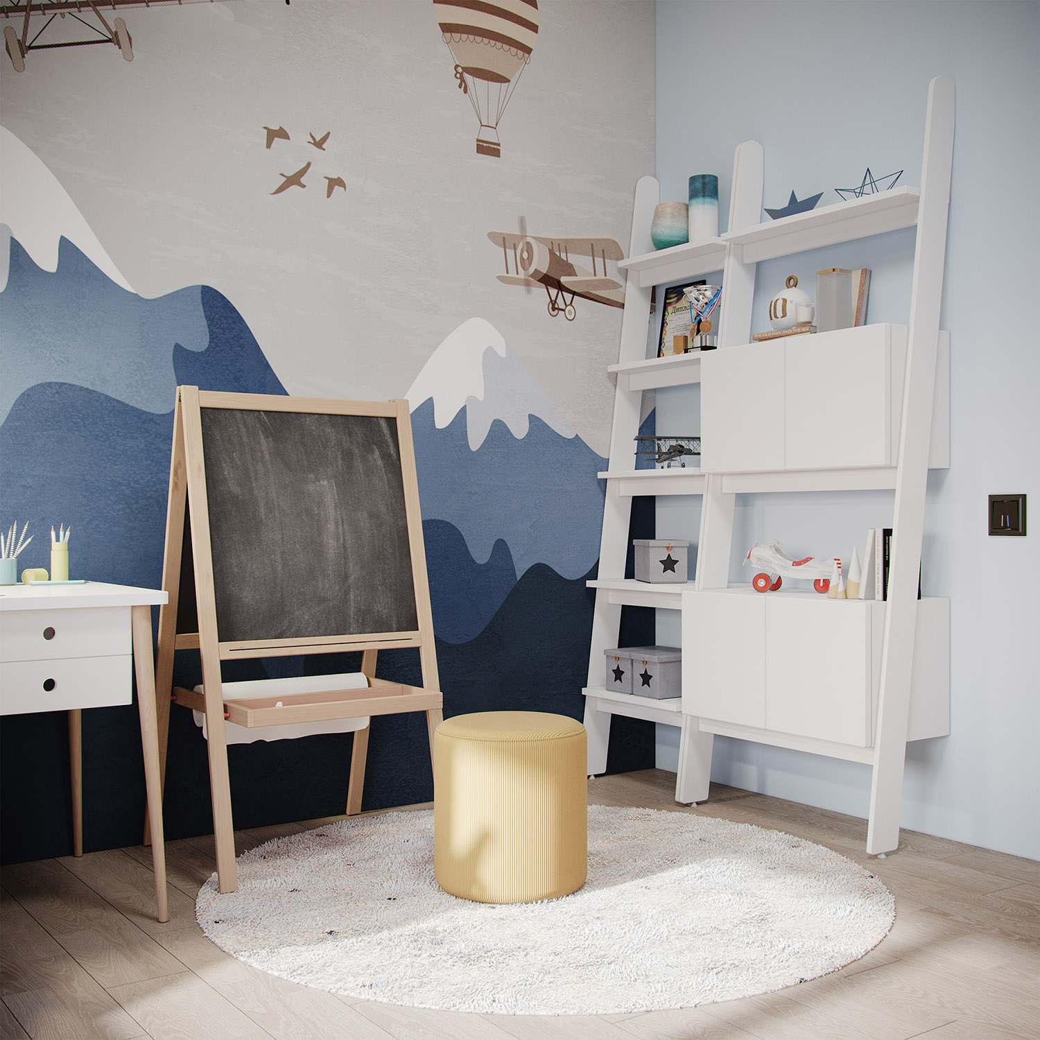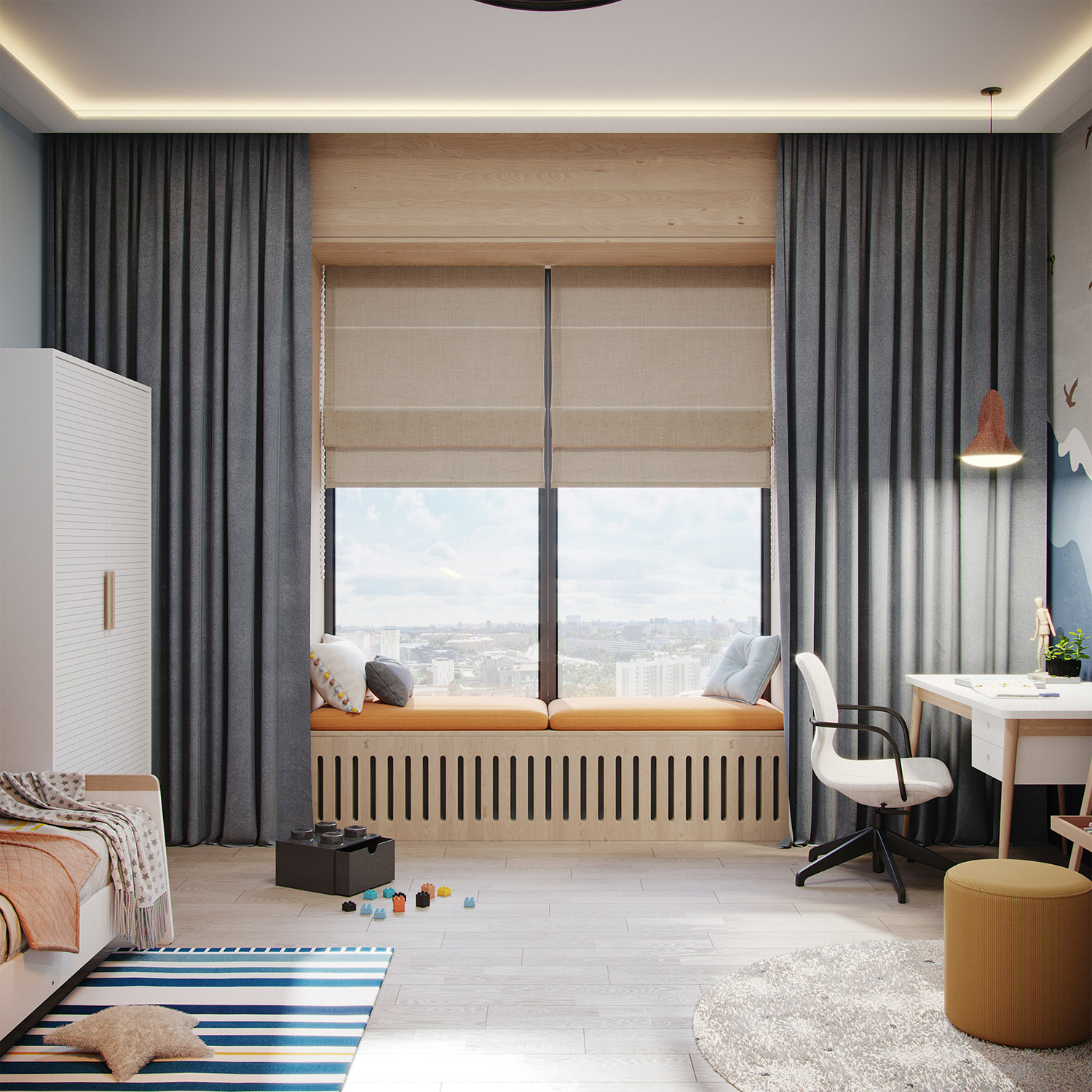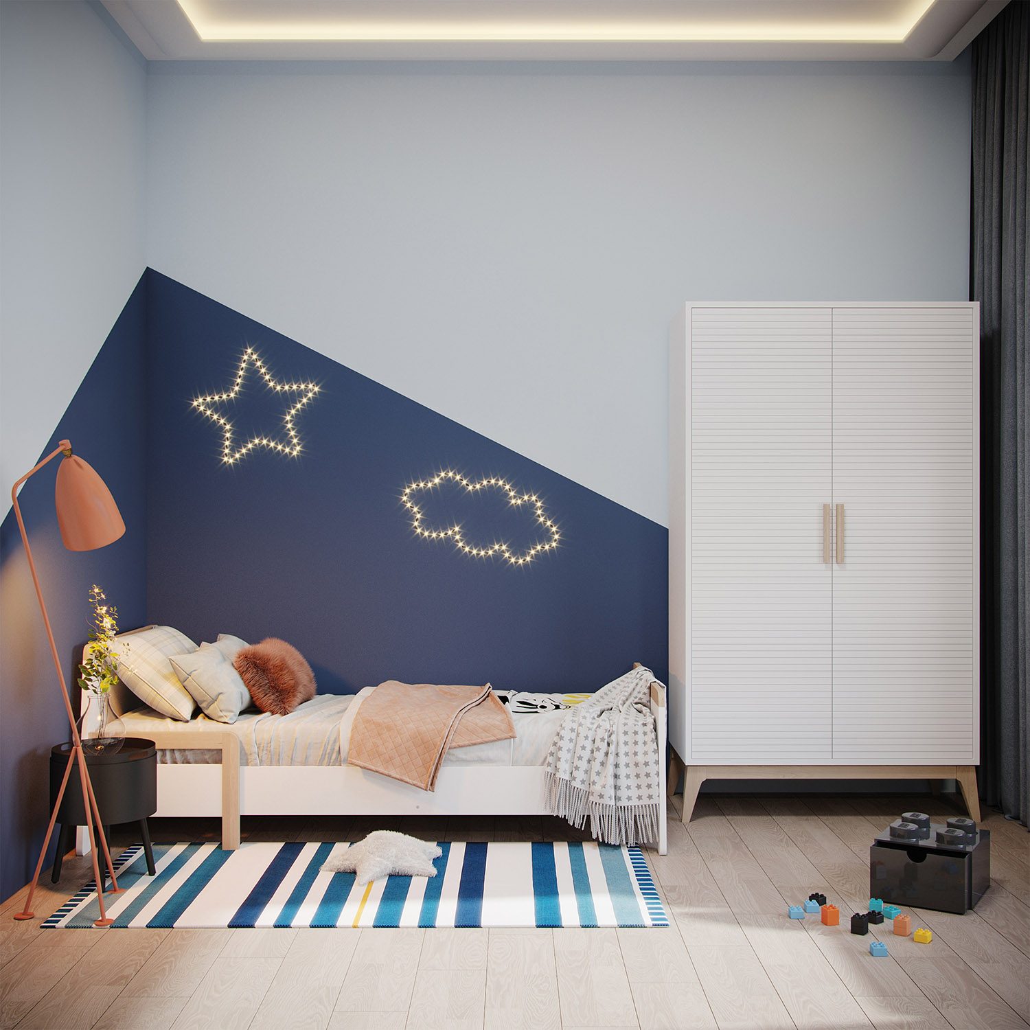 Дизайн-проект трехкомнатной квартиры в ЖК Небо создавался для молодой активной семейной пары с ребенком. Мальчику 6 лет. В пожеланиях было создать интерьер в современном стиле с элементами скандинавского, преимущественно в светлых тонах. Мальчик увлекается легоконструированием, авиамоделированием и рисованием. Любит синий цвет, что и послужило отправной точкой в выборе настенных обоев для детской комнаты.