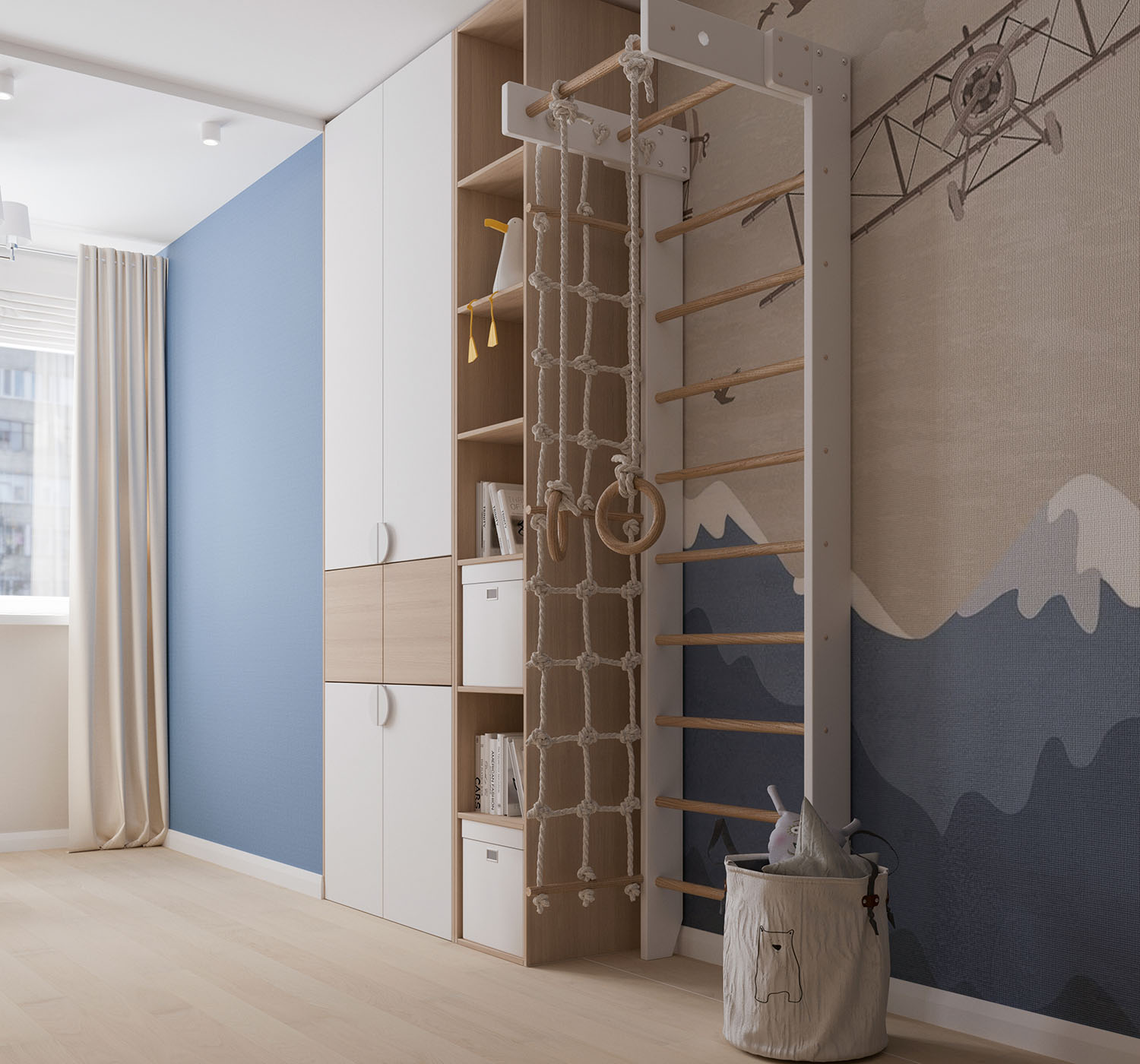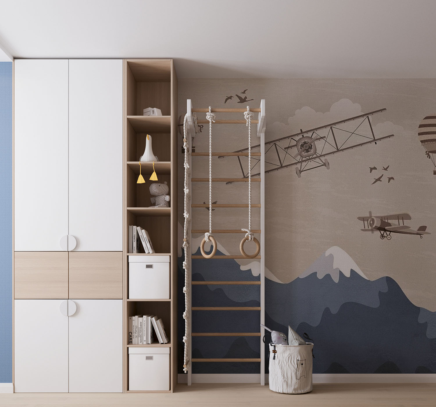 Проект детской комнаты для мальчика, который очень любит самолеты, г. Йошкар-Ола. Обои из коллекции BIG LITTLE. Сказочные вершины принтов Big Little перенесут маленького хозяина комнаты в далекие страны и познакомят с чудесными персонажами — лисичками и мишками, зайчиками и котиками — благодаря красочному «мультяшному» стилю. Изображение гор не только увеличивает пространство, делает комнату выше, но и влияет на подсознание. Если ребенок уже ходит в школу, горы будут стимулировать ее к хорошей учебе и достижению успехов.