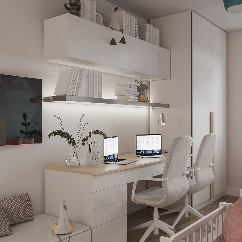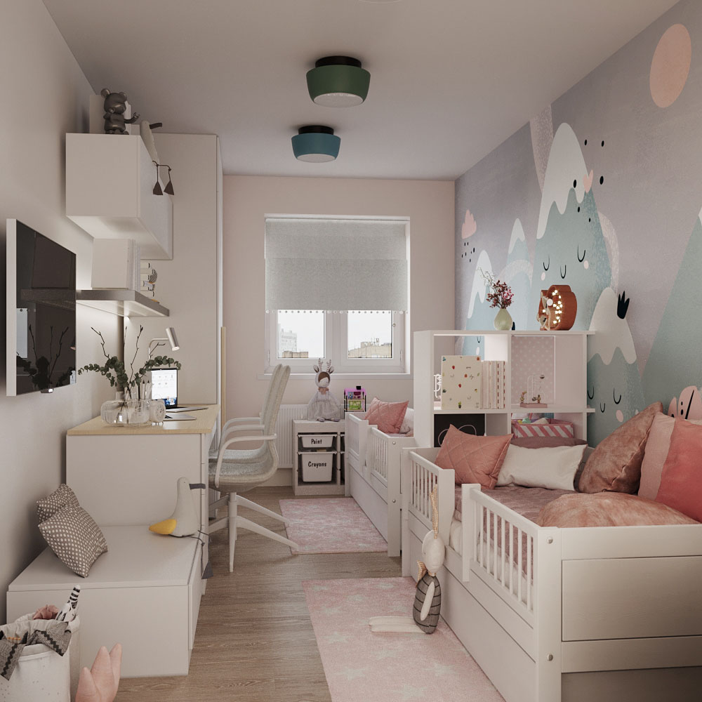 Проект детской комнаты для молодой семьи, г. Иваново. Обои из коллекции BIG LITTLE. Сказочные вершины принтов Big Little перенесут маленького хозяина комнаты в далекие страны и познакомят с чудесными персонажами — лисичками и мишками, зайчиками и котиками — благодаря красочному «мультяшному» стилю. Изображение гор не только увеличивает пространство, делает комнату выше, но и влияет на подсознание. Если ребенок уже ходит в школу, горы будут стимулировать ее к хорошей учебе и достижению успехов.