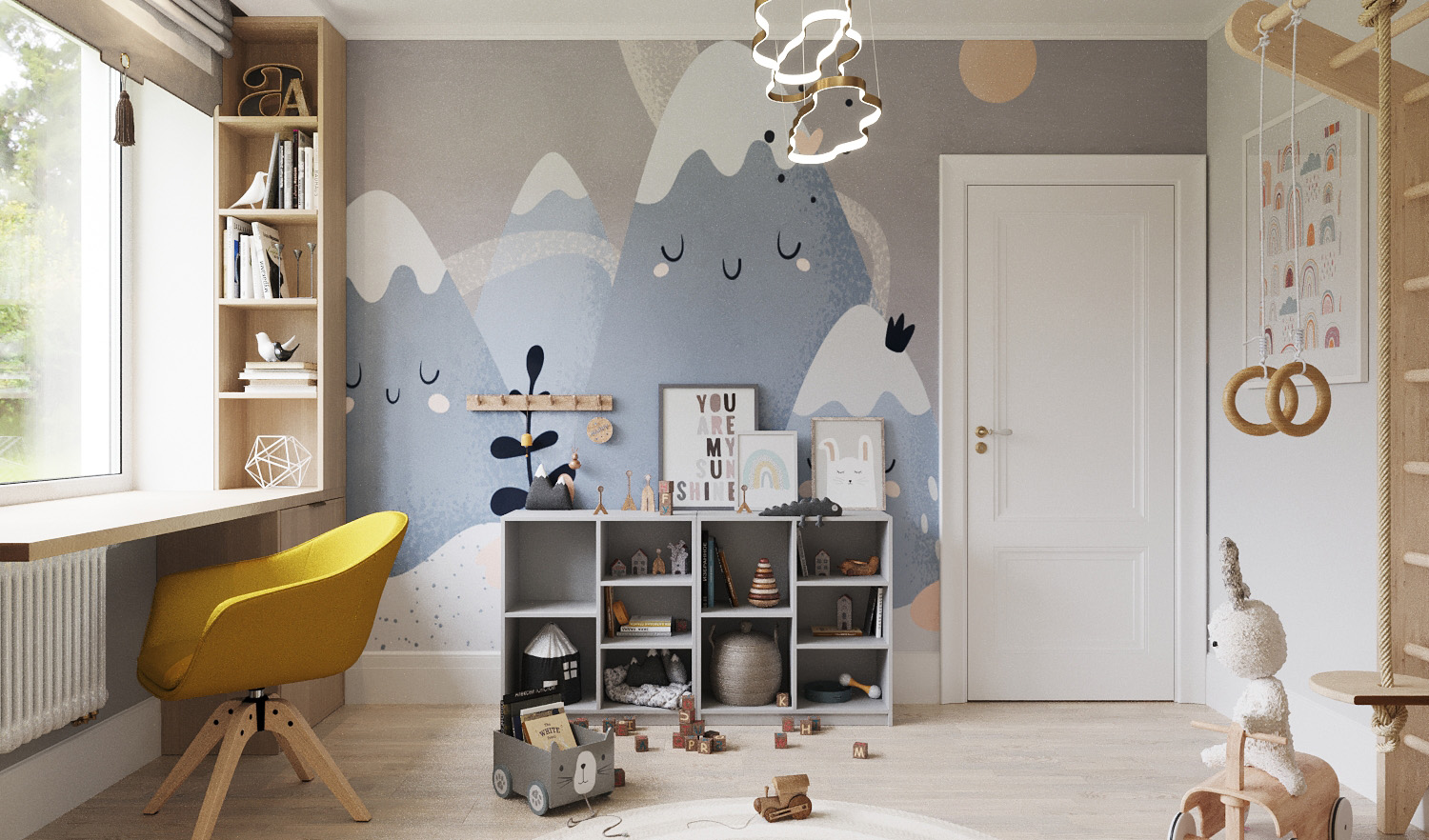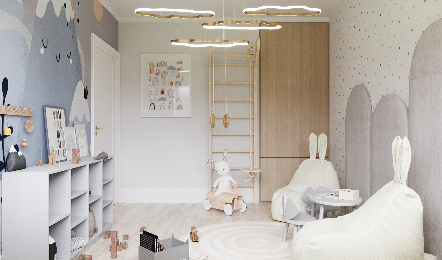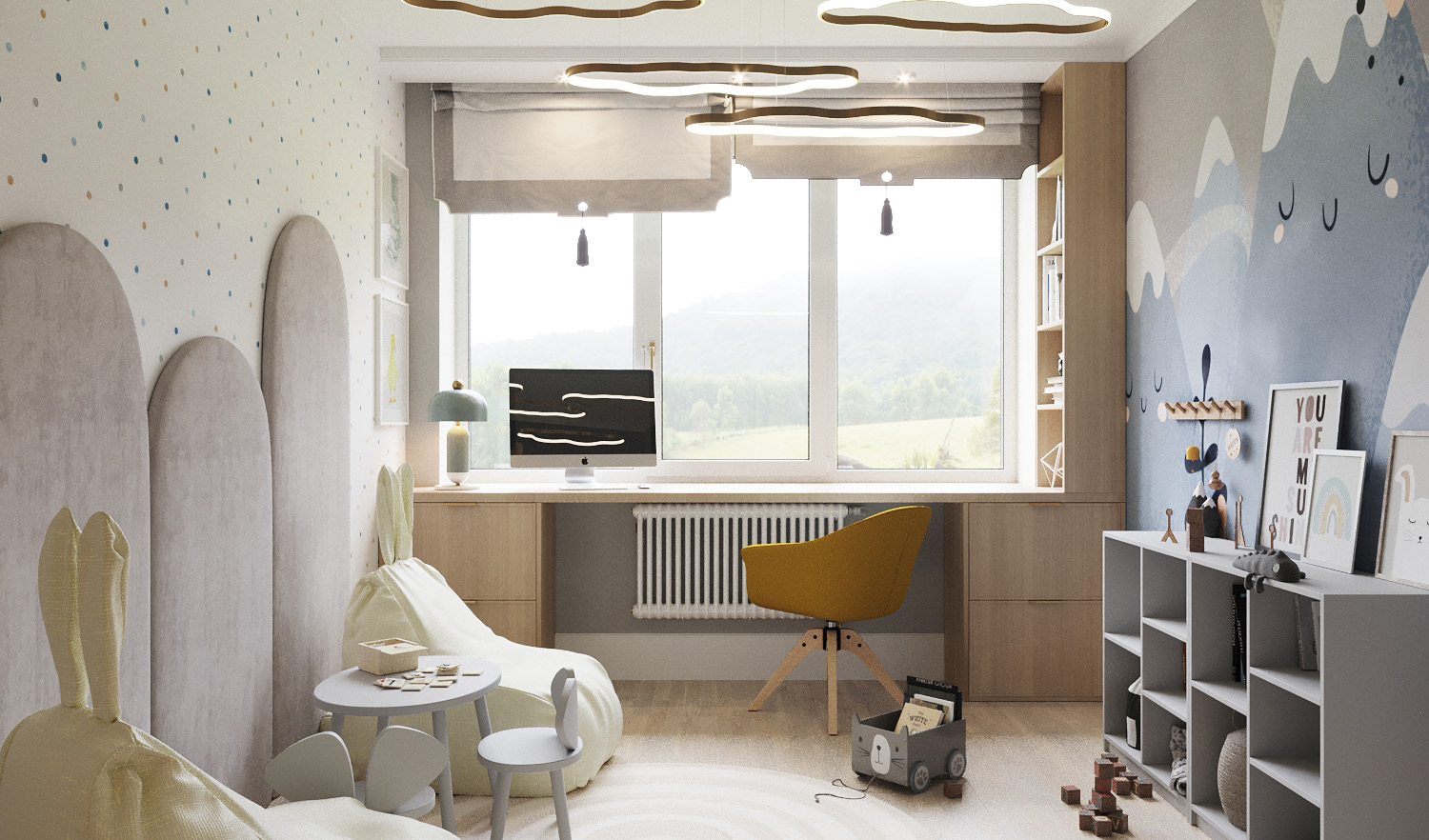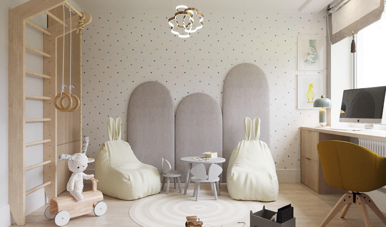 Игровая комната площадью 12 м² из проекта «Коттедж в саду». Загородный дом находится в Тульской области. Дизайнеры постарались сделать эту игровую комнату очень уютной, предусмотрев также при этом комфортную зону для творчества и учебы.